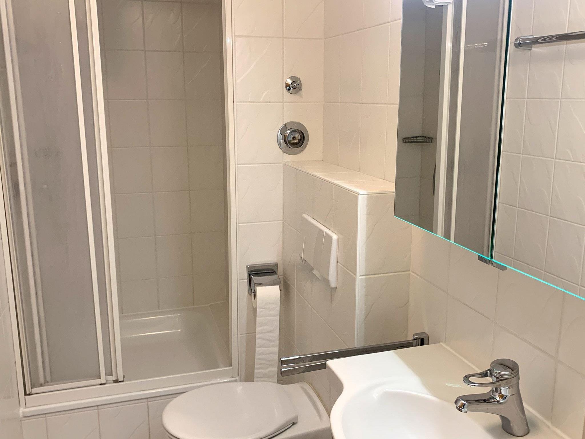 Bad: Dusche, Waschtisch, WC, Duschkabine, Spiegelschrank, Schrank