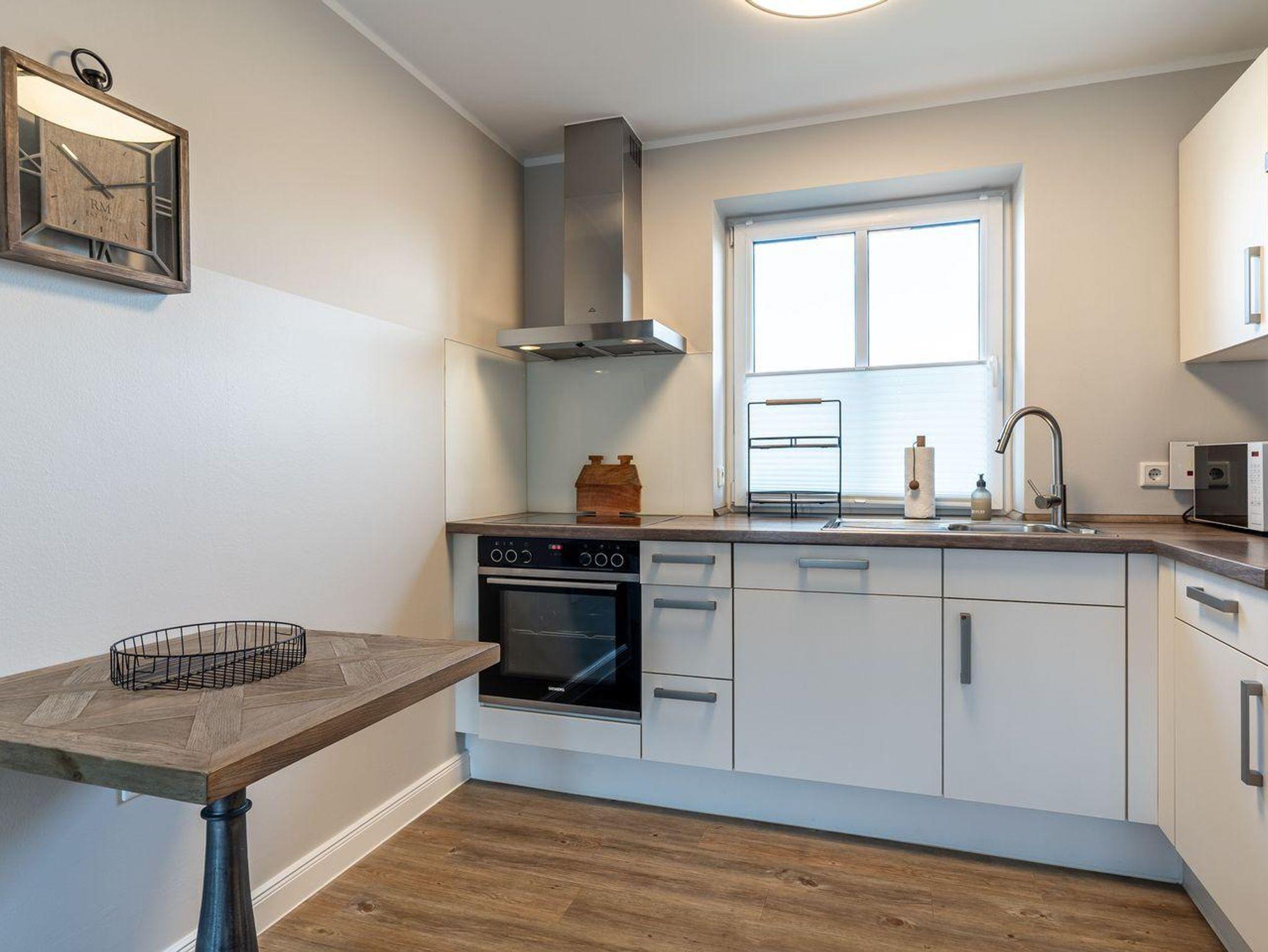 Diese moderne und stilvoll eingerichtete Wohnung bietet auf 60 m² genügend Platz für bis zu drei Personen. Der offene Wohnbereich verbindet Küche und Wohnzimmer harmonisch und ist der perfekte Ort, um sich nach einem erlebnisreichen Tag zu entspannen. Genießen Sie die Zeit bei einem gemütlichen Abendessen, das Sie in der voll ausgestatteten Küche zubereiten können. Hier stehen Ihnen moderne Geräte wie ein Cerankochfeld, Backofen, Kühlschrank mit Gefrierfach, Geschirrspüler, sowie kleine Küchengeräte wie Wasserkocher und Kaffeemaschine zur Verfügung.
