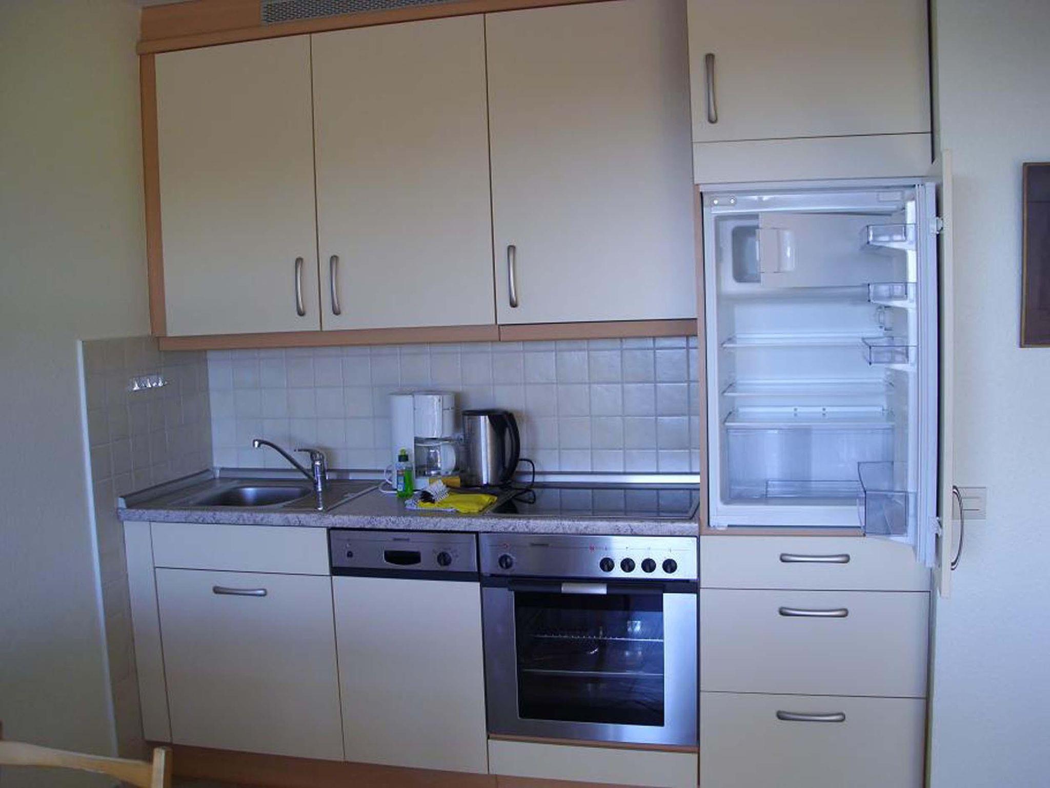 Schlafraum mit 2 Einzelbetten, Wohn-Schlafraum mit 2 Wandschrankbetten, Laminatfußboden, Sitzecke, Essecke, Küchenzeile mit Geschirrspüler und Backofen, Dusche/WC, Durchwahltelefon, Kabel-TV, Balkon, PKW-Platz Nr.56, Aufzug, Fahrradkeller.