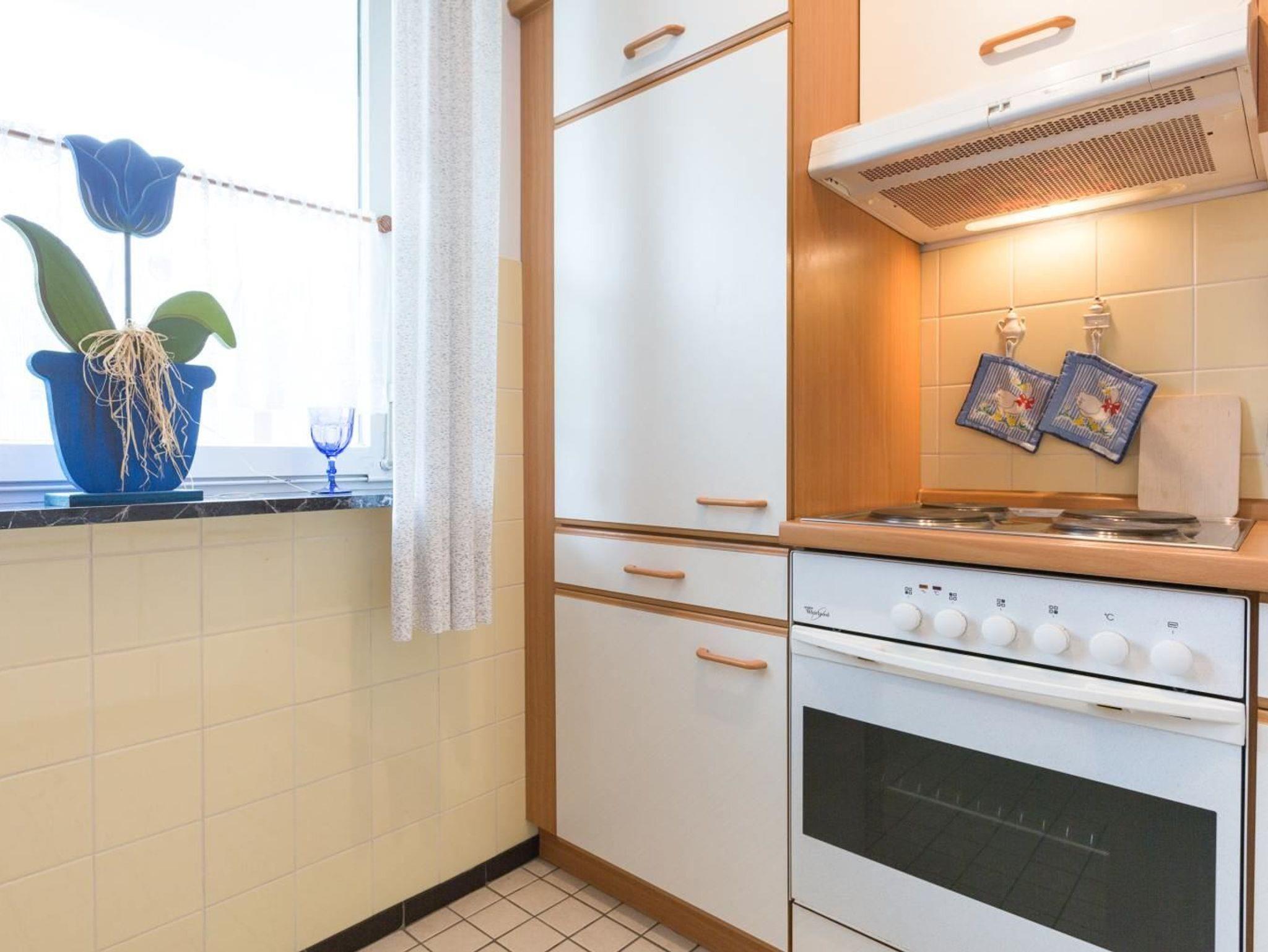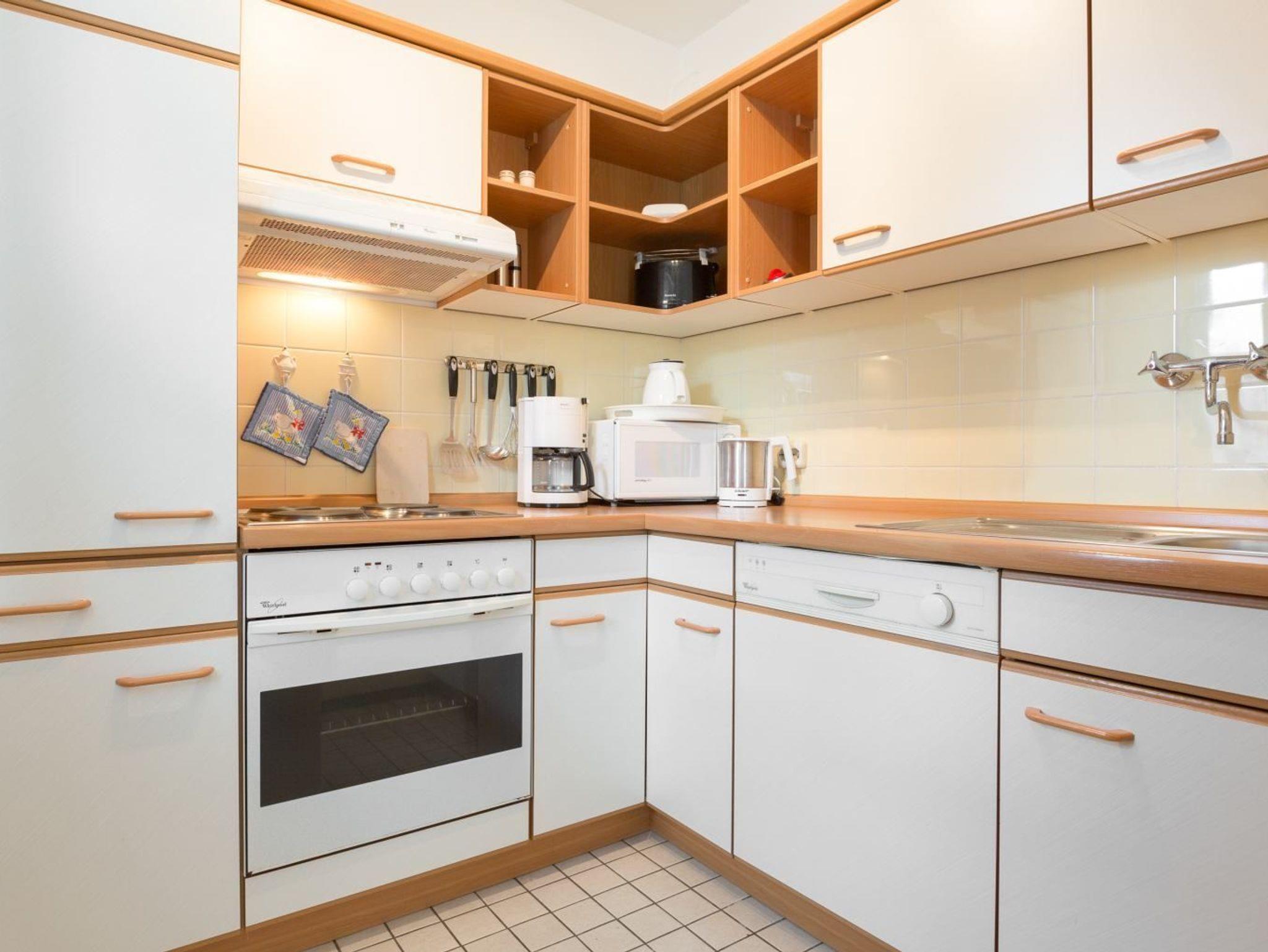 Separate Küche mit Backofen, Mikrowelle, Kühlschrank mit Gefrierfach und Geschirrspüler.