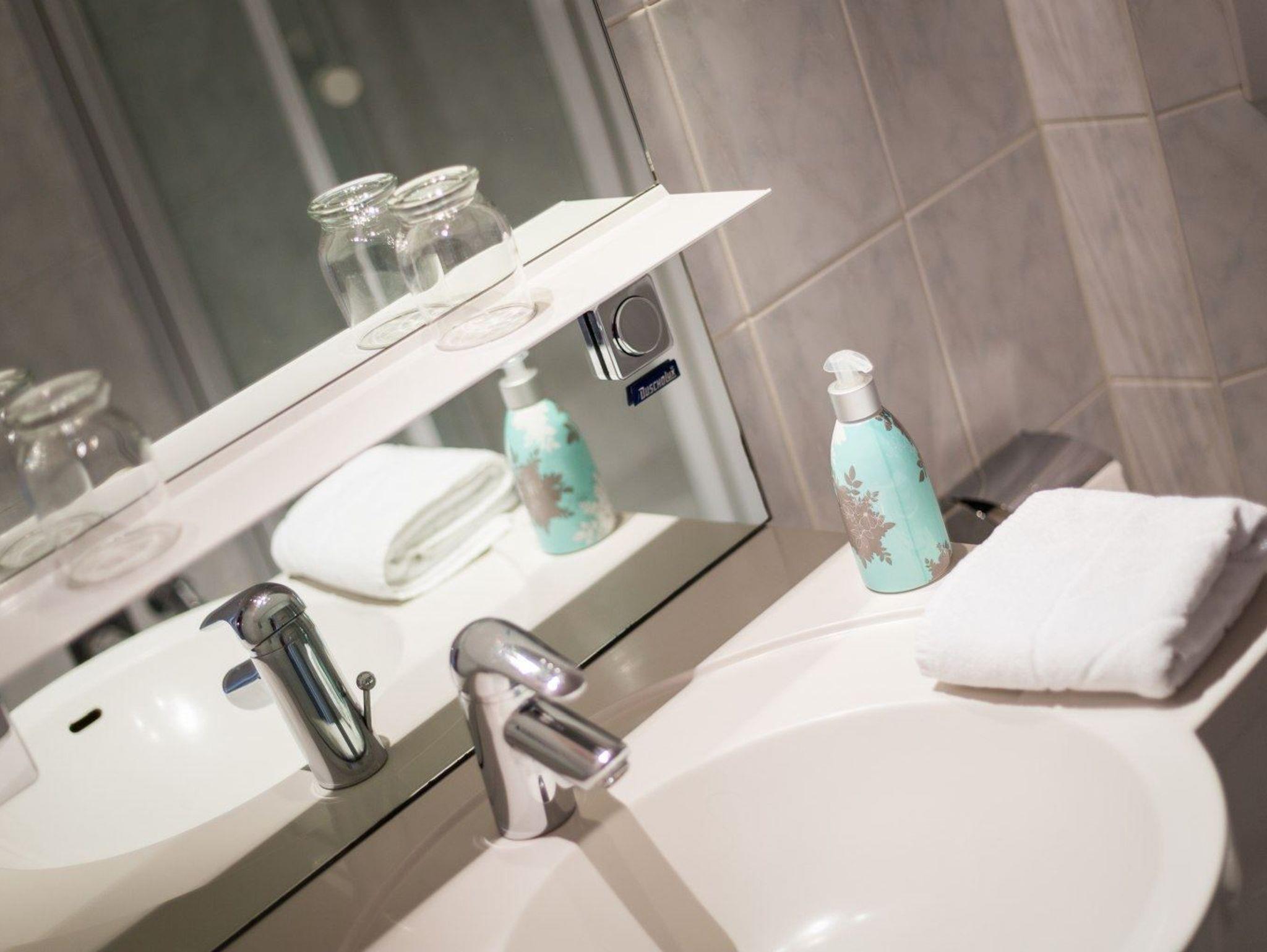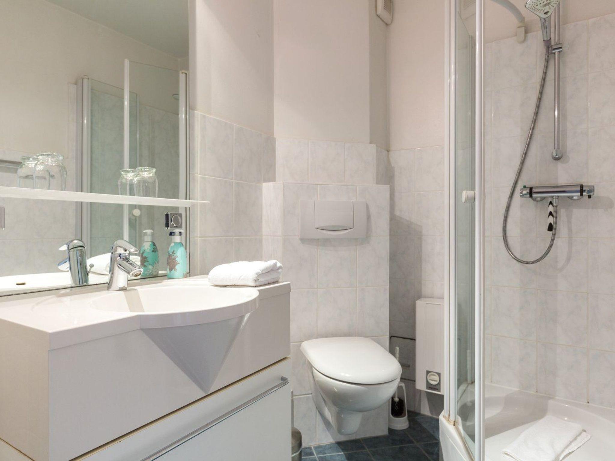 Badezimmer (Duschbad) mit Dusche, WC, Föhn und Handtuchwärmer.