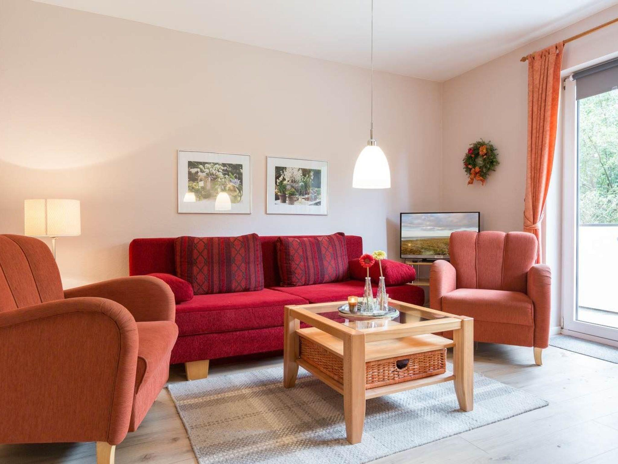 Wohnzimmer mit ausziehbarem Schlafsofa (2x 80x200cm), 2 Sesseln, TV (Sat), Radio und Esstisch mit 4 Stühlen. Direkter Zugang zur überdachten, möblierten Gartenterrasse nach Südwesten.