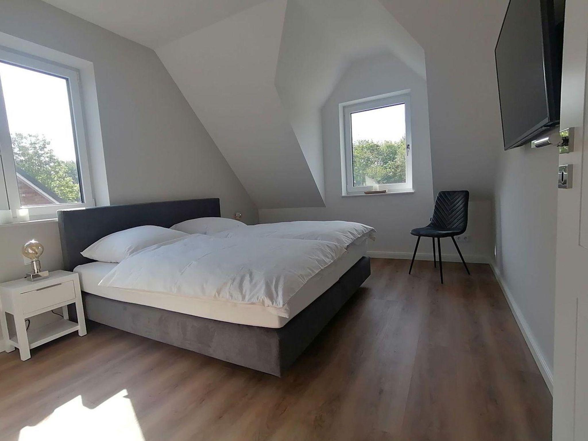 Drei Schlafzimmer mit je einem Boxspring-Doppelbett sind ausgestattet mit TV und großen Kleiderschränken.