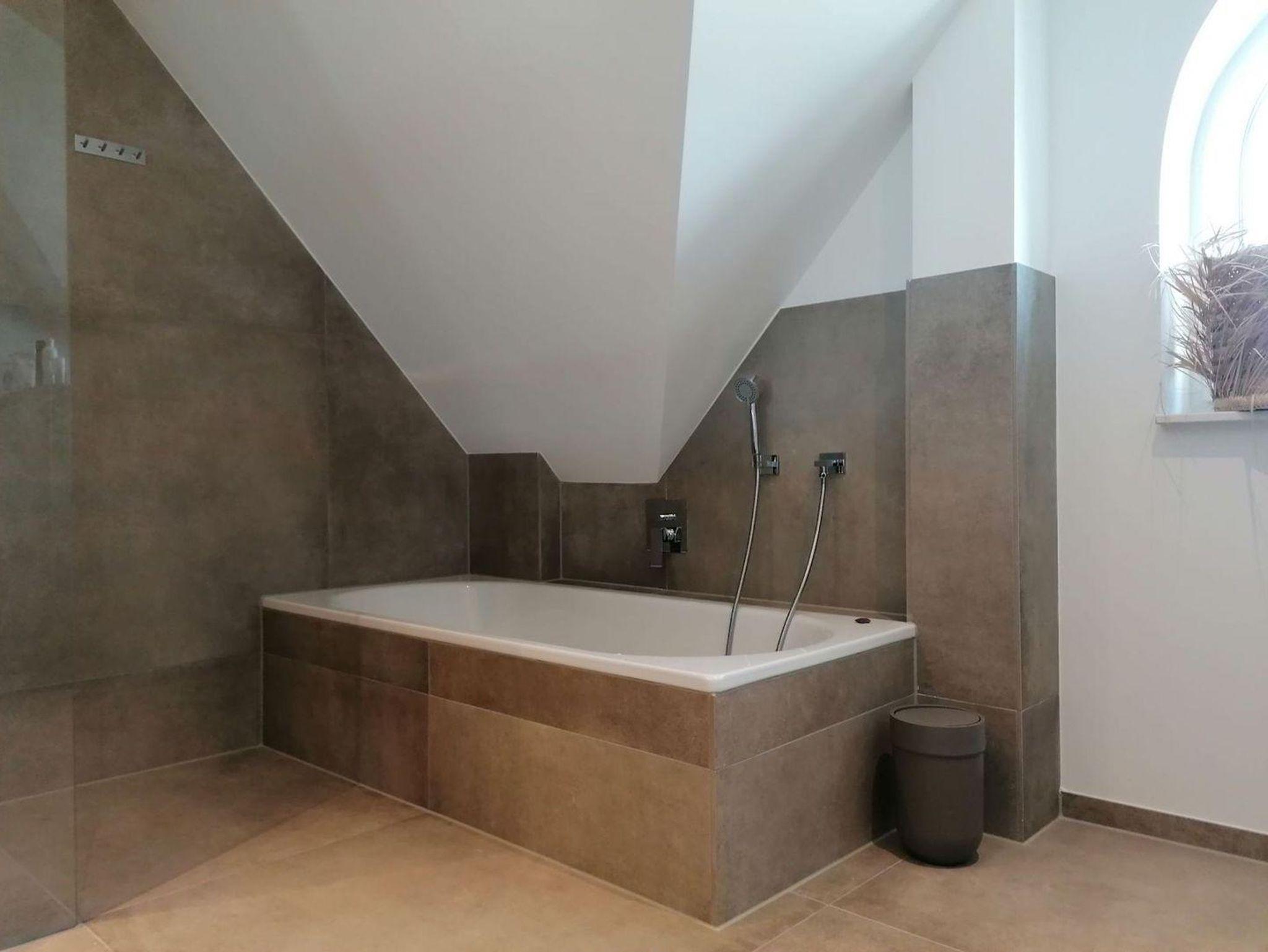Ein zweites vollausgestattetes Badezimmer im OG, mit einer Dusche, einer Badewanne und zwei einzelnen Waschbecken runden das hochwertige Hauskonzept ab und lassen keine Wünsche offen.