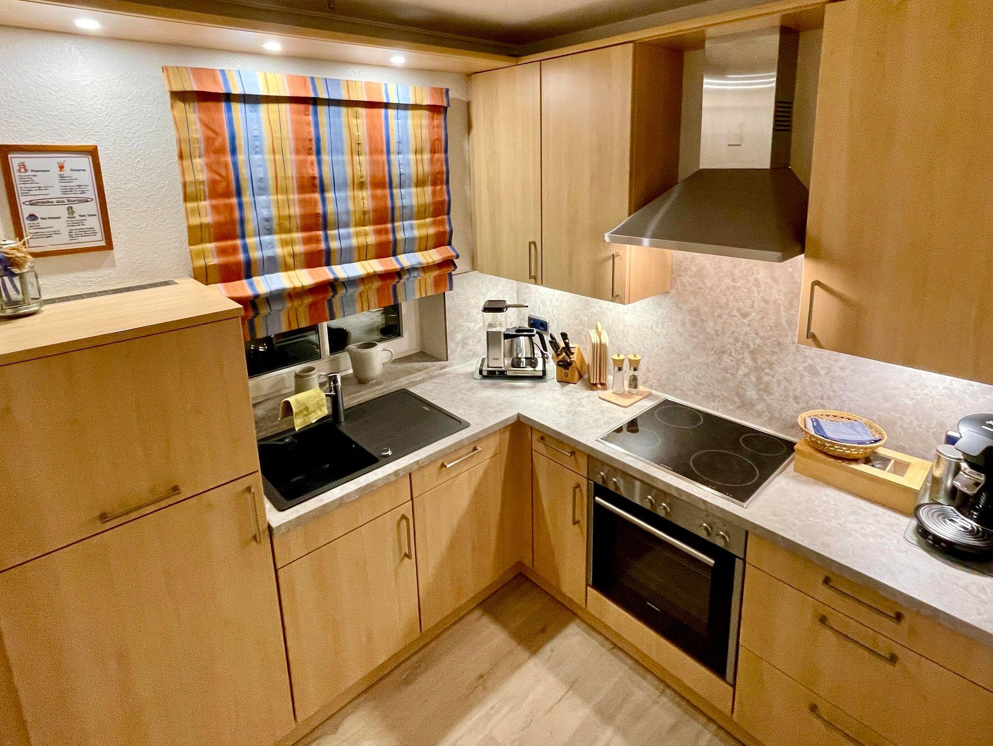 Die integrierte Einbau Küchenzeile ist komplett eingerichtet mit Mikrowelle, Geschirrspülmaschine,