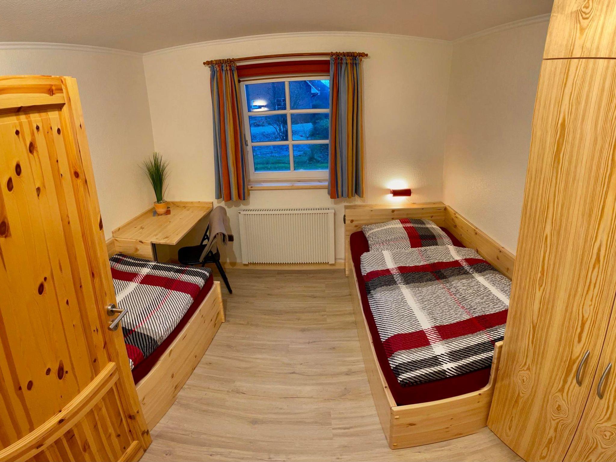 Ein Schlafraum ist mit einem Doppelbett, ein weiterer Raum mit zwei Einzelbetten ausgestattet.