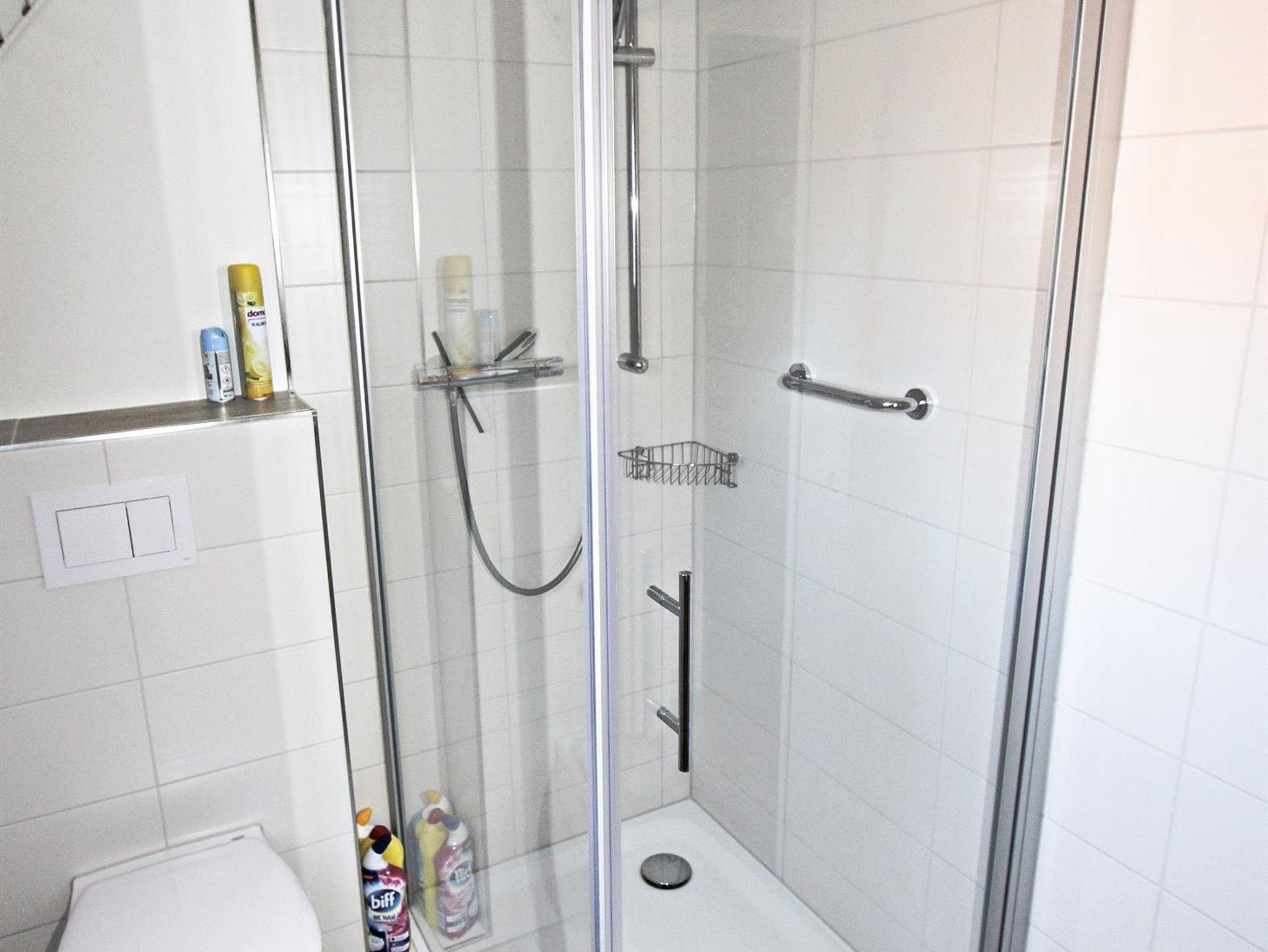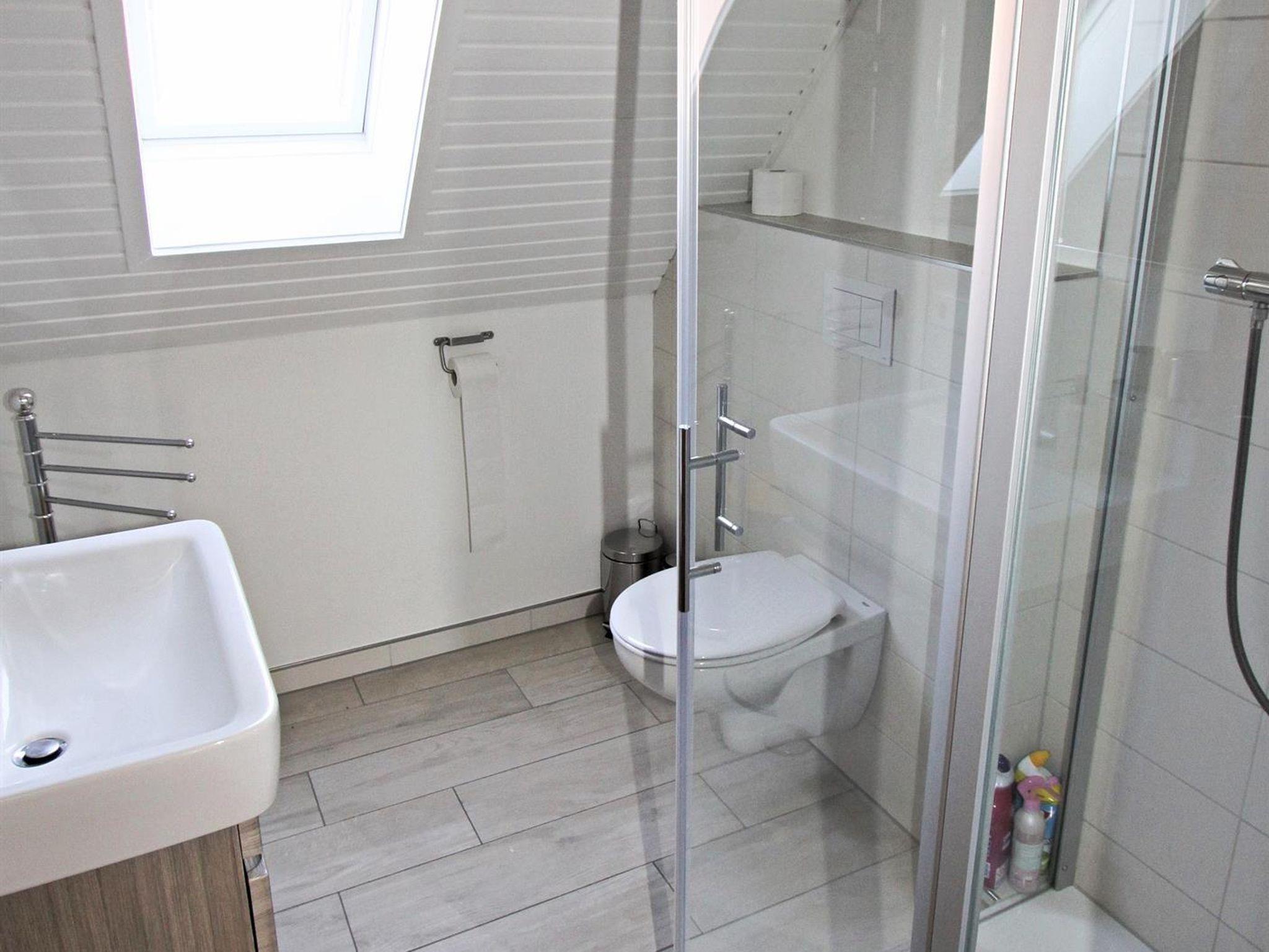 Ein Badezimmer mit Dusche, Waschtisch und WC ist vorhanden.