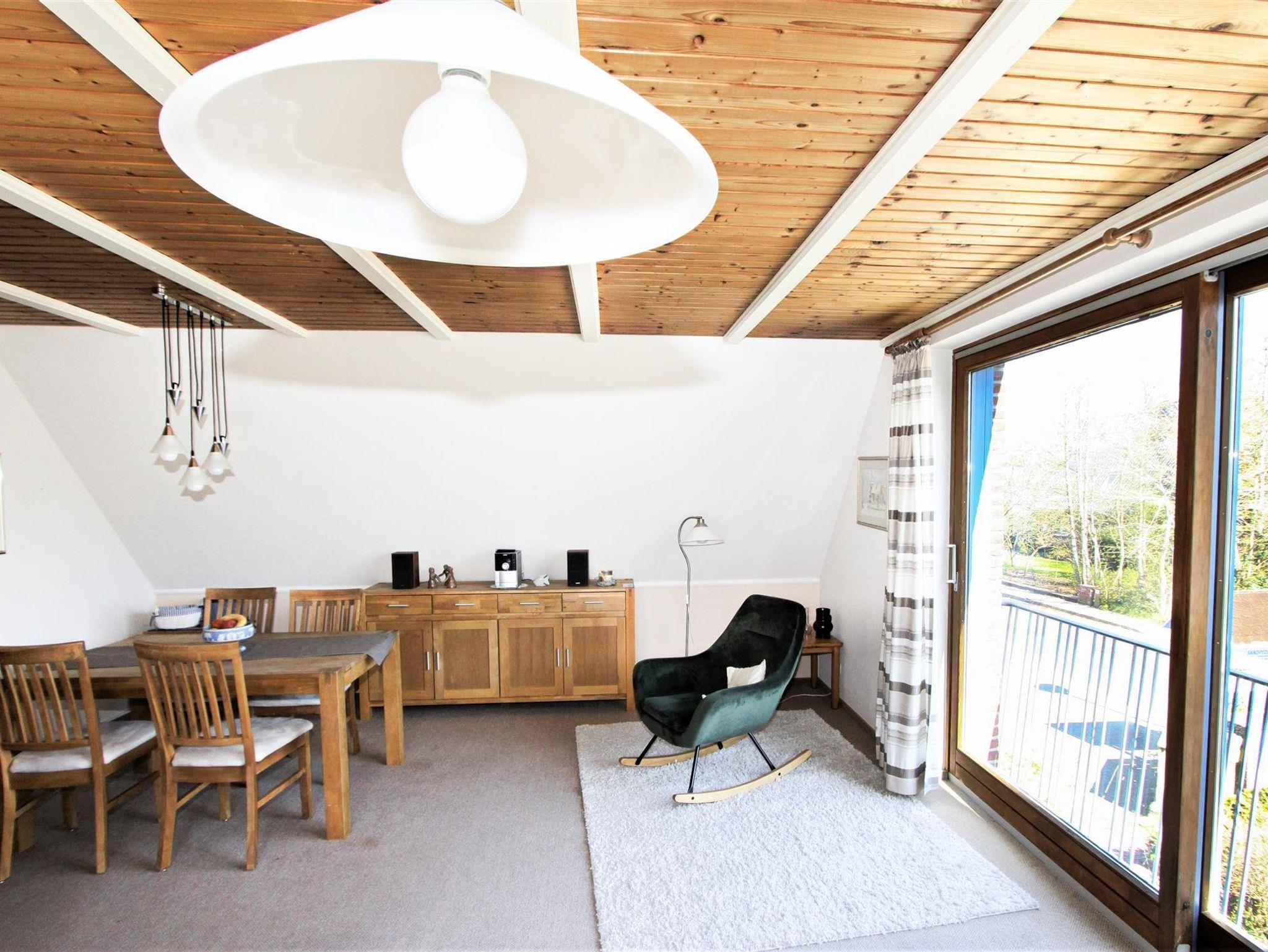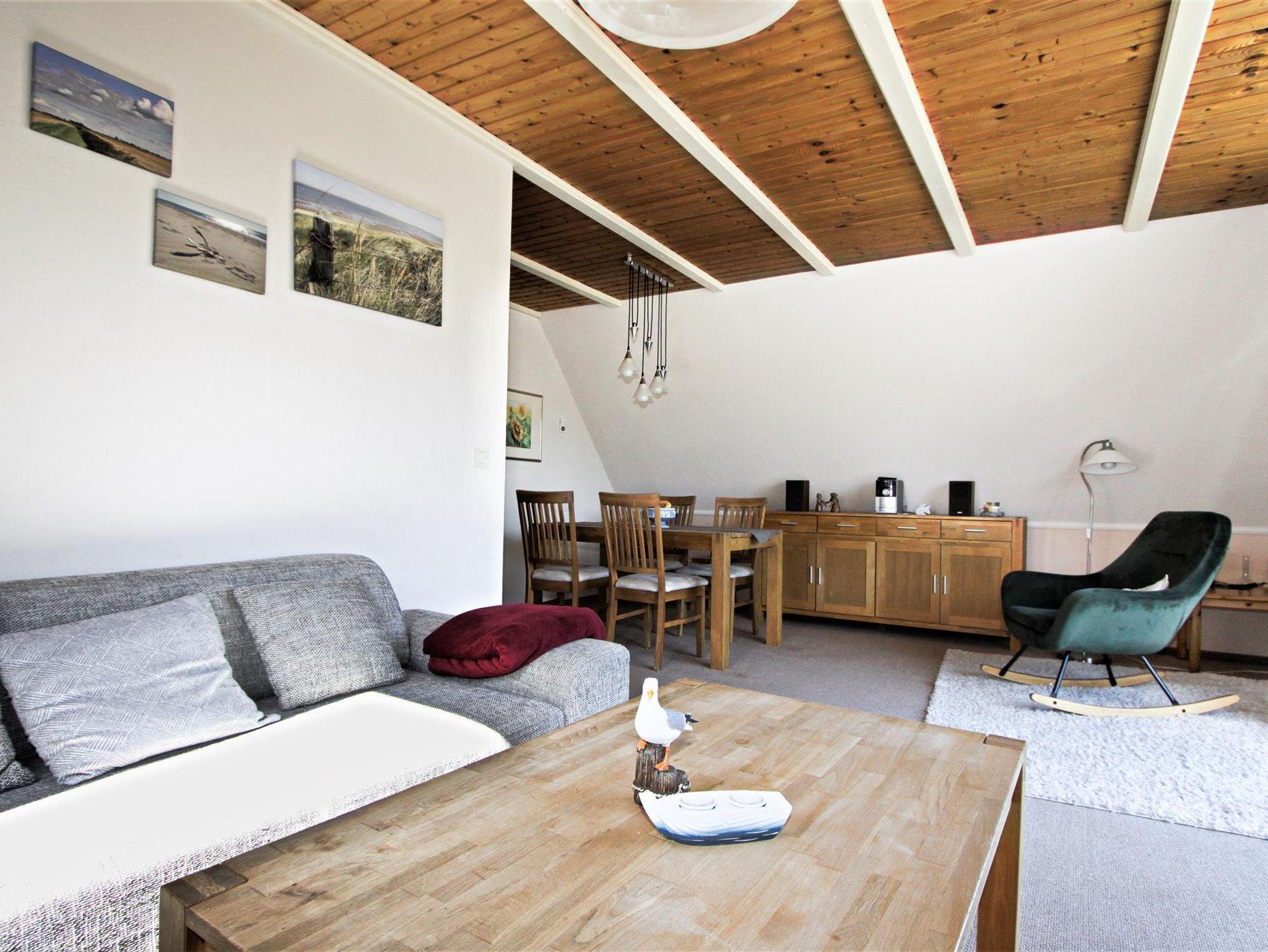 Rustikal, aber gemütlich erwartet Sie im Obergeschoß des Hauses Ebbe das Wohnzimmer mit Essplatz, Garnitur, Liegesessel, SAT Flachbildschirm, DVD-Player und Hifi Anlage. Ein französischer Balkon mit großer Schiebetür lässt die frische Nordseebrise hereinwehen.