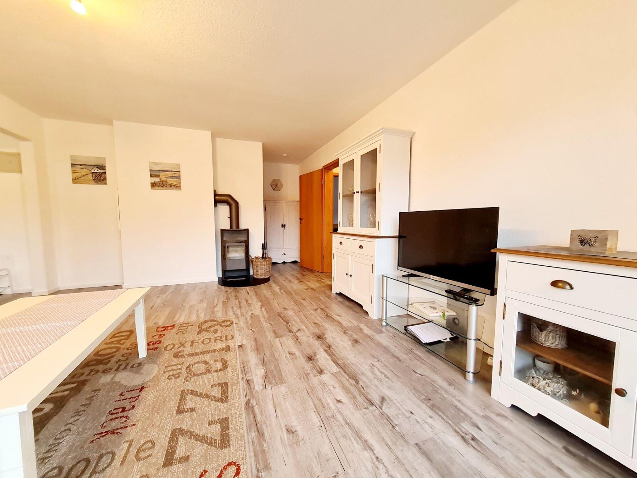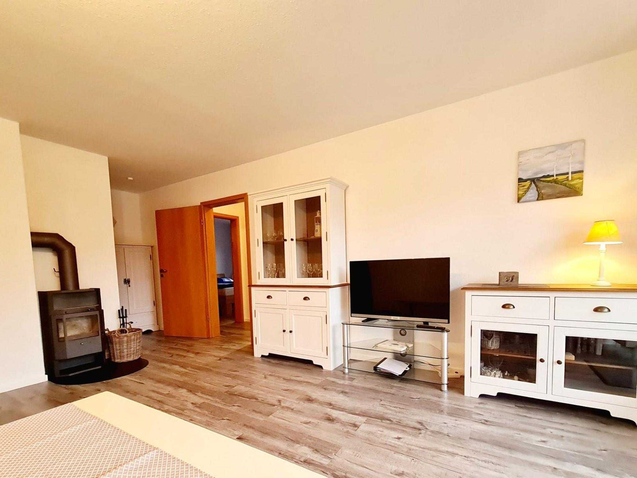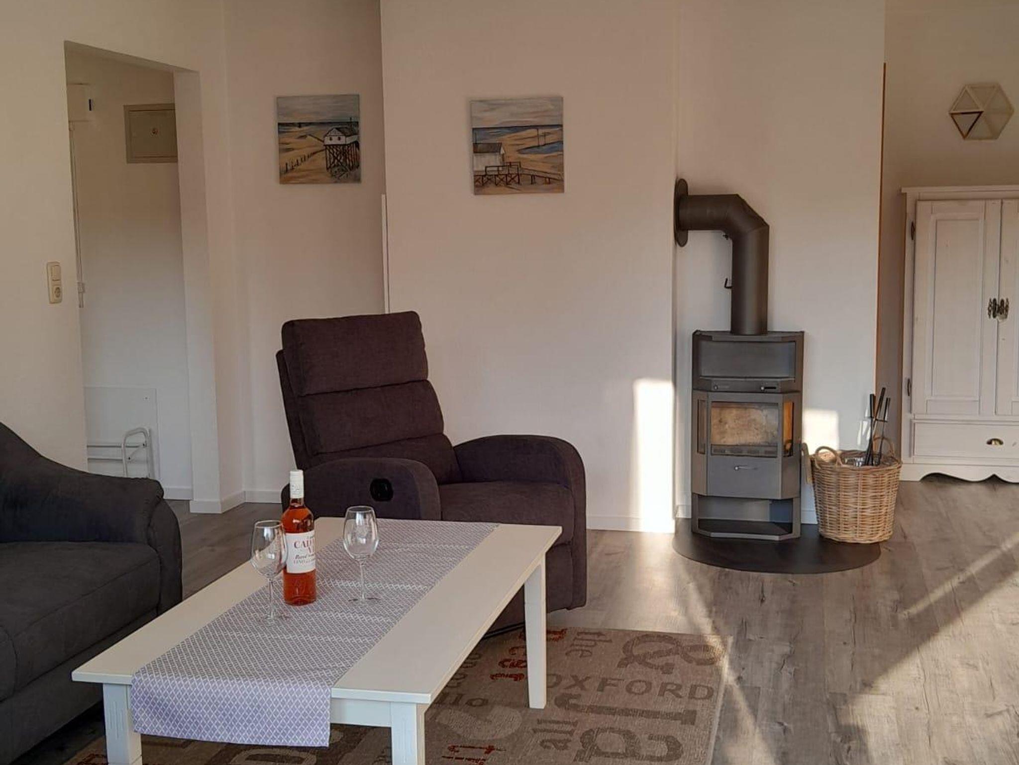 Ein gemütliches Wohnzimmer mit Kaminofen sorgt für eine entspannte Atmosphäre.