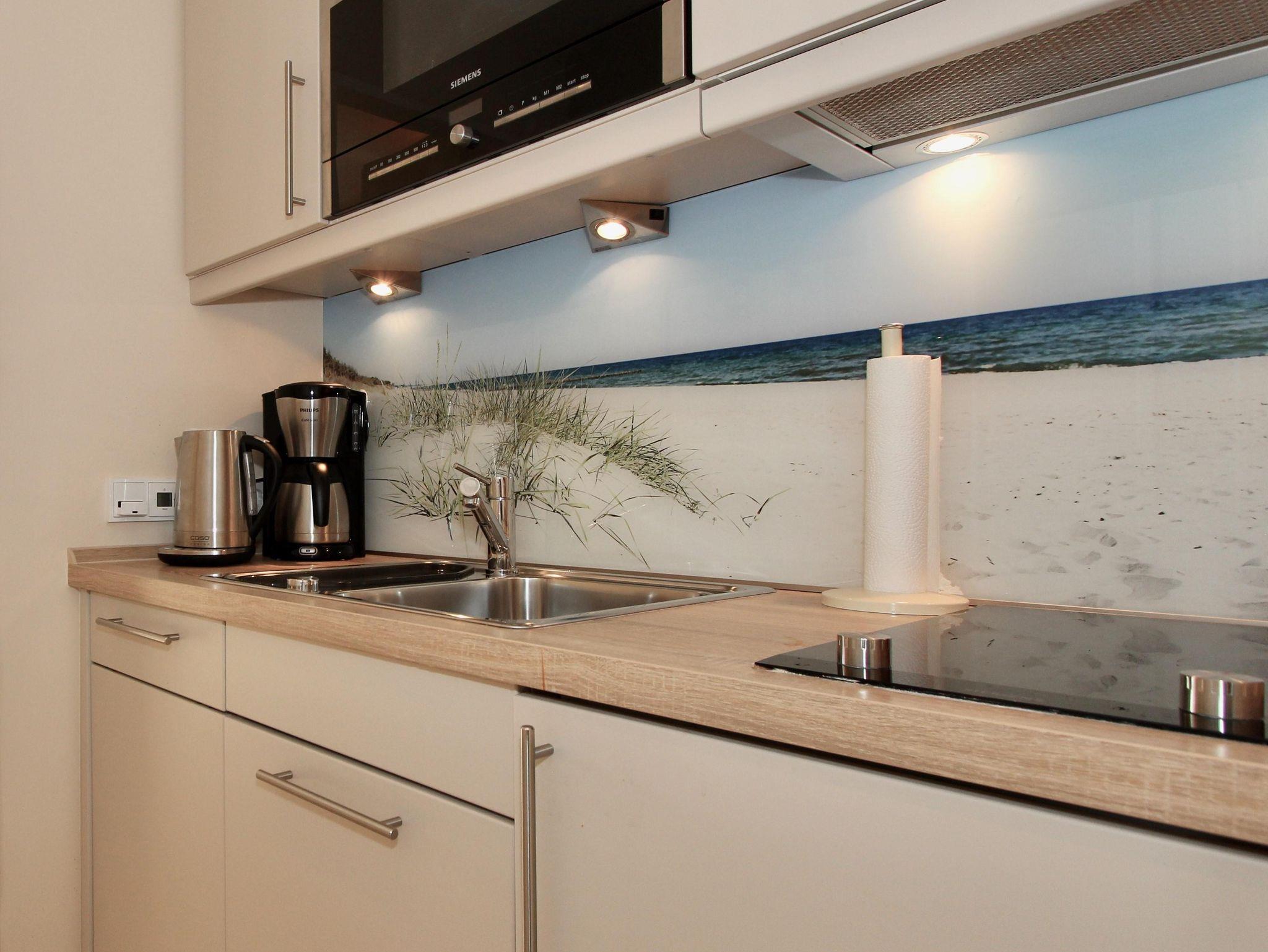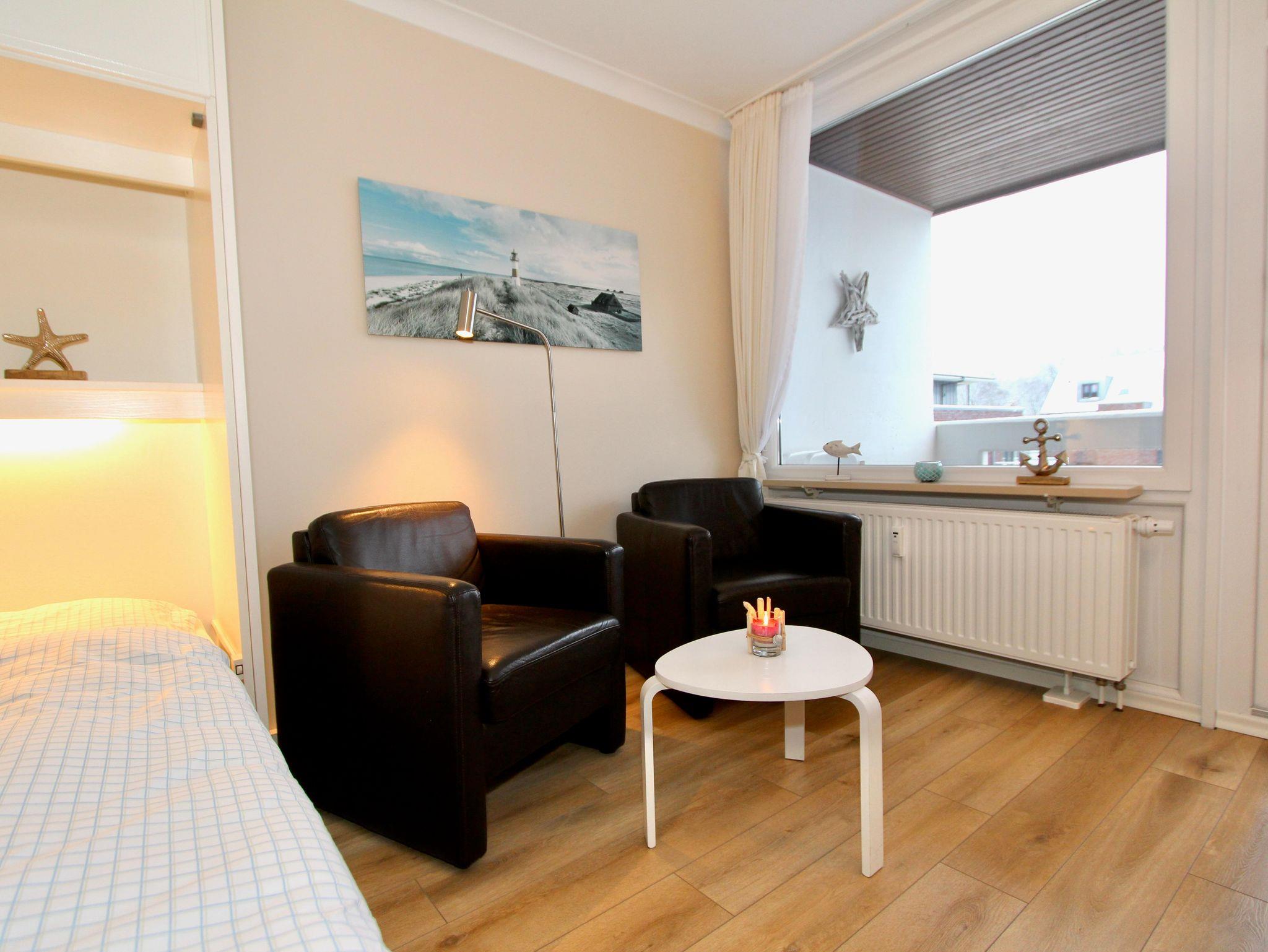 Das Wohn-/Schlafzimmer verfügt über eine Leseecke mit zwei Ledersesseln, einem Esstisch und einem großen Fernseher mit Mediathek. Die kleine Küchenzeile ist hochwertig und vollständig ausgestattetet u.a. mit Geschirrspüler, Kühlschrank inkl. 4-Sterne-Gefrierfach, Kombi-Mikrowelle mit Grillfunktion und Ceran-Kochfeld.