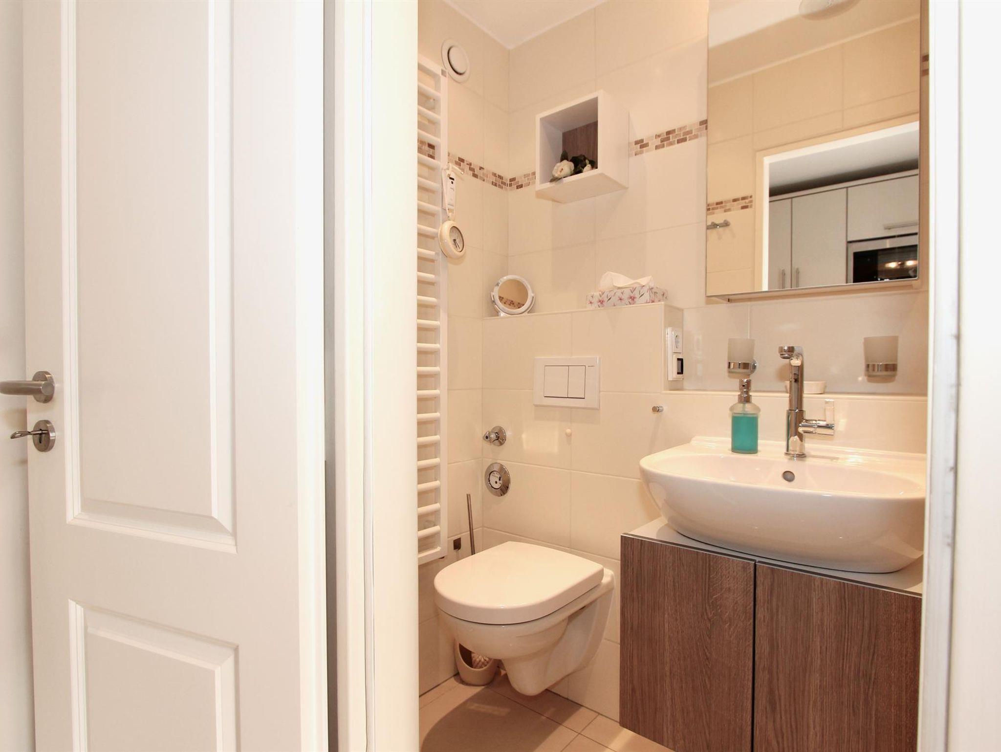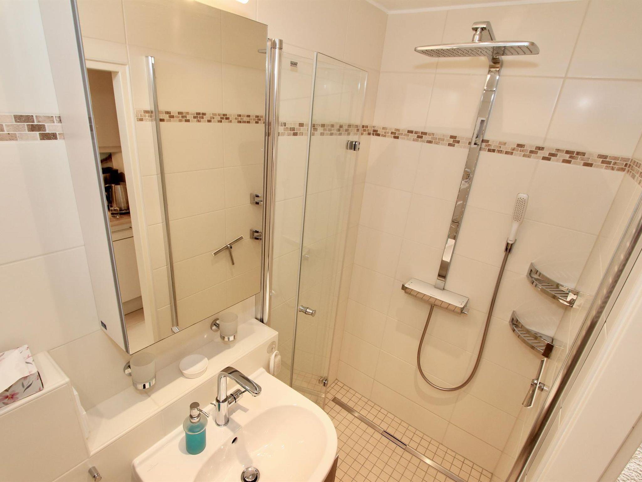 Außerdem gehört zur Wohnung ein kleines aber hochwertiges Bad mit Rainshower-Dusche, Handtuchheizung, Deckenlautsprecher, Spiegelschrank und Kosmetikspiegel. Vom Wohnzimmer aus gelangen Sie auf den windgeschützten Südwestbalkon. Ein Balkontisch, Stühle und ein Sonnenschirm sind vorhanden (im Winter werden die Balkonmöbel eingelagert).
