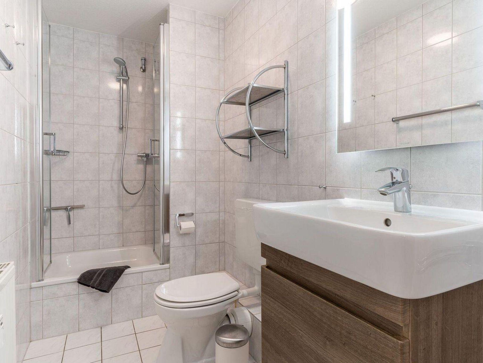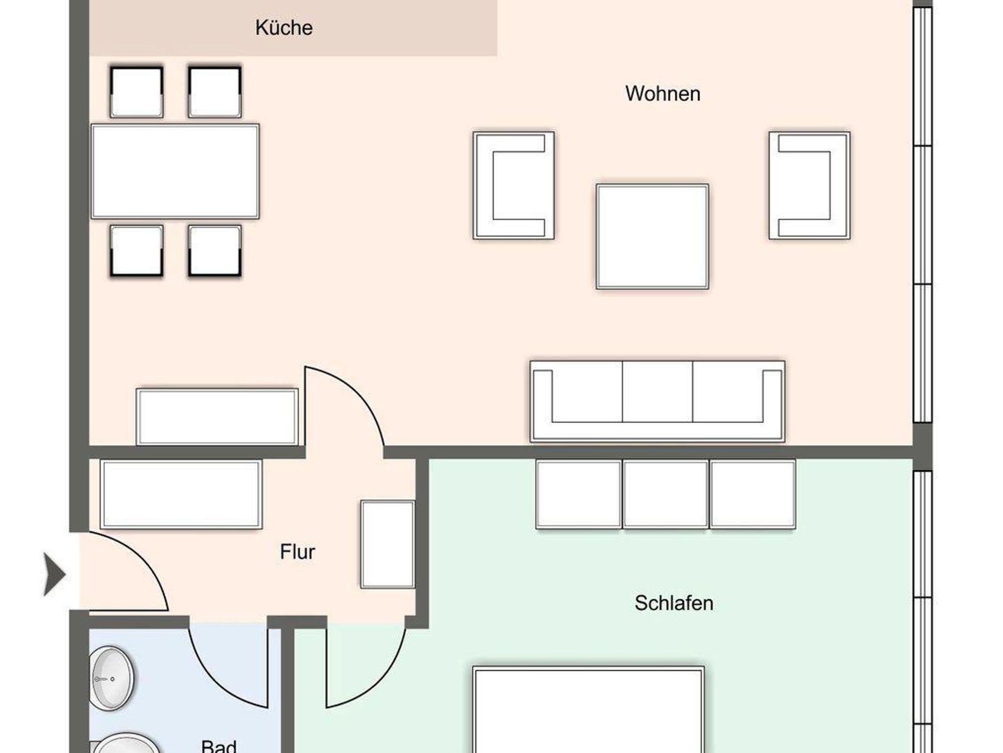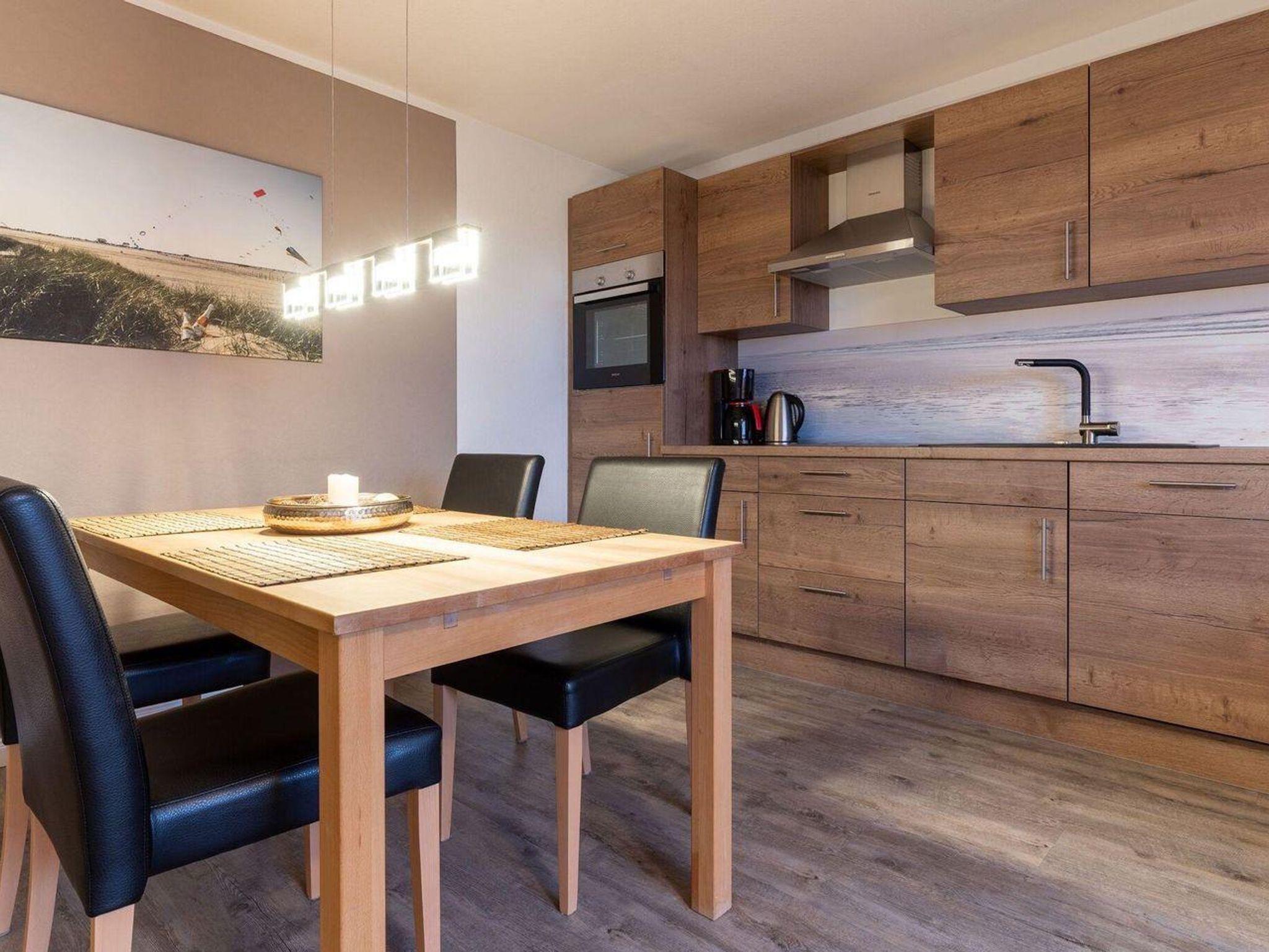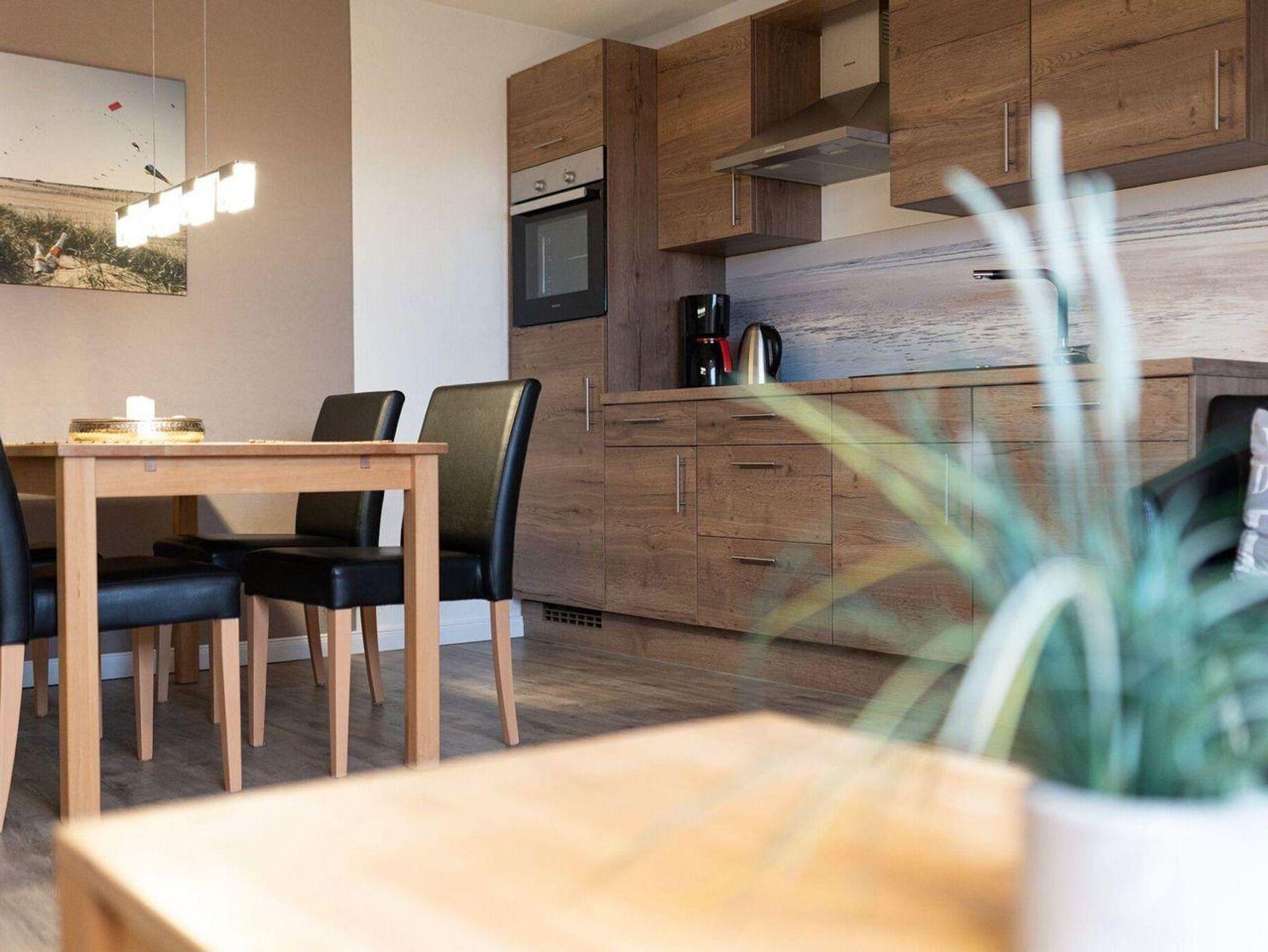 Der Wohnbereich des Appartements besteht aus einer bequemen Couch mit Couchtisch und 2 Sesseln. Auch ein Esstisch mit 4 Stühlen steht für Sie bereit. Die Küchenzeile ist ausgestattet mit einem Herd mit Ceranfeld und Backofen, Geschirrspüler und Geschirr - dazu Kaffeemaschine, Kochtöpfe, Kühlschrank, Toaster und einem Wasserkocher. Das Schlafzimmer mit 2 Nachttischen und einem Kleiderschrank verfügt über ein bequemes Boxspringbett (1,80 x 2,00 m). Eine weitere Schlafmöglichkeit bietet Ihnen eine Schlafcouch im Wohnbereich. Das Badezimmer ist mit Dusche, Waschbecken und WC ausgestattet. Zur Unterhaltung dient ein Sat-TV Flachbildschirm inkl. Radio-Empfang sowie WLAN (inklusive).