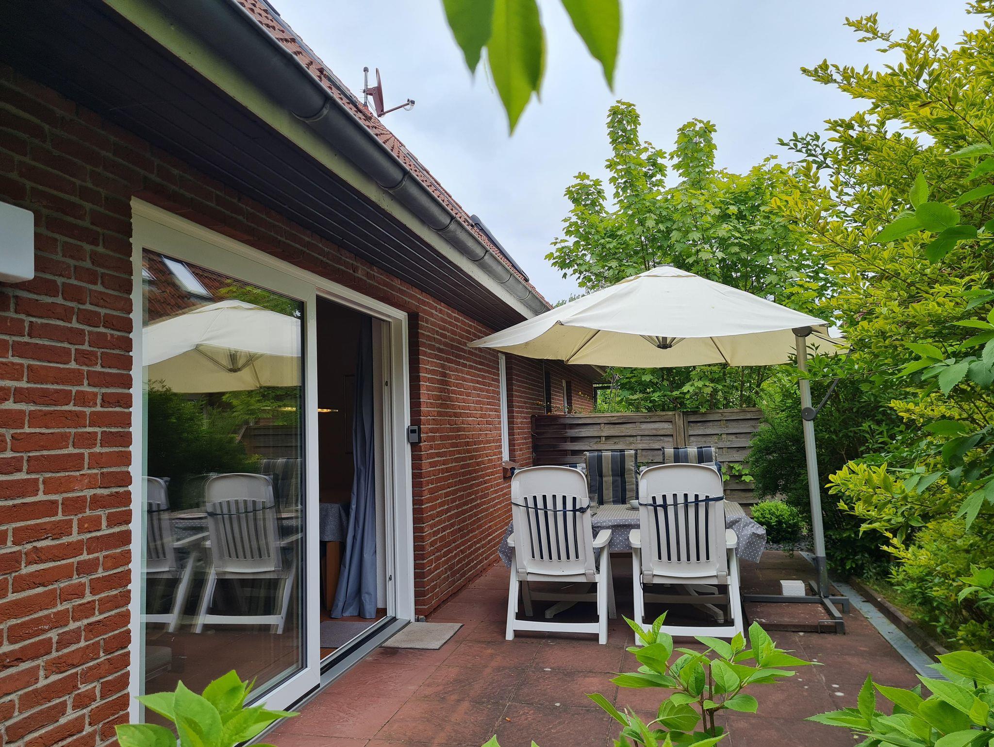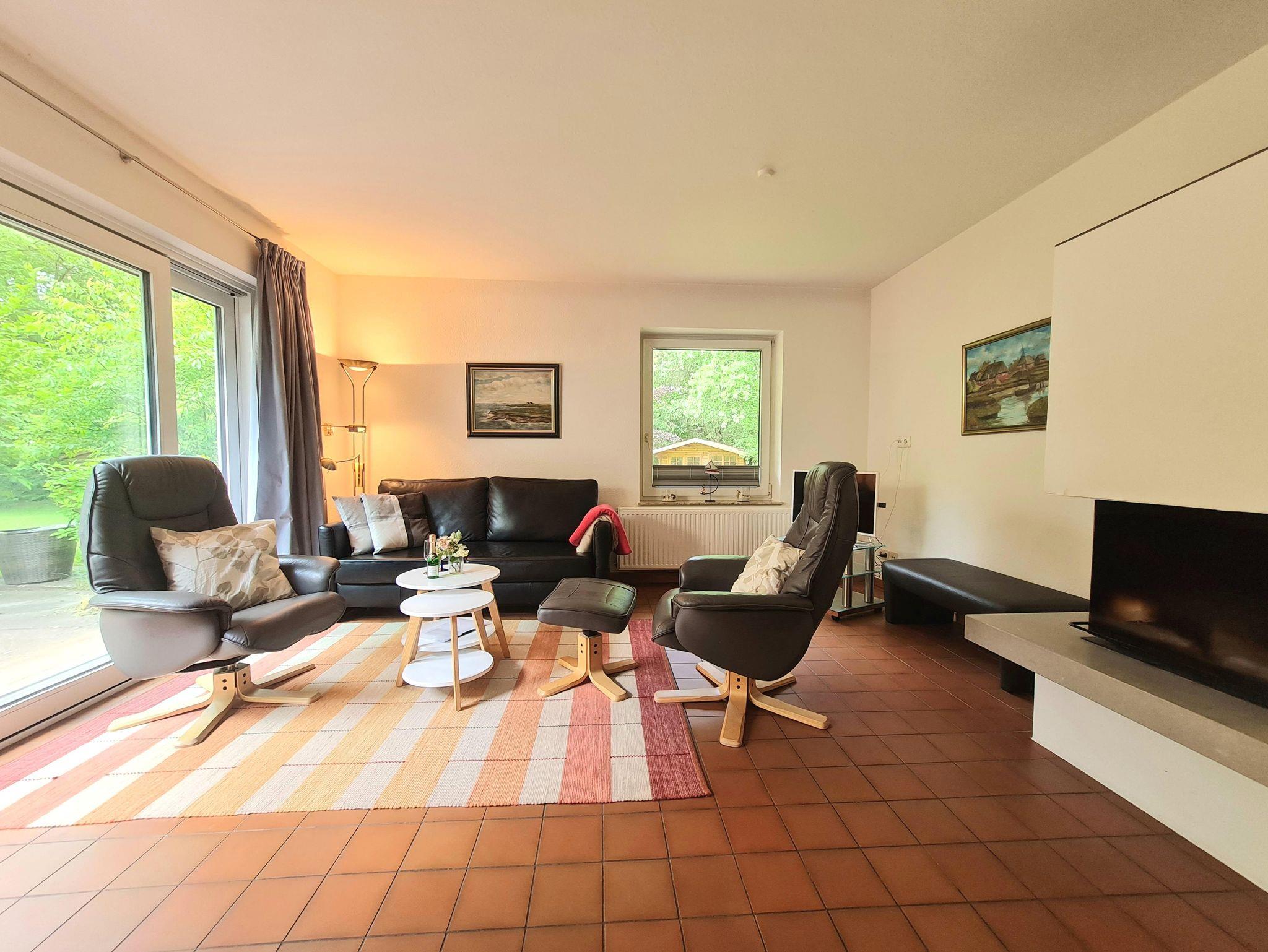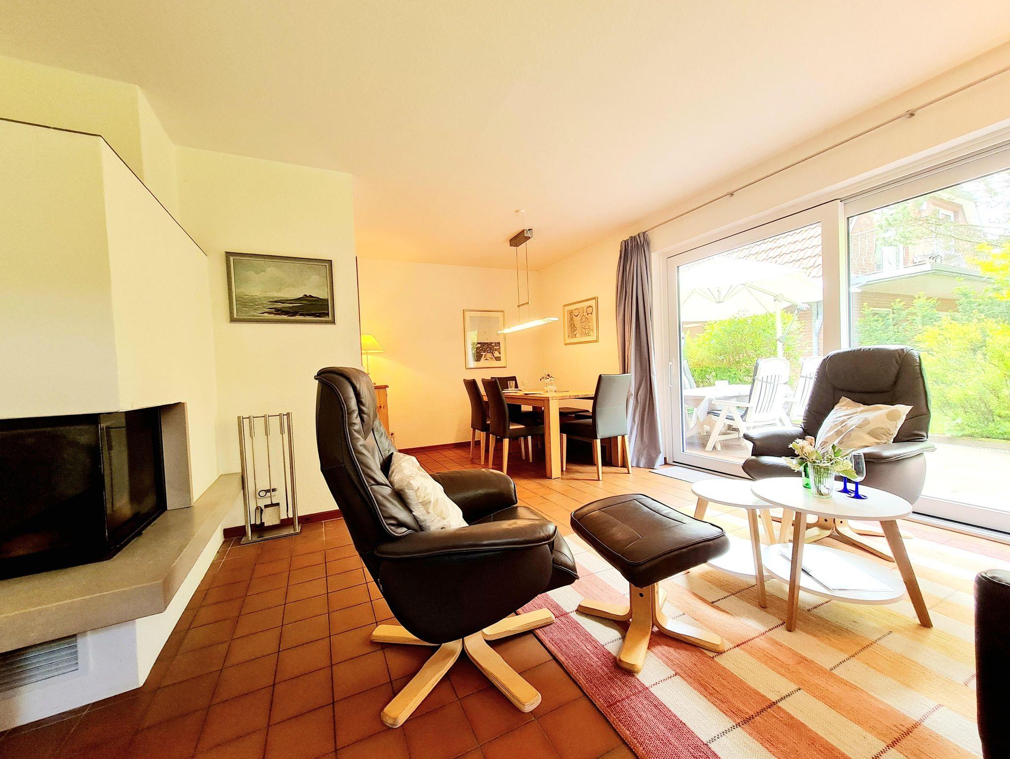 Die Ferienwohnung bietet ein großzügiges Wohnzimmer mit ausziehbarer Doppelcouch, Flachbild-TV, Radio und einem gemütlichen Kamin. Vom Wohnzimmer gelangen Sie direkt auf die möblierte Terrasse mit Strandkorb und Gartenmöbeln, die zum Entspannen einlädt.