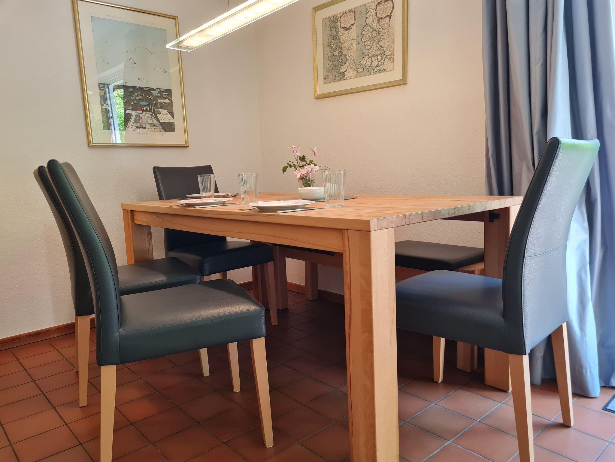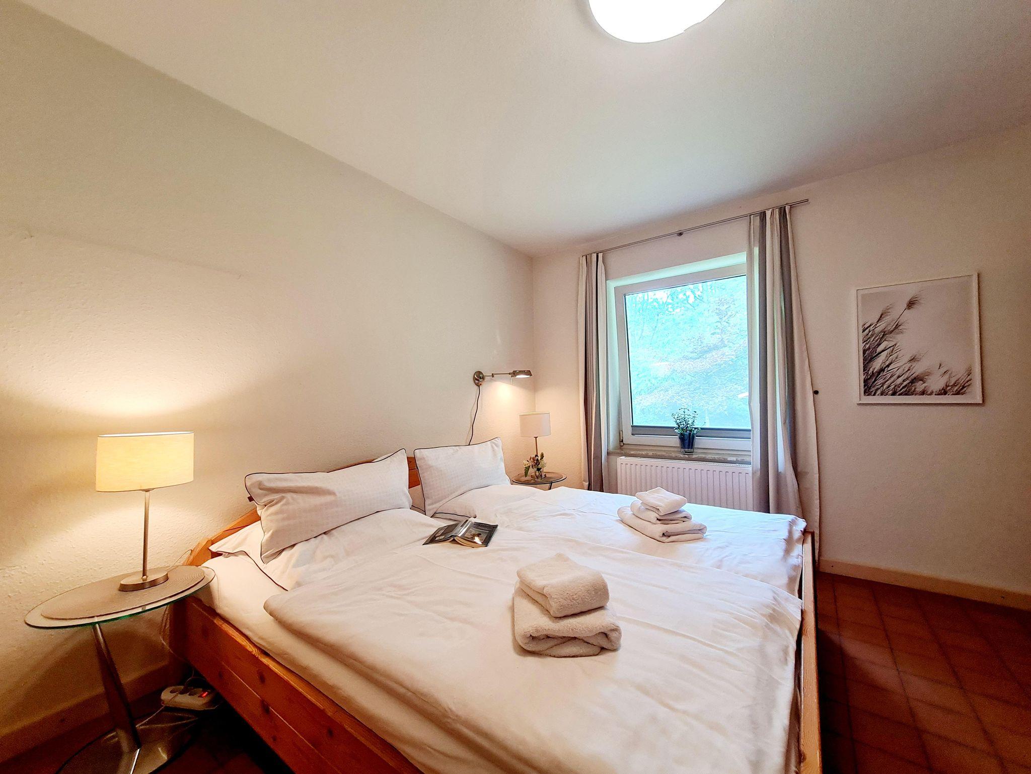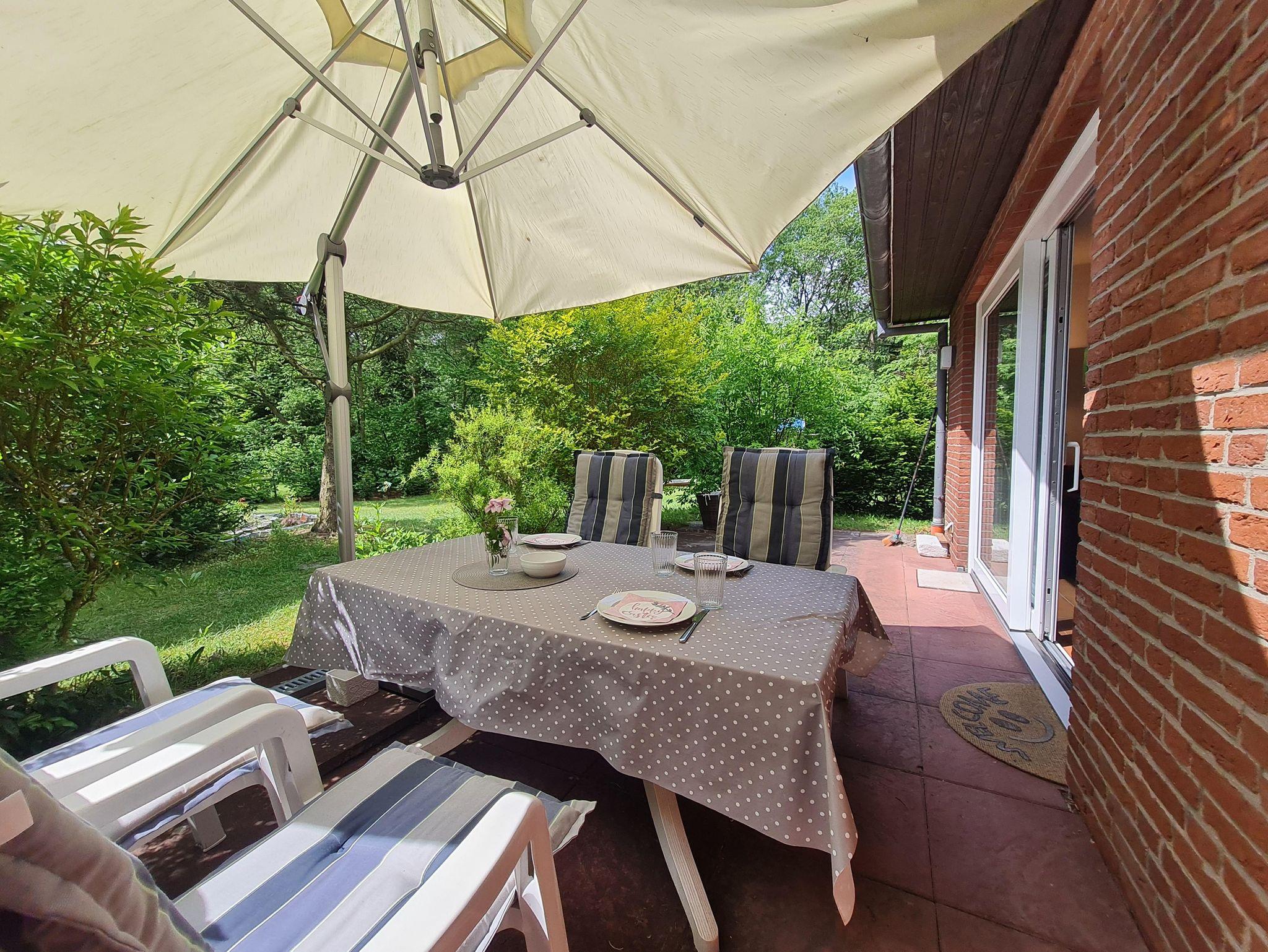Die Ferienwohnung bietet ein großzügiges Wohnzimmer mit ausziehbarer Doppelcouch, Flachbild-TV, Radio und einem gemütlichen Kamin. Vom Wohnzimmer gelangen Sie direkt auf die möblierte Terrasse mit Strandkorb und Gartenmöbeln, die zum Entspannen einlädt.