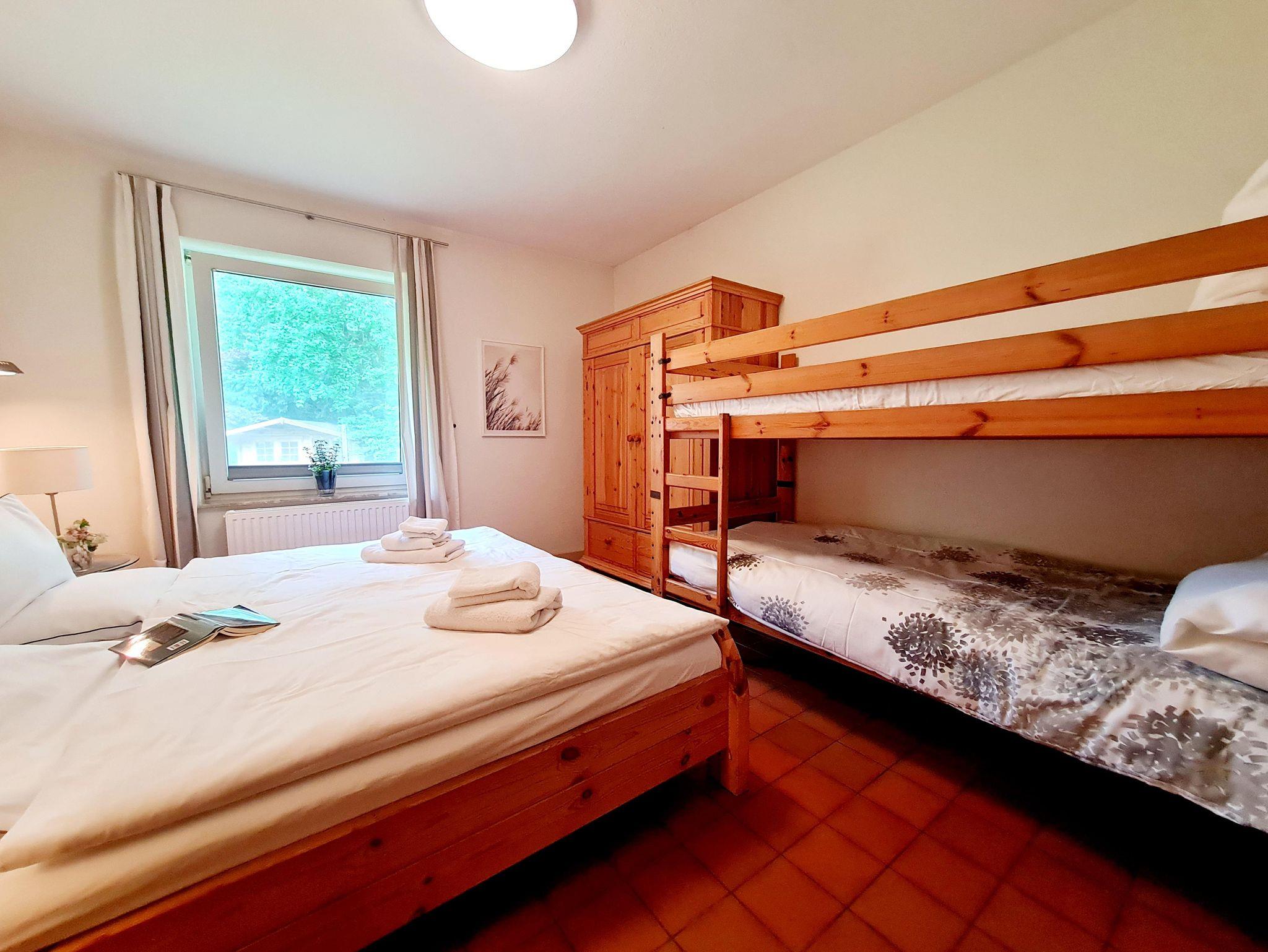 Im Schlafzimmer befinden sich ein Doppelbett sowie ein Etagenbett, sodass bis zu vier Personen bequem Platz finden. Ein Kinderbett und ein Hochstuhl stehen ebenfalls zur Verfügung – perfekt für Familien mit kleinen Kindern.