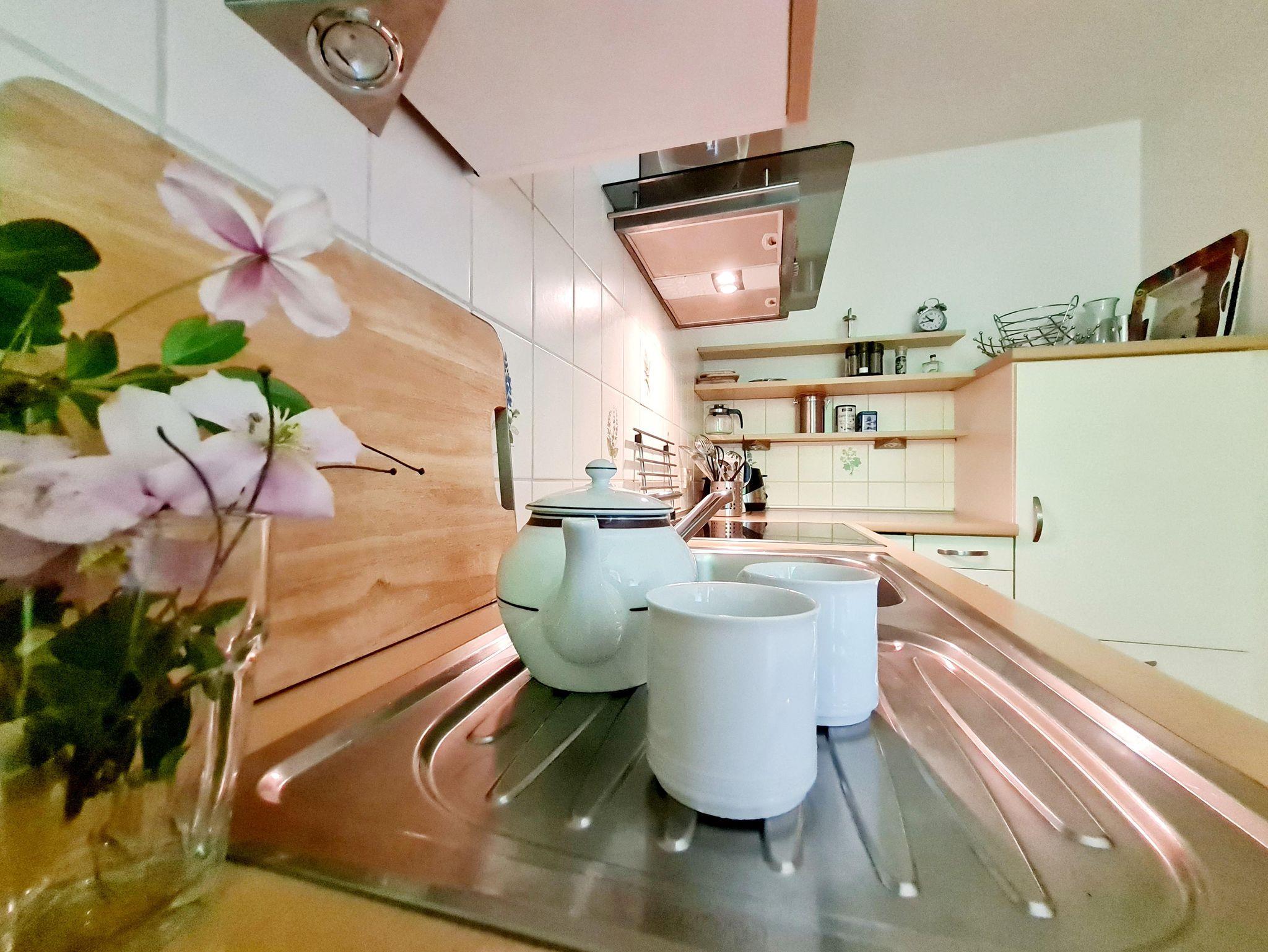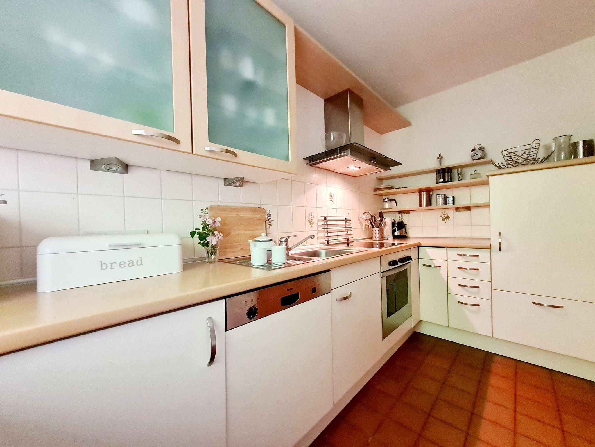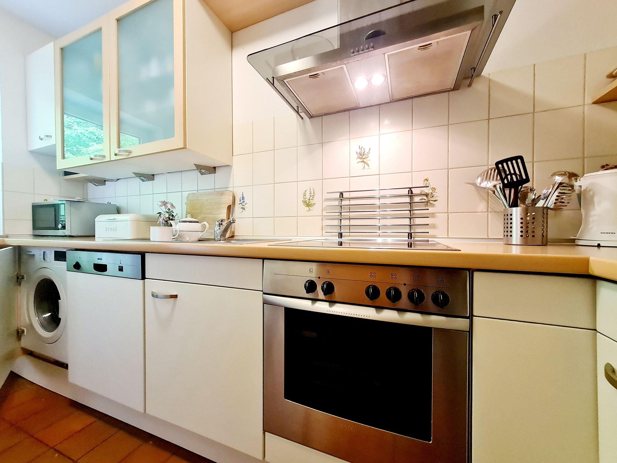 Die voll ausgestattete Küche verfügt über eine Geschirrspülmaschine, Mikrowelle, Waschmaschine und Trockner – ideal für einen komfortablen Aufenthalt.