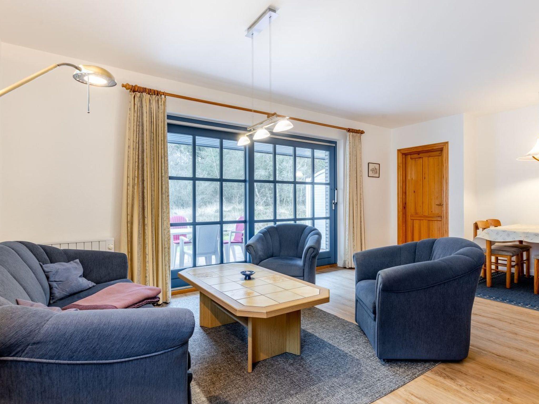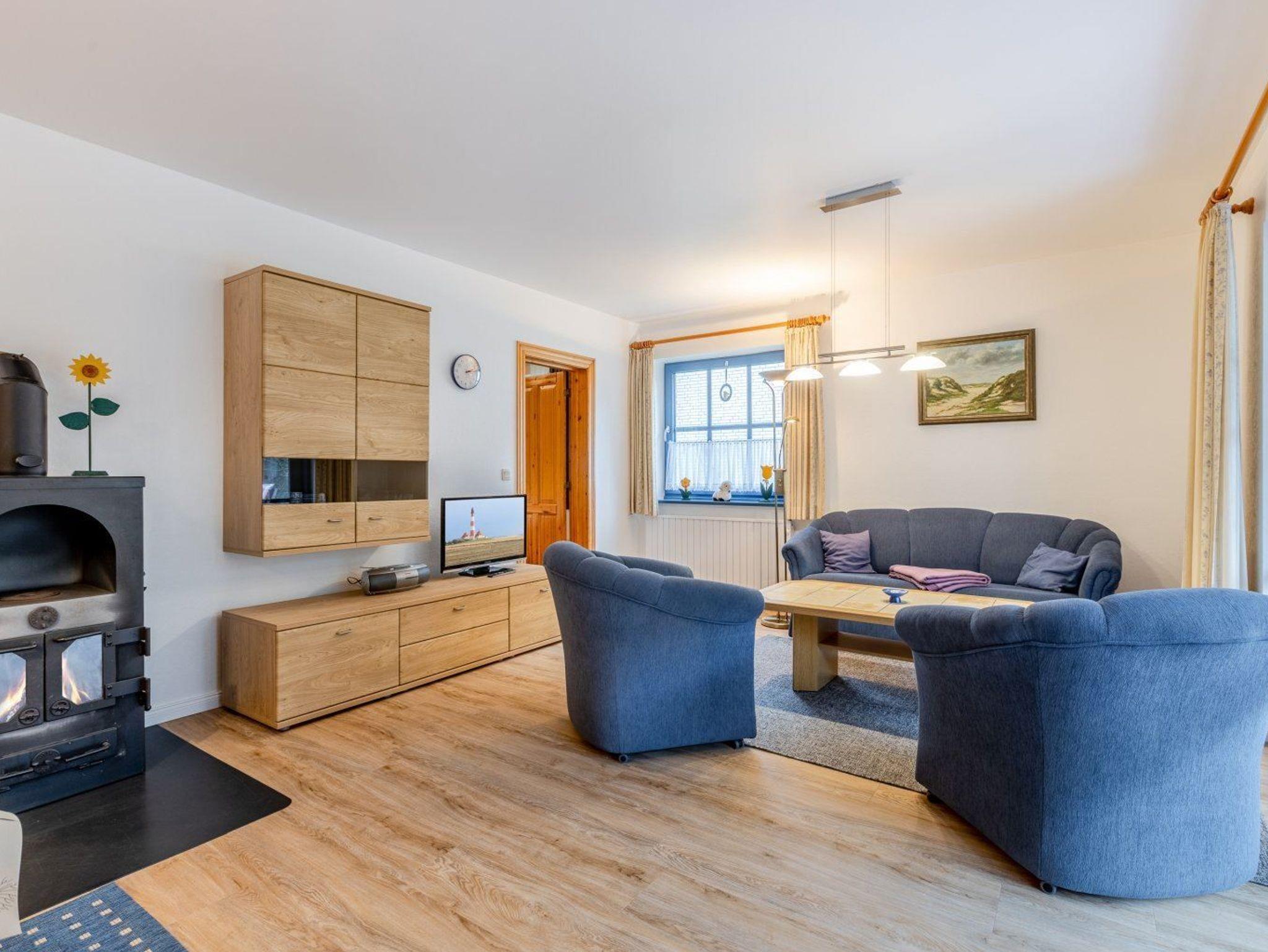 Wohnzimmer mit 1 Sofa und 2 Sesseln, TV (Kabel), Radio mit CD-Player, behaglichem Kaminofen und Esstisch mit 4 Stühlen. Direkter Zugang zur möblierten und windgeschützten Gartenterrasse nach Süden mit Strandkorb.