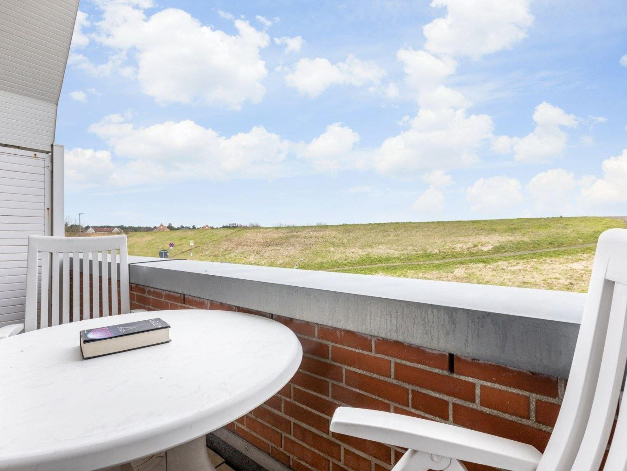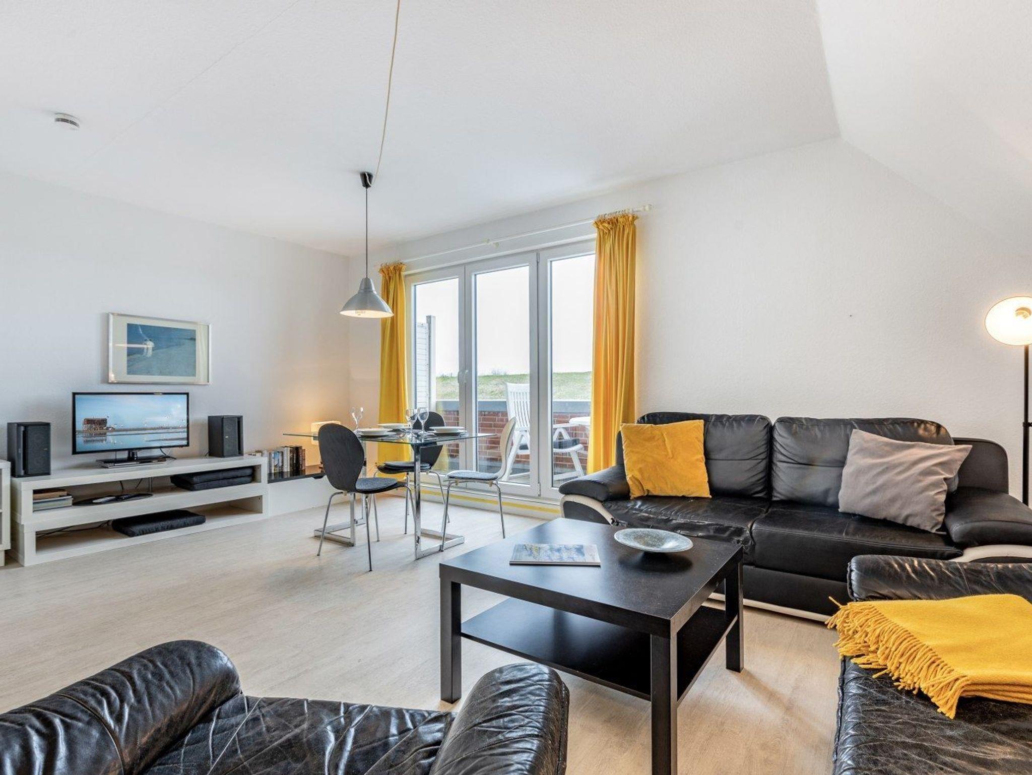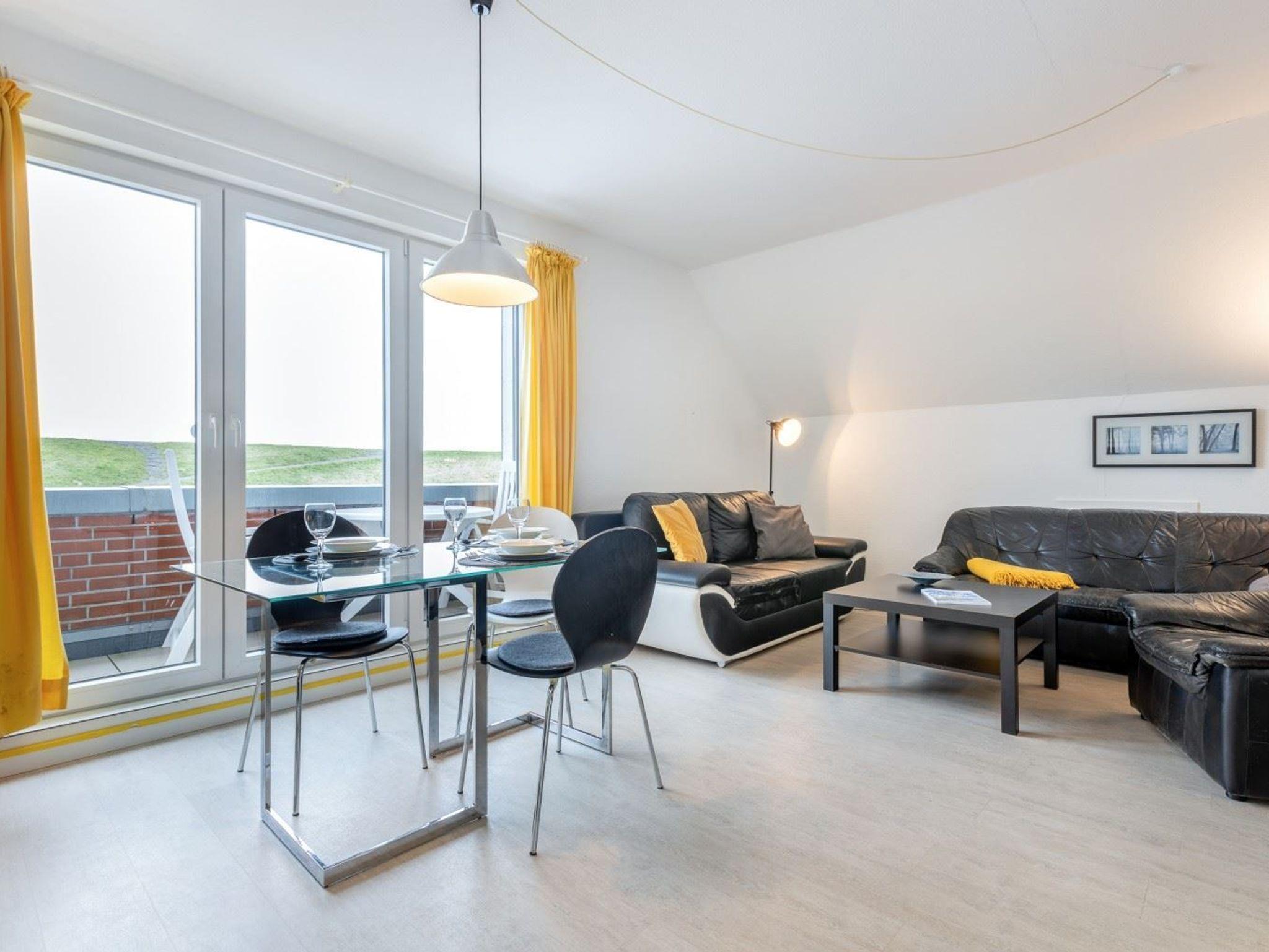 Wohnzimmer mit 2 Sofas, eines davon ist ein ausziehbares Schlafsofa (140x195cm), einem Sessel, Esstisch mit 4 Stühlen, TV (Sat), Stereo-Kompaktanlage und DVD-Player. Direkter Zugang zum möblierten Balkon zur Deichseite. Offene Küche mit Backofen, Mikrowelle, Geschirrspüler und Kühlschrank mit Gefrierfach.