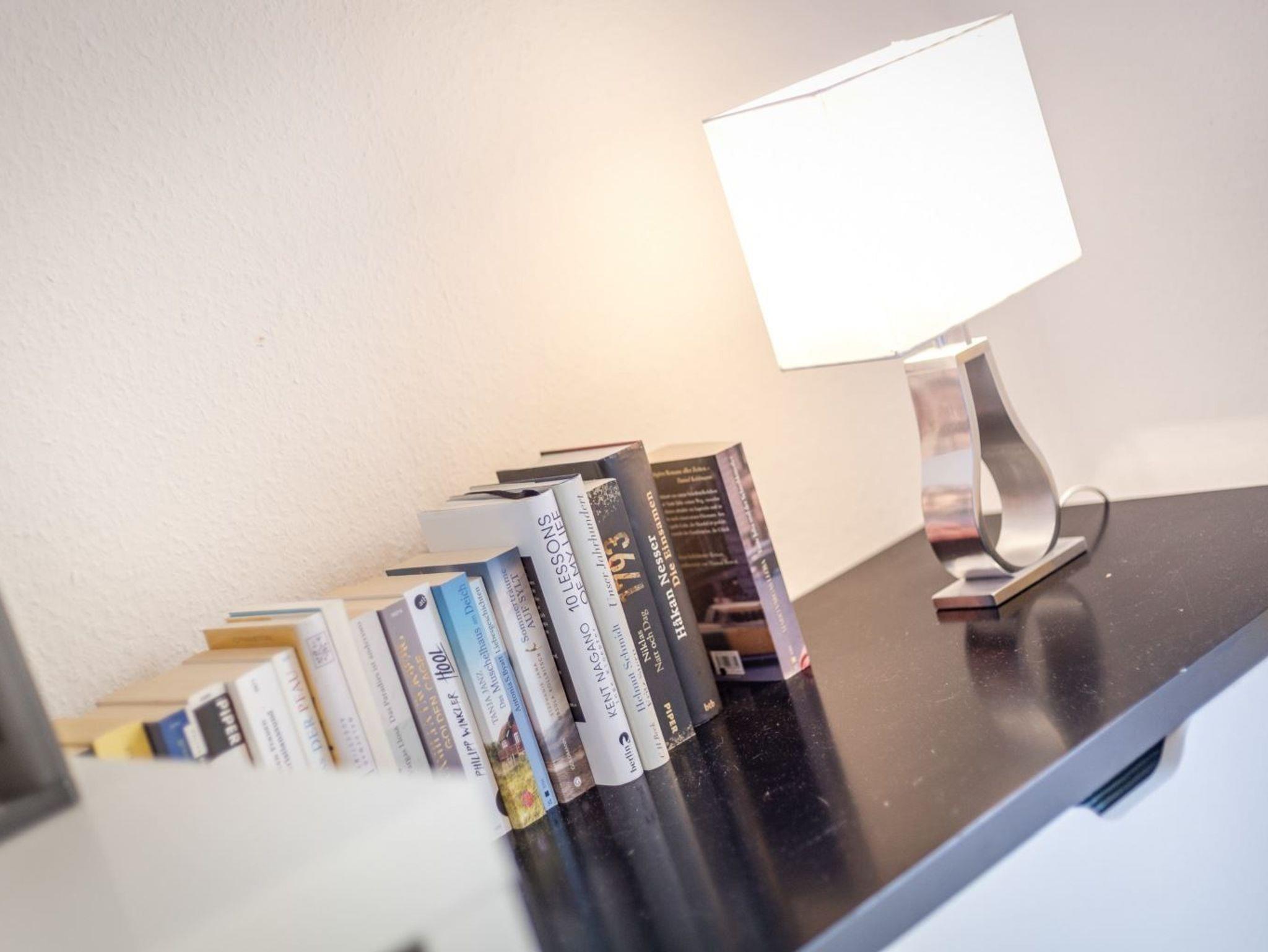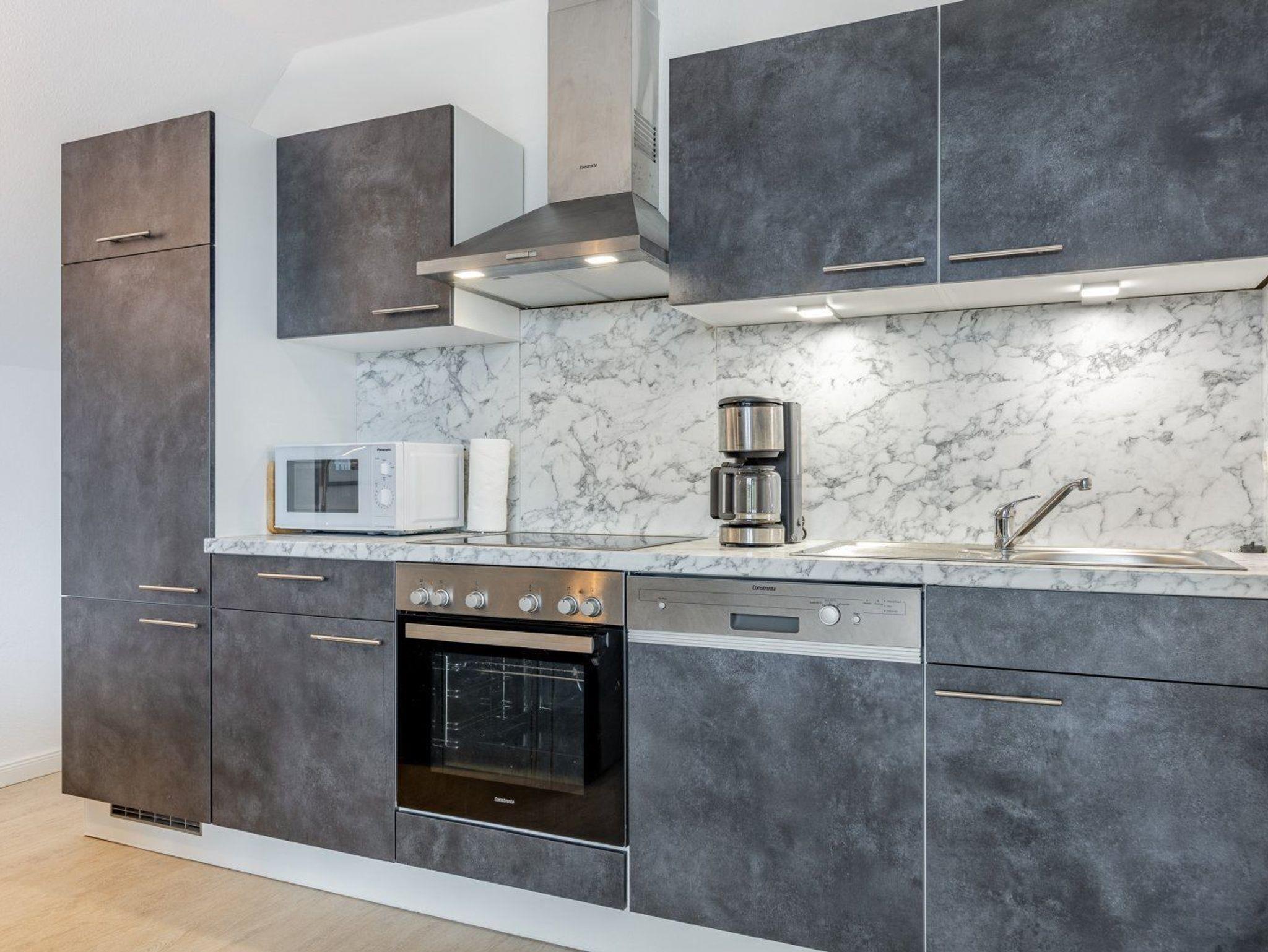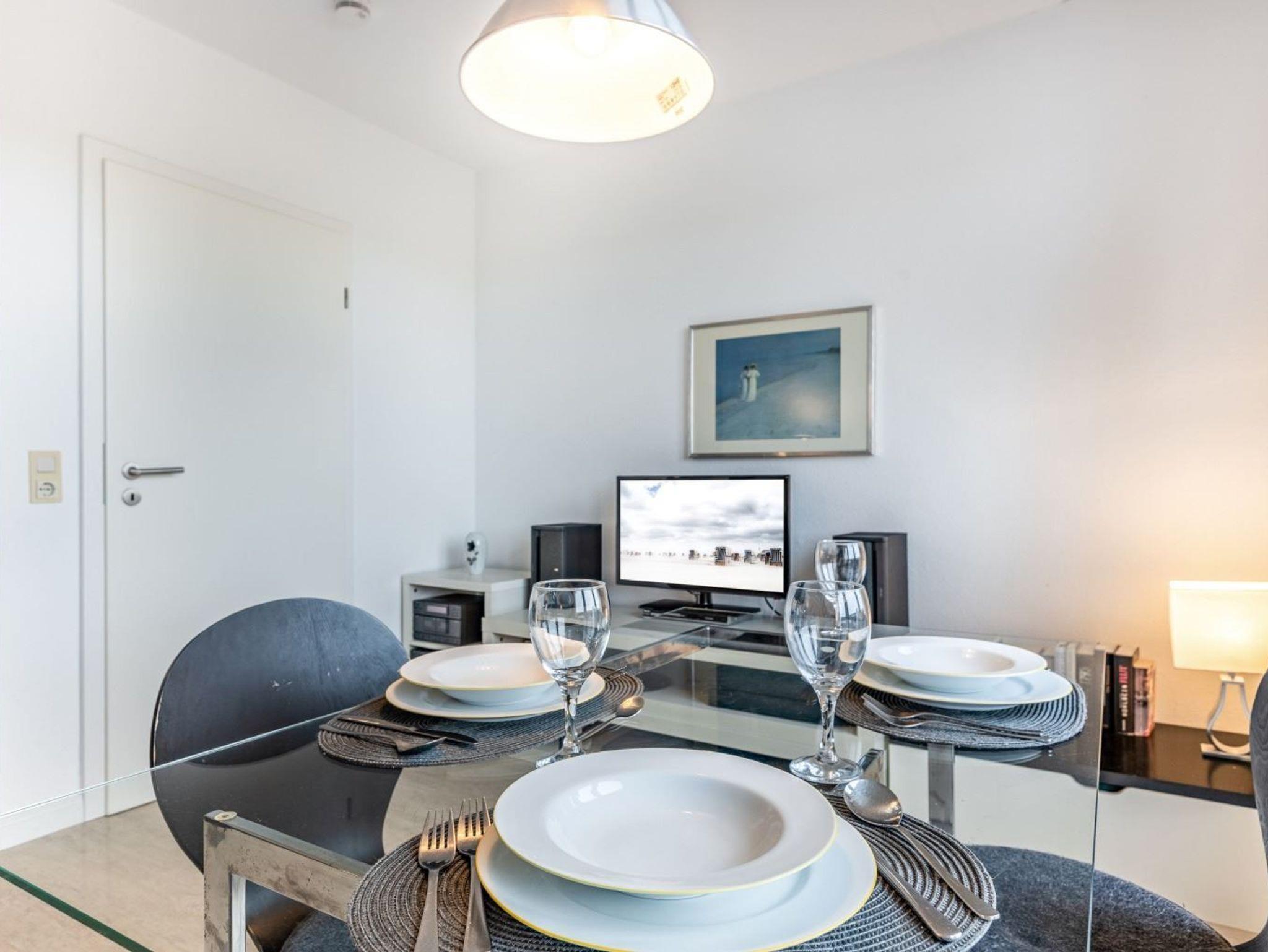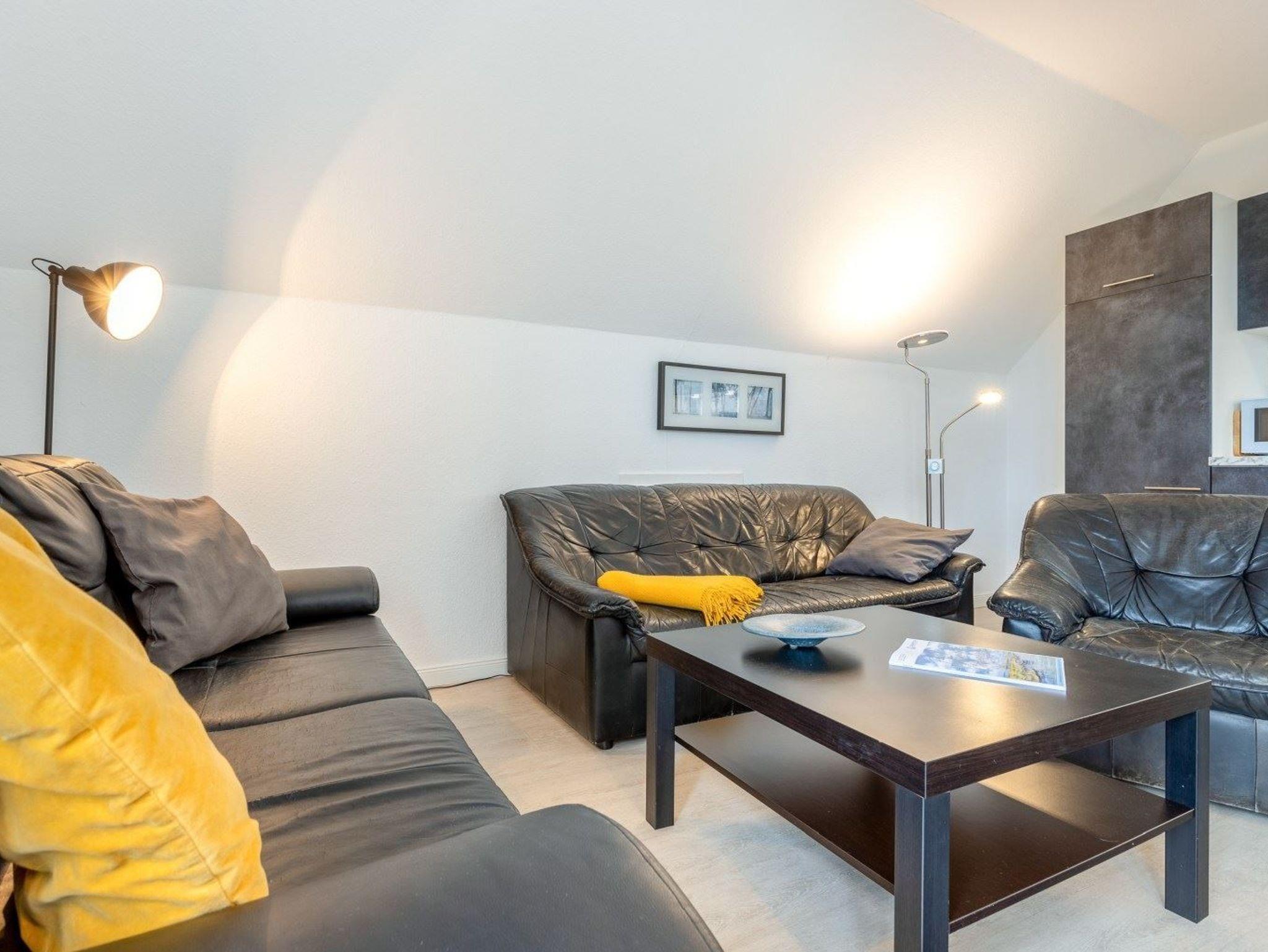 Wohnzimmer mit 2 Sofas, eines davon ist ein ausziehbares Schlafsofa (140x195cm), einem Sessel, Esstisch mit 4 Stühlen, TV (Sat), Stereo-Kompaktanlage und DVD-Player. Direkter Zugang zum möblierten Balkon zur Deichseite. Offene Küche mit Backofen, Mikrowelle, Geschirrspüler und Kühlschrank mit Gefrierfach.