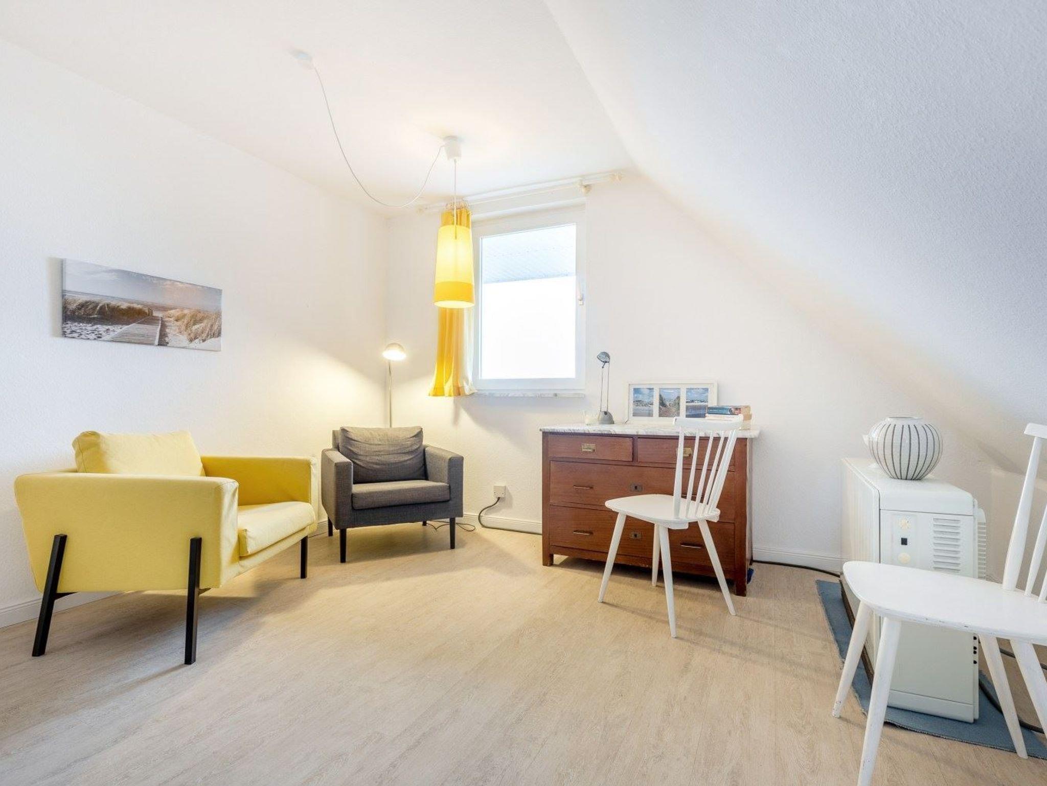 Schlafzimmer mit Doppelbett (2x 100x200cm), Einzelbett (90x200cm), Kleiderschrank, Kommode, Bücherregal mit Lektüre, Schaukelstuhl und vier weiteren Sitzgelegenheiten. Vom Schlafzimmer aus haben Sie einen kleinen Meerblick. Zum Schlafzimmer führt eine steile, schmale Treppe.