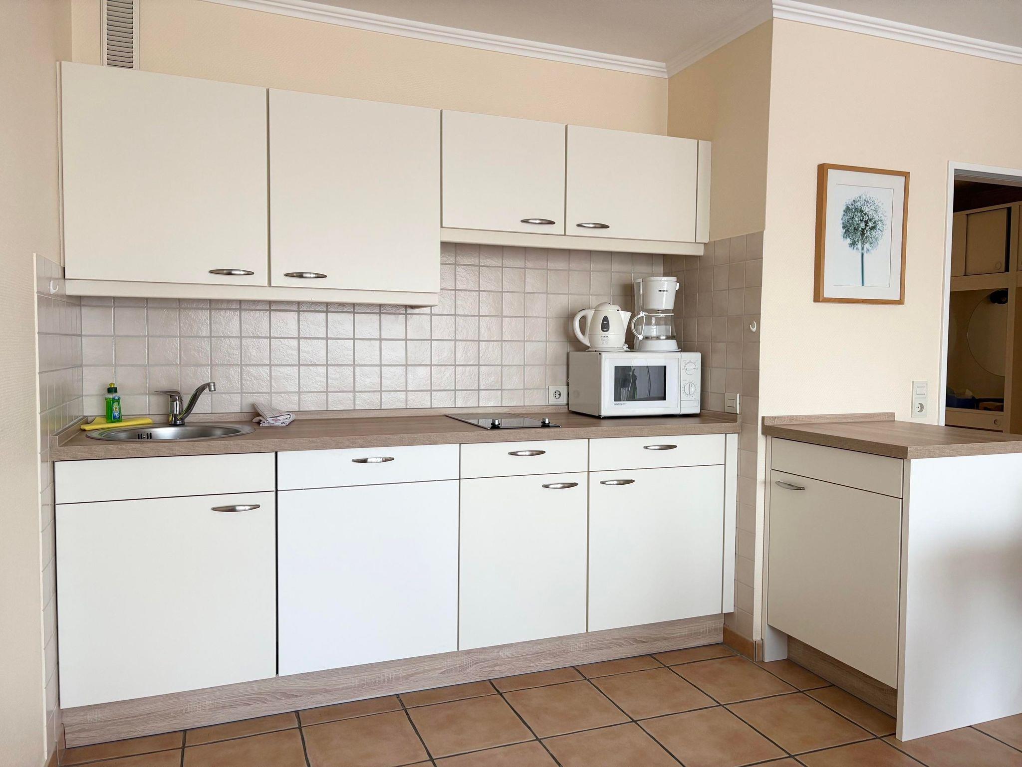 Schlafraum mit 2 Einzelbetten, Wohn-Schlafraum mit 2 Wandschrankbetten, Fliesenboden, Sitzecke, Essecke, Küchenzeile, Mikrowelle, Kabel-TV, Dusche/WC, Durchwahltelefon, Balkon, PKW-Platz Nr. 25, Aufzug und Fahrradkeller.