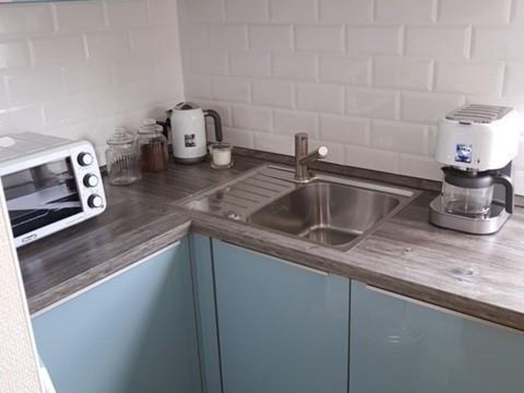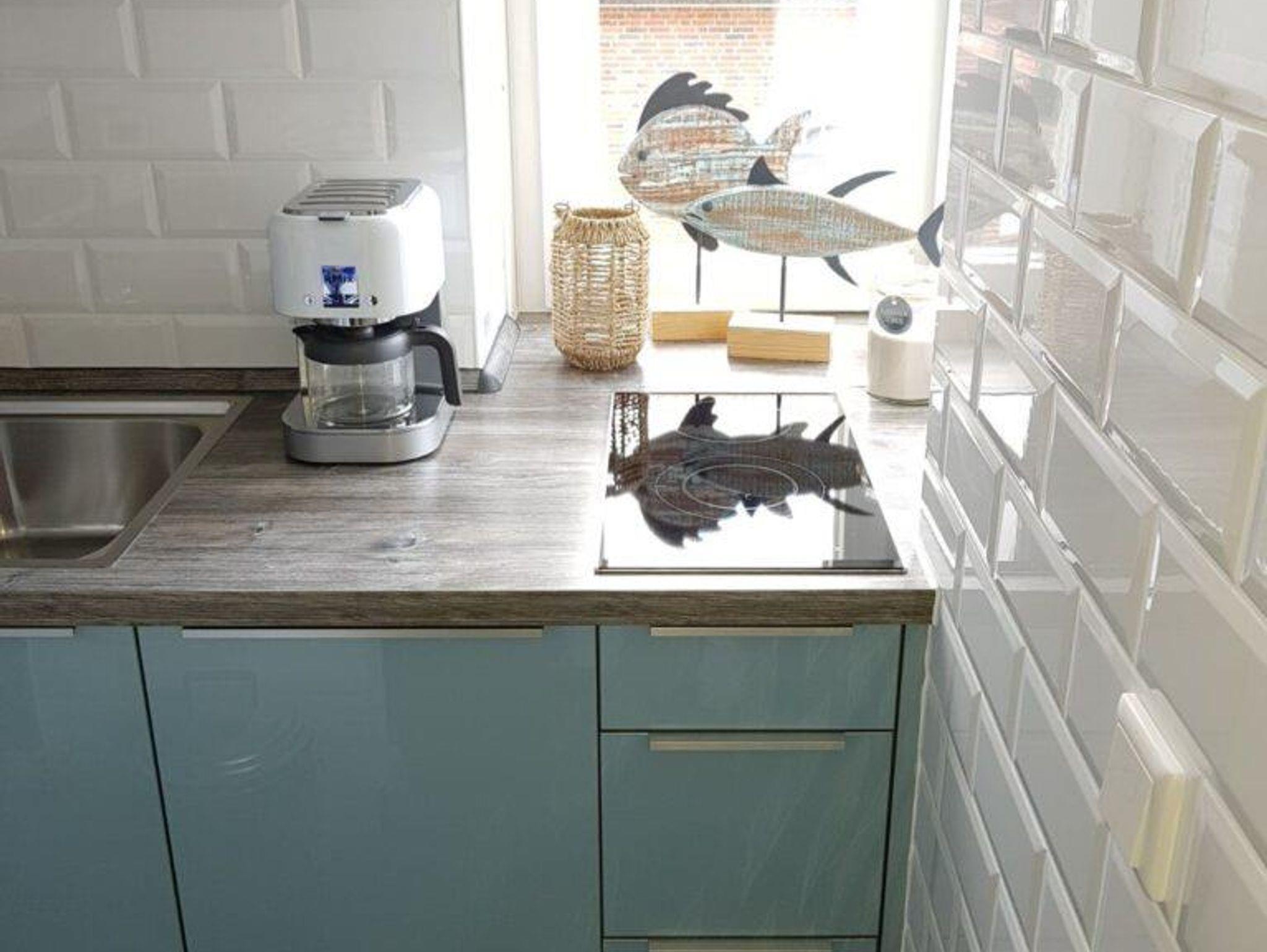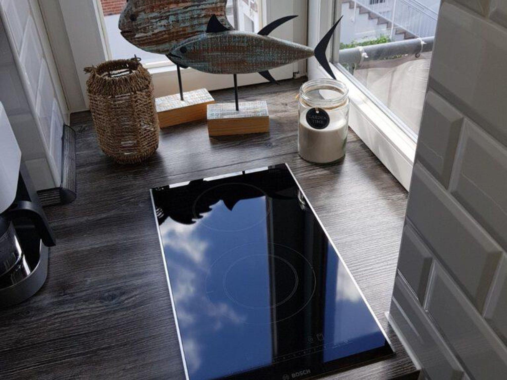 Kleine Küche mit 2-Platten- Cerankochfeld, Geschirrspülmaschine, kleiner Backofengrill.