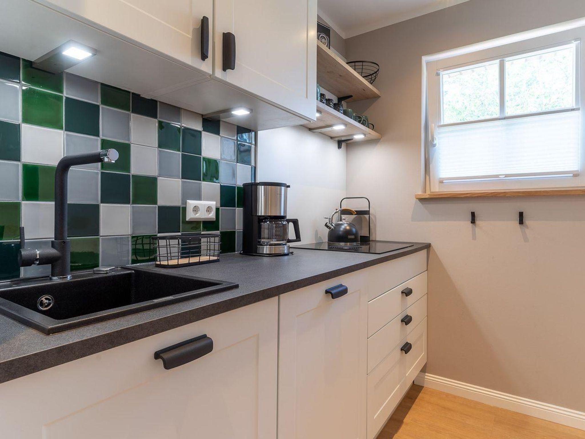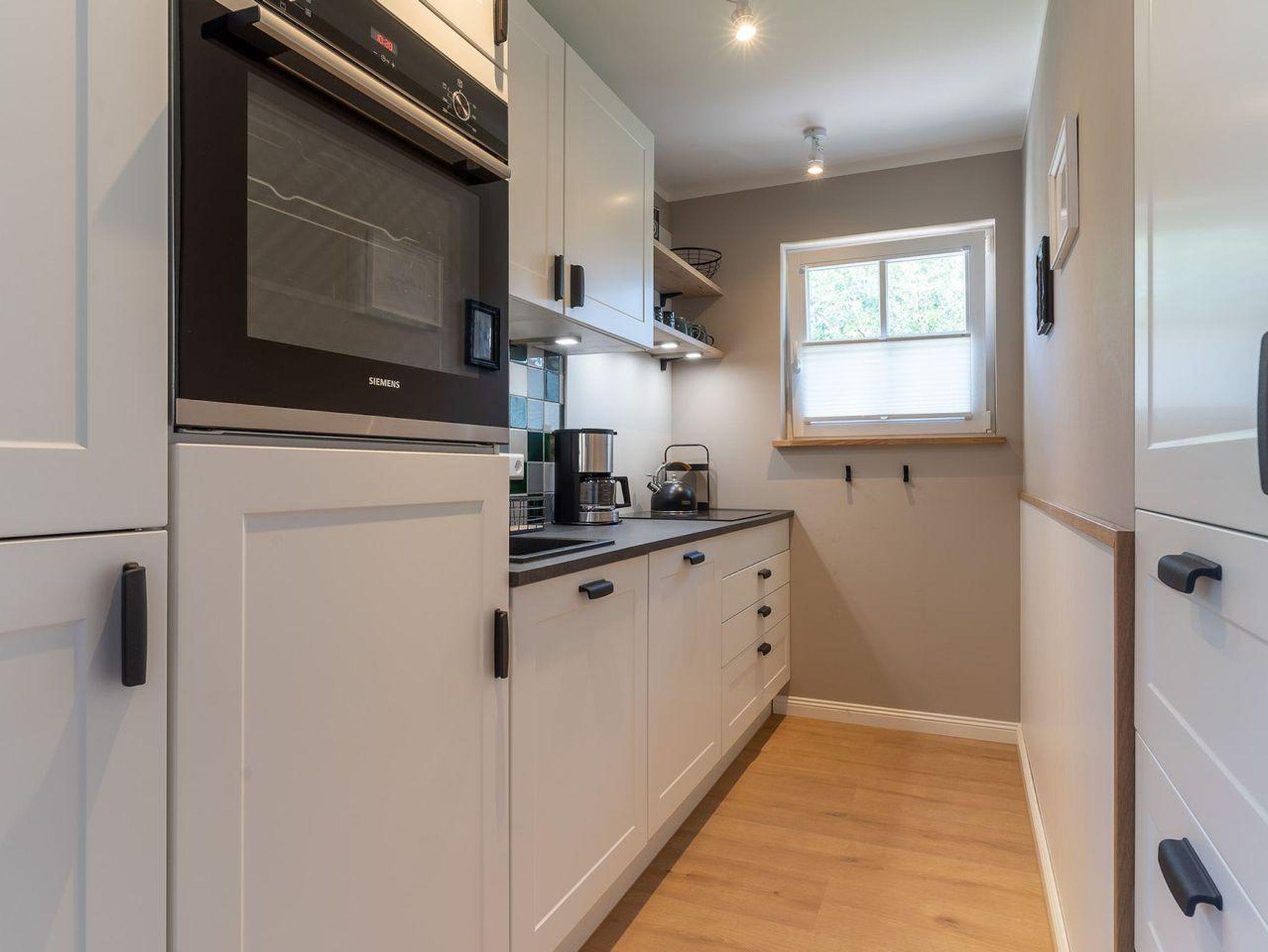 Im Erdgeschoss befindet sich ein großzügiger Wohnraum mit TV und einer modernen Wohnküche. Die Küche ist voll ausgestattet und verfügt über hochwertige Elektrogeräte.