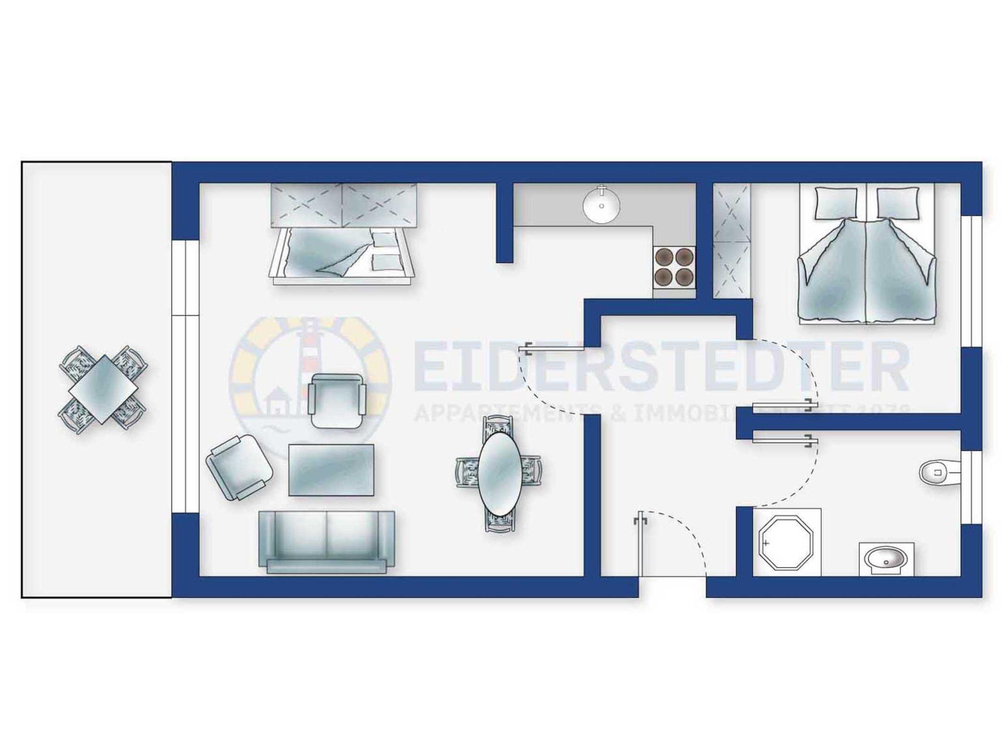 Gemütliche 2-Zimmer-Ferienwohnung im Haus Pole Poppenspäler mit ca. 42qm auf 1 Ebene (2. OG) für bis zu 2 Personen. Strand- und zentrumsnahe Lage im Ortsteil Bad in St. Peter-Ording. Zur Promenade, dem Strand, der Dünentherme und allen Restaurants und Geschäften des Kurzentrums sind es nur wenige Gehminuten.