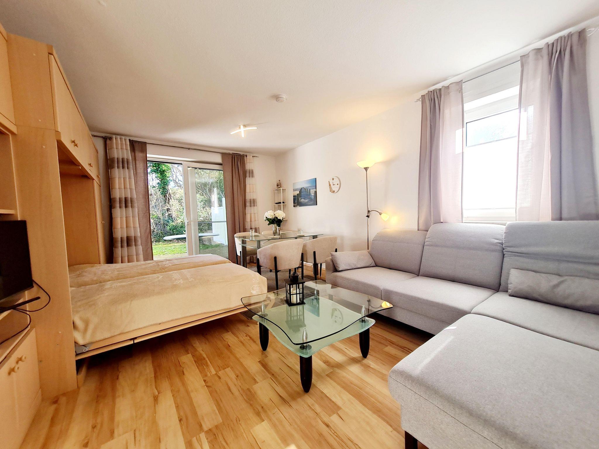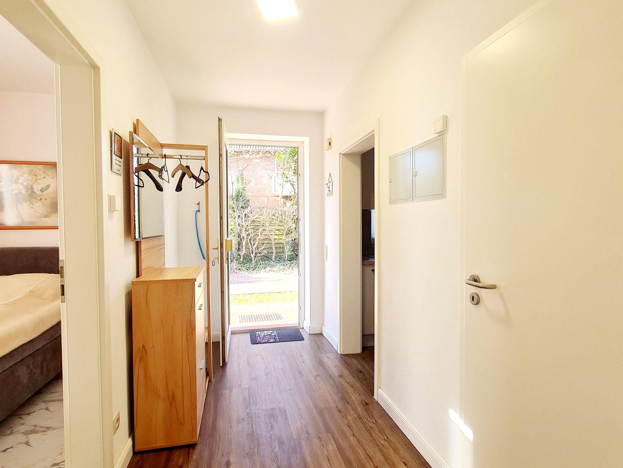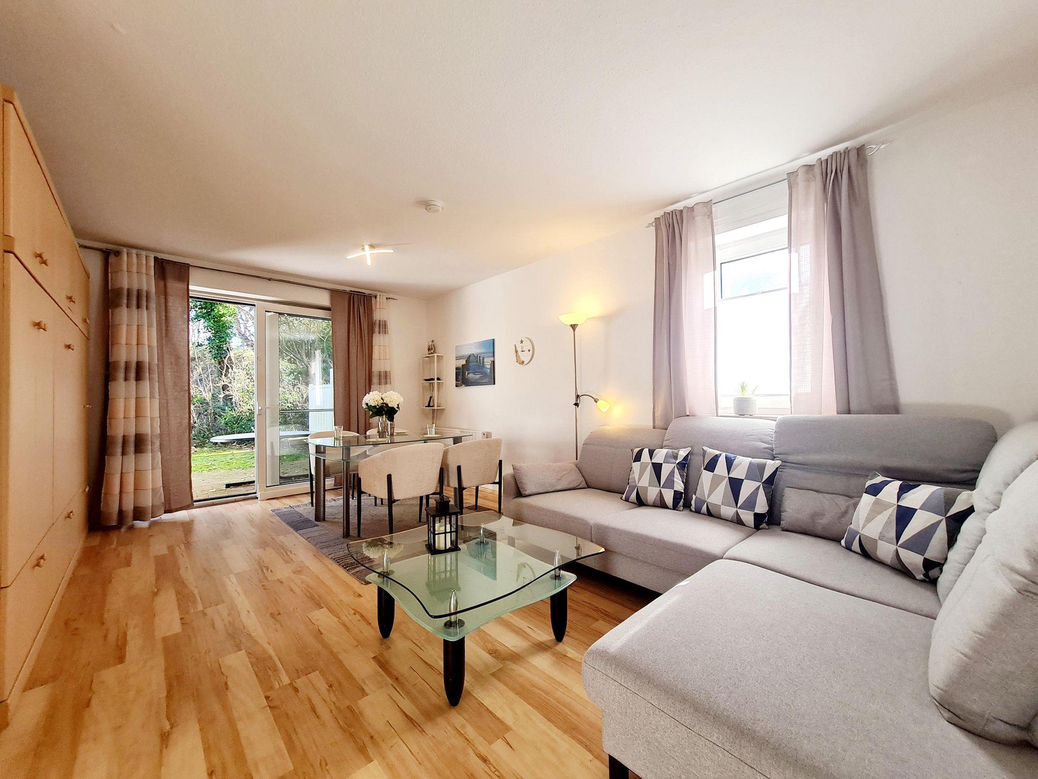 Die Ferienwohnung hat eine gute Raumaufteilung und ist komplett ausgestattet. 1 Wohnschlafraum (Laminat neu verlegt) mit einzelnen Schrankbetten sowie Kabel-Farb-TV (Flachbild), Radio/CD-Player sowie moderne Essecke. 1 Schlafraum (komplett neu eingerichtet, u.a. mit Gesundheitsmatratzen sowie neuem Laminatboden). Vollständig ausgestattete Küche (u.a. mit Geschirrspüler, Ceran-Kochfeld, Backofen usw.). In 2013 komplett renoviertes Bad mit ebenerdiger Dusche und WC. Flur. Möblierte Terrasse. Mückenschutz vor allen Fenstern! Telefon und W-Lan (W-Lan o. Zusatzgebühr). Zur Wohnung gehört der Pkw-Stellplatz Nr. 3. Hunde nach Absprache erlaubt! Bettwäsche und Handtücher können als Zusatzleistung hinzugebucht werden.