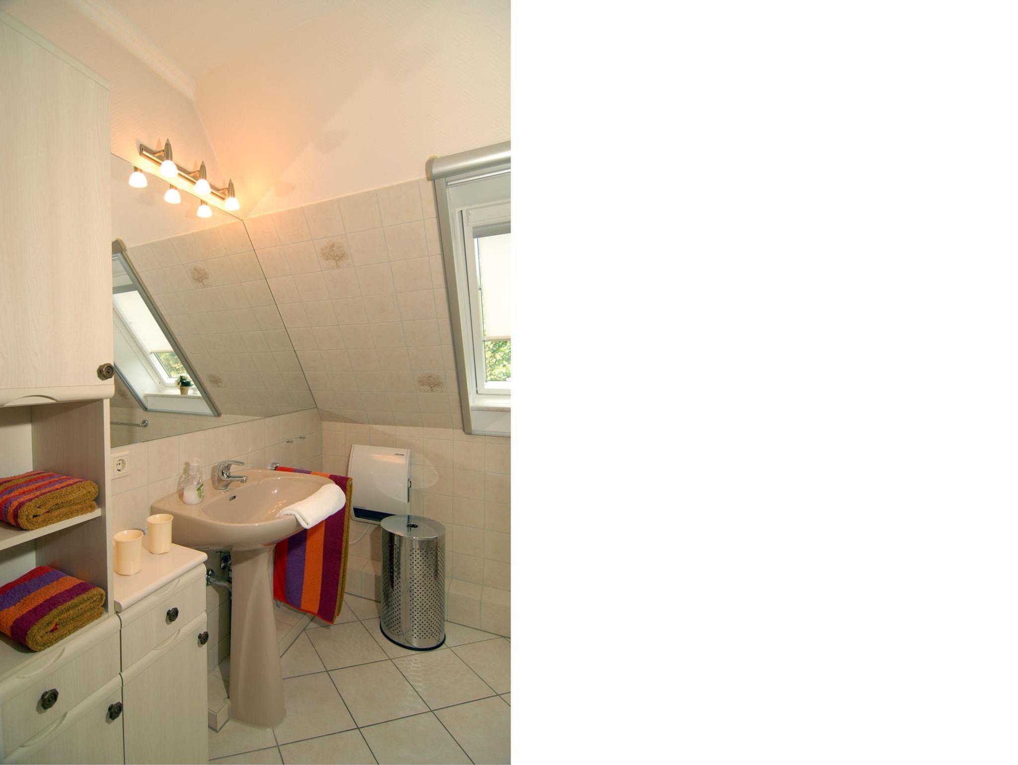 Bad: Dusche, Waschbecken, WC, Duschkabine, Hocker, Fön, Spiegel, Schrank, Wäscheeimer