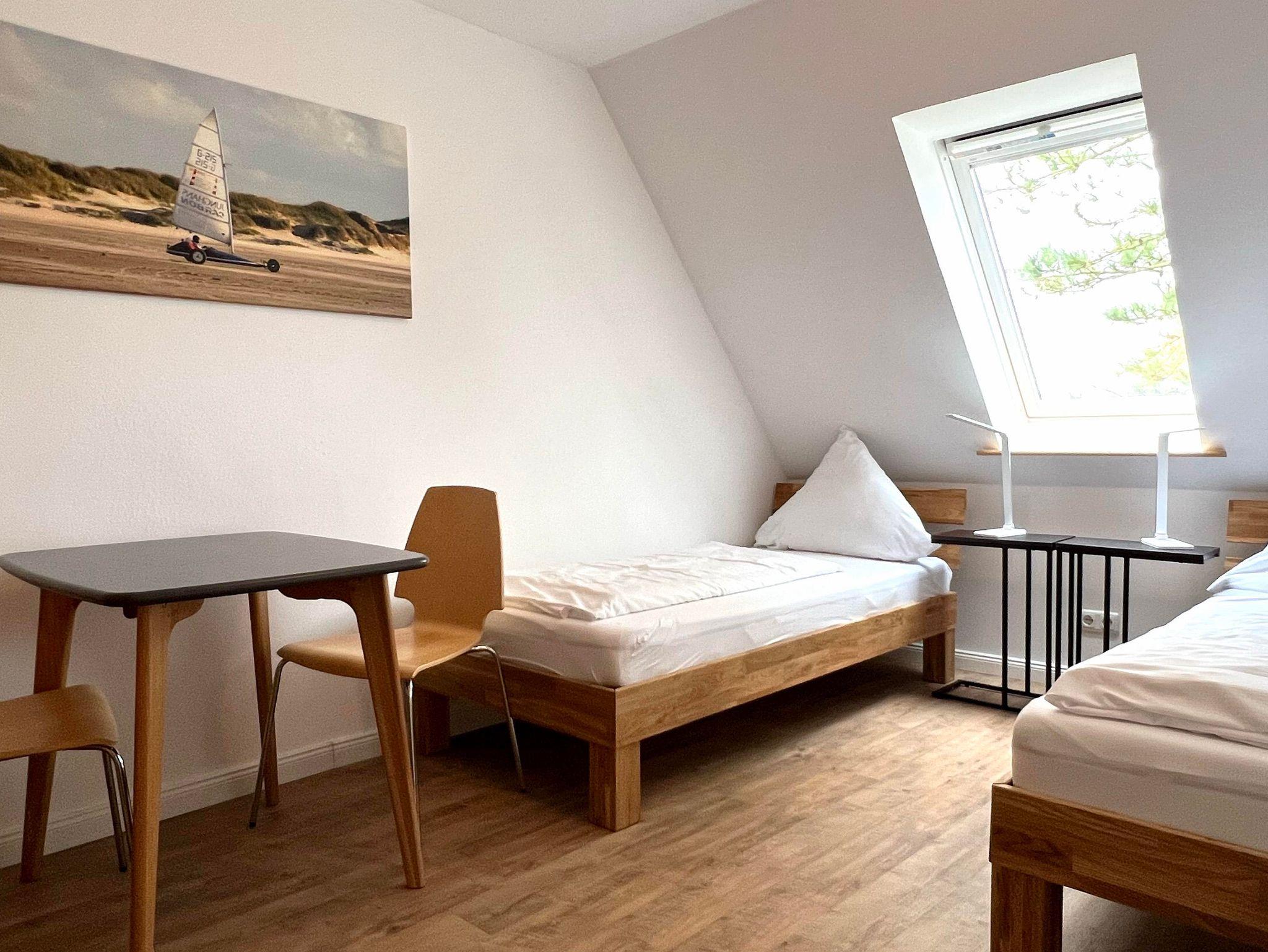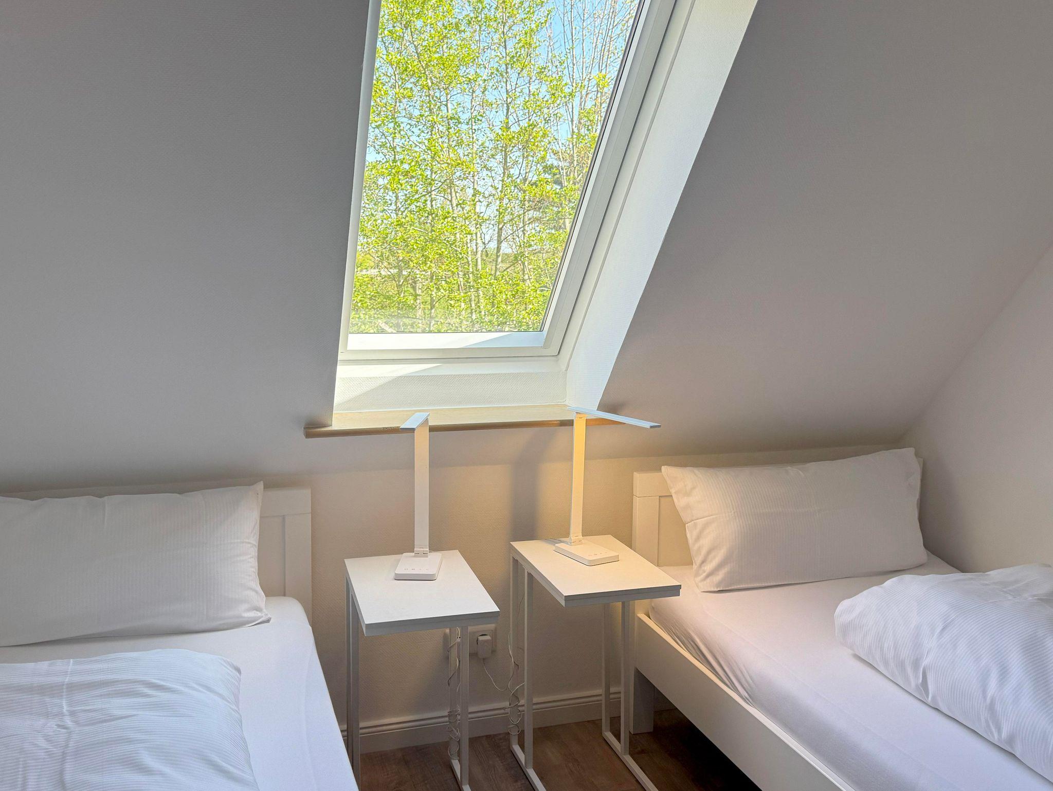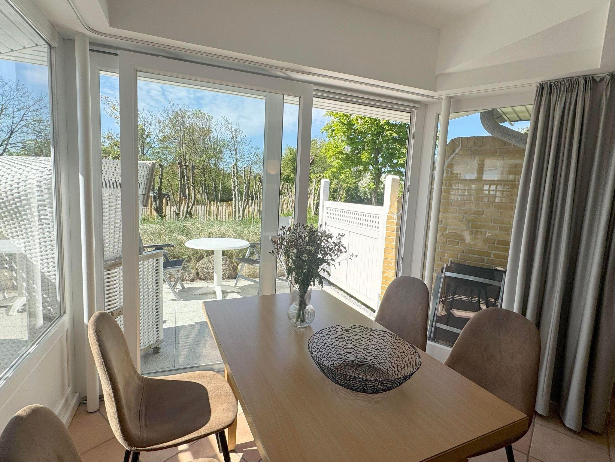 Im Erdgeschoss befindet sich die Eingangsdiele mit einer gradläufigen Treppe nach oben zu den beiden Schlafzimmern.1 Schlafraum mit Doppelbett 180x200cm mit getrennten Matratzen, ein Schlafraum mit 2 Einzelbetten (90x200cm). Das Zustellen eines Kinderreisebettes oder Hochstuhles ist kein Problem. Abgehend von der Eingangsdiele, der Wohn-Essraum mit voll ausgestatteter Küchenzeile, gemütlicher Sitzecke und Essecke im raumhoch verglasten Wintergarten, direkter Zugang zu einer, mit einer kleinen Sanddüne eingefassten Terrasse und Garten. Das Duschbad ist komplett neu in 2018, ausgestattet mit begehbarer Dusche, WC, Waschbecken und Außenfenster.