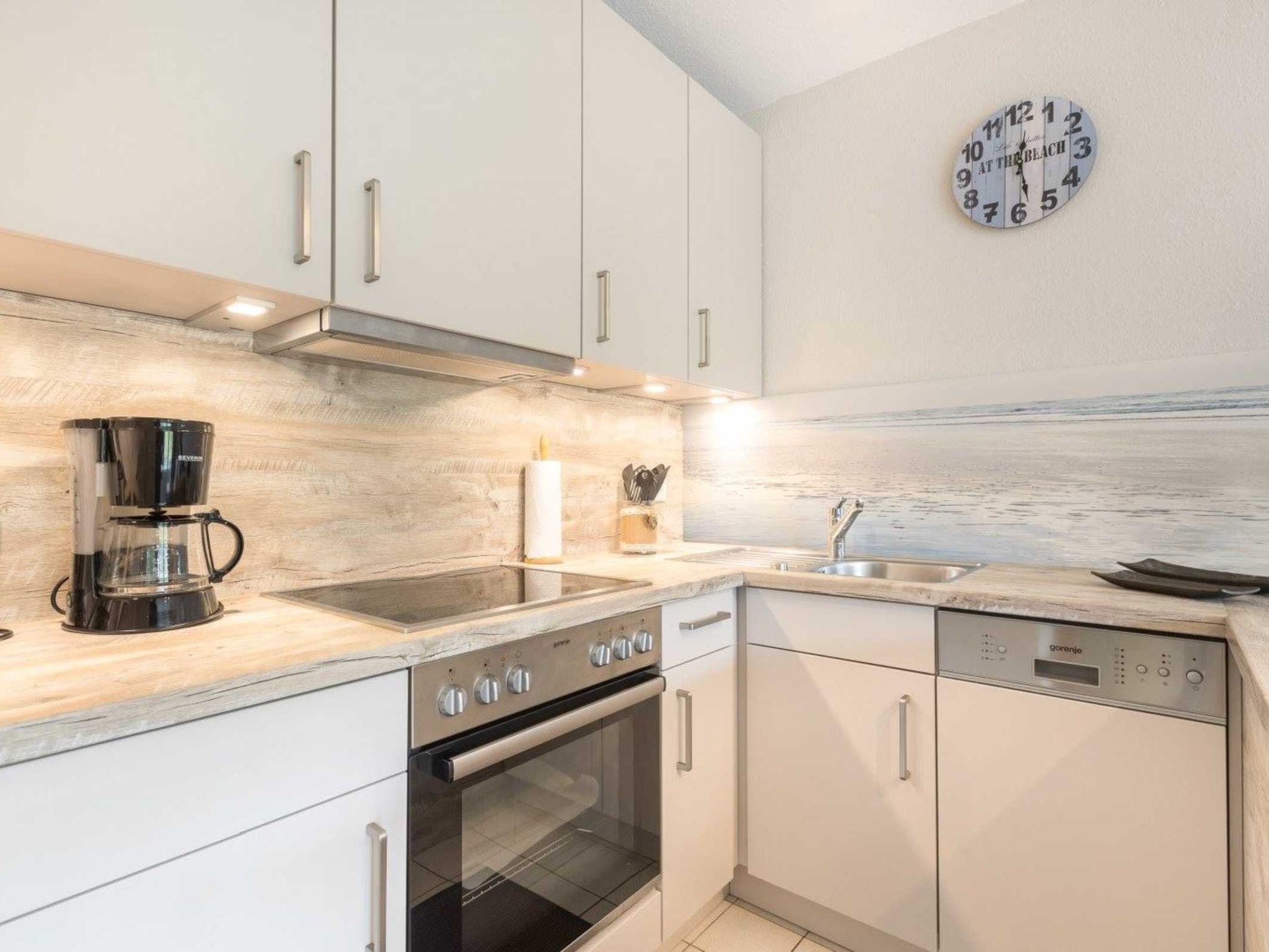 Modernes und elegantes Wohnzimmer mit Lederecksofa, Ruhesessel, TV (Sat) und Esstisch mit 4 Stühlen. Direkter Zugang zur möblierten und überdachten Gartenterrasse nach Westen mit Grillmöglichkeit. Offene Küche mit Backofen, Geschirrspüler und Kühlschrank mit Gefrierfach.