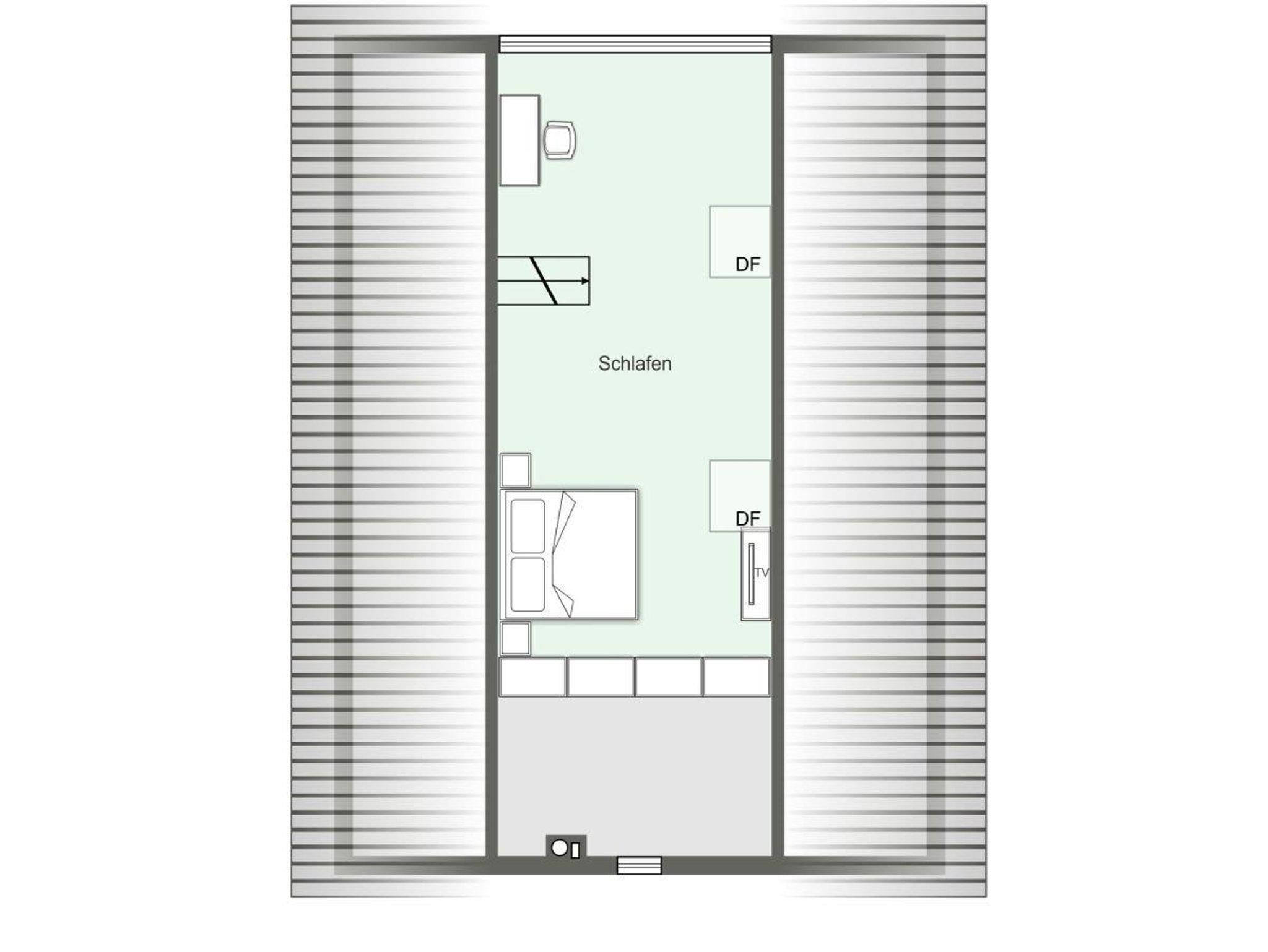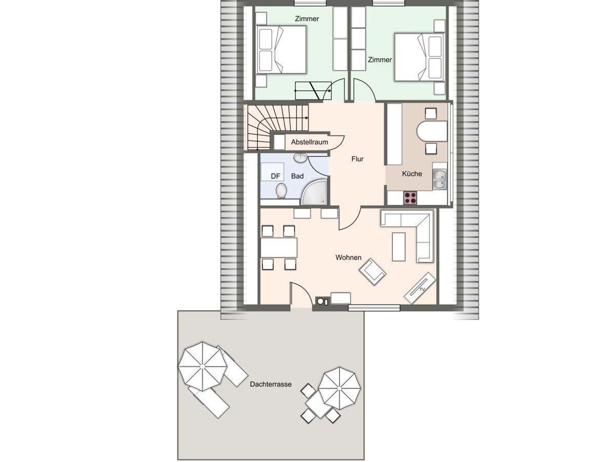 Drei Schlafzimmer mit jeweils einem 180cm Doppelbett über zwei Etagen, eine abgeschlossene Küche mit Ceranfeld, Backofen und Mikrowelle, grozügiges Wohnzimmer mit Essbereich und Zugang zur großen Dachterrasse mit Gartenmöblierung.