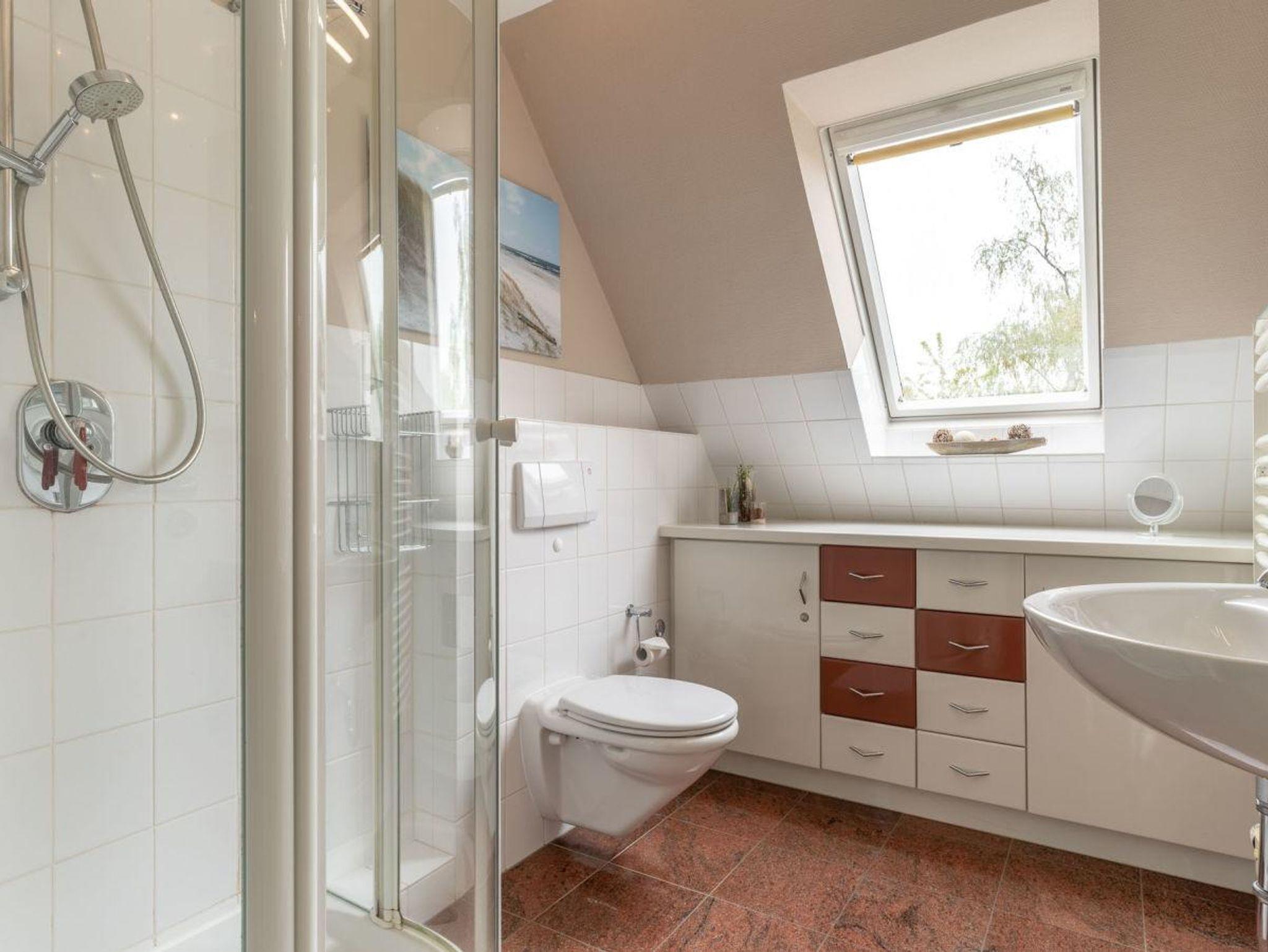 Das Bad verfügt über eine Dusche. Im Wirtschaftsraum befindet sich eine Waschmaschine.
