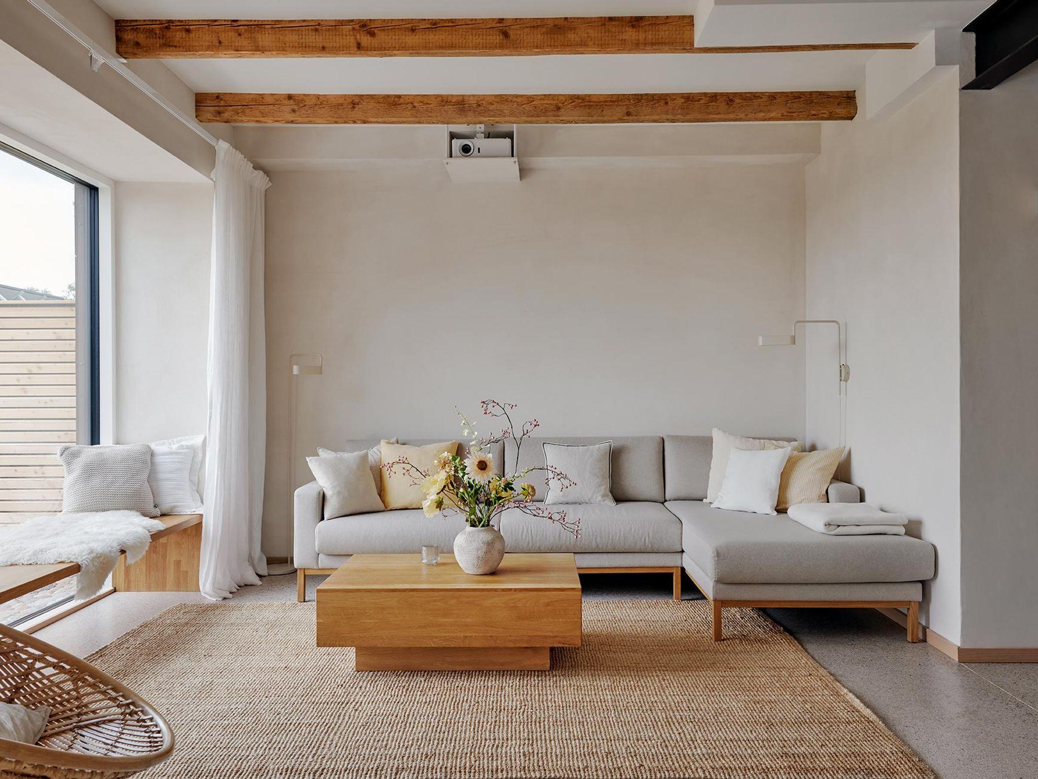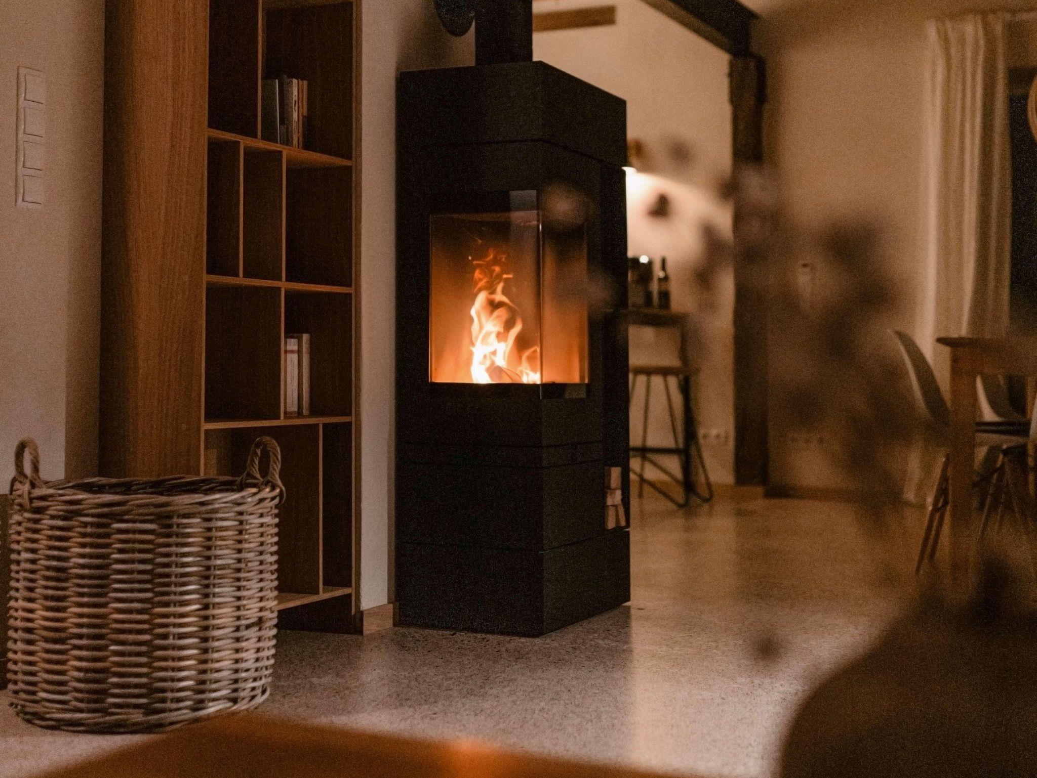 Wohnbereich mit Kamin, großer Couch und Esstisch mit sechs Stühlen. Vollausgestattet Küche (u.a. Induktionsherd, Backofen und Kühlschrank).