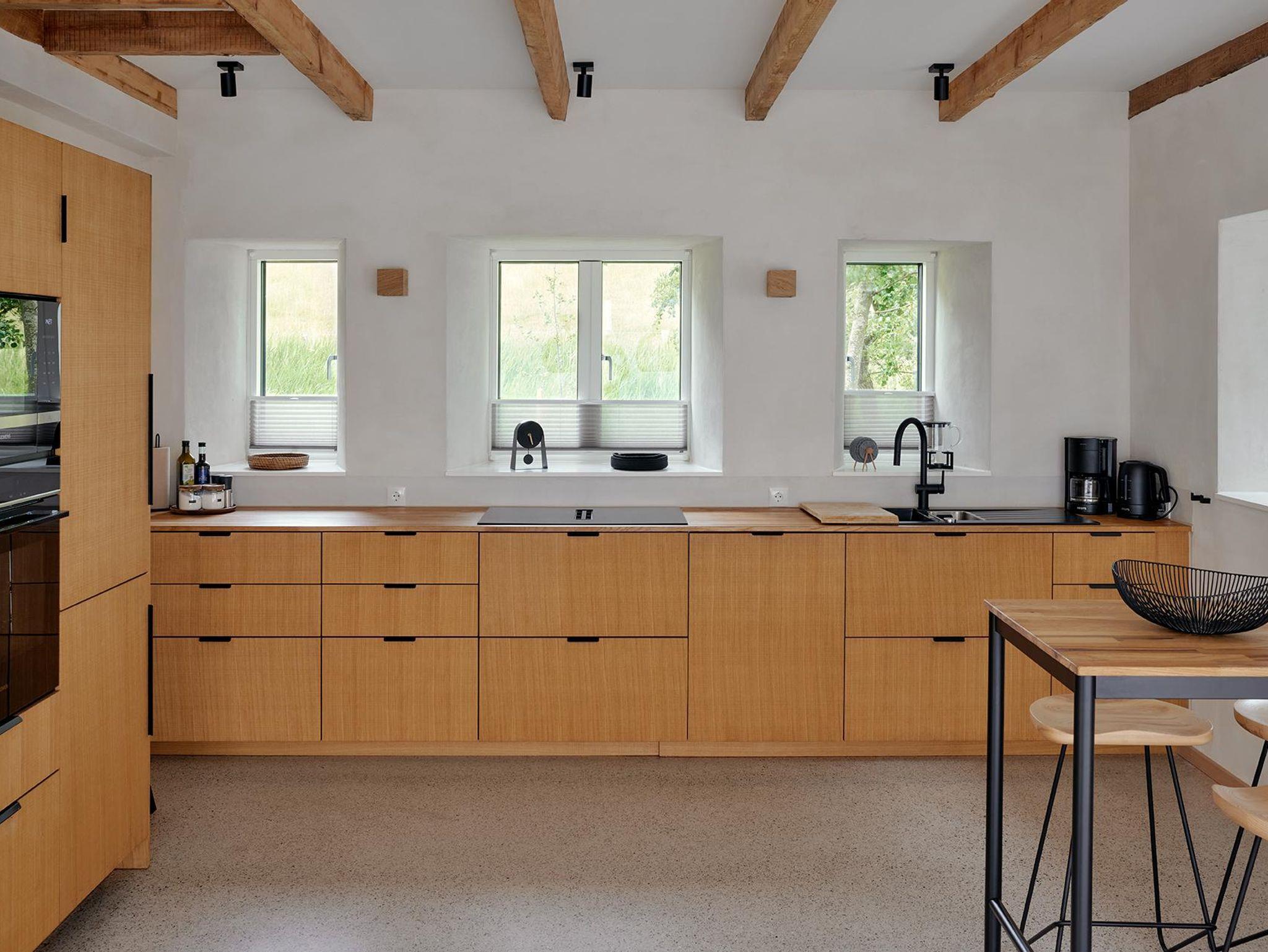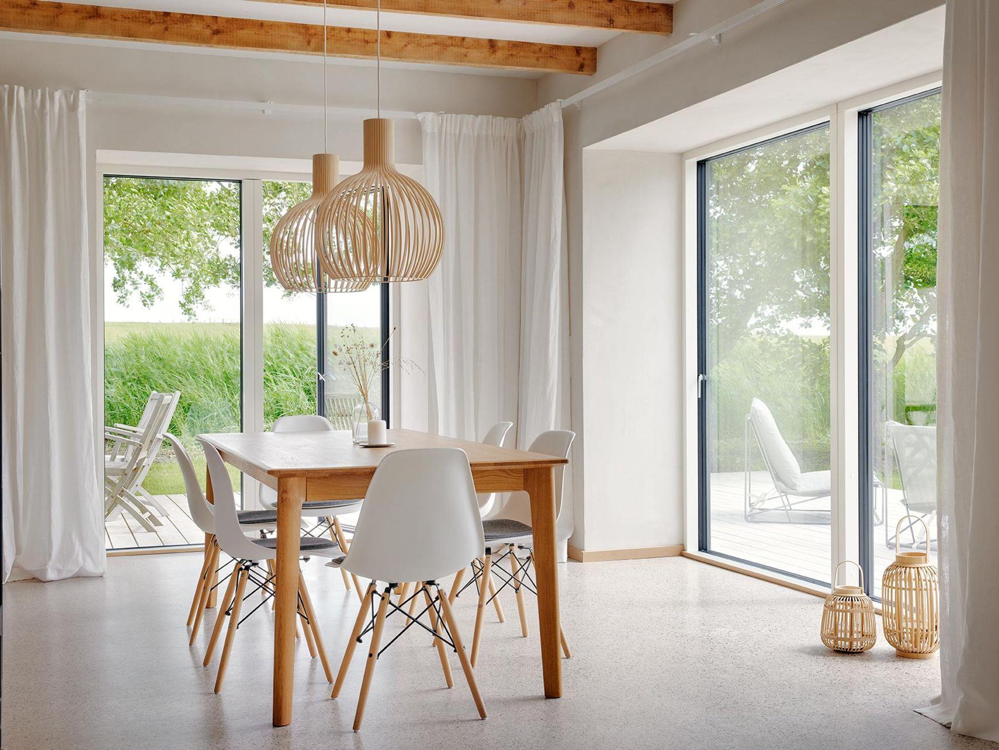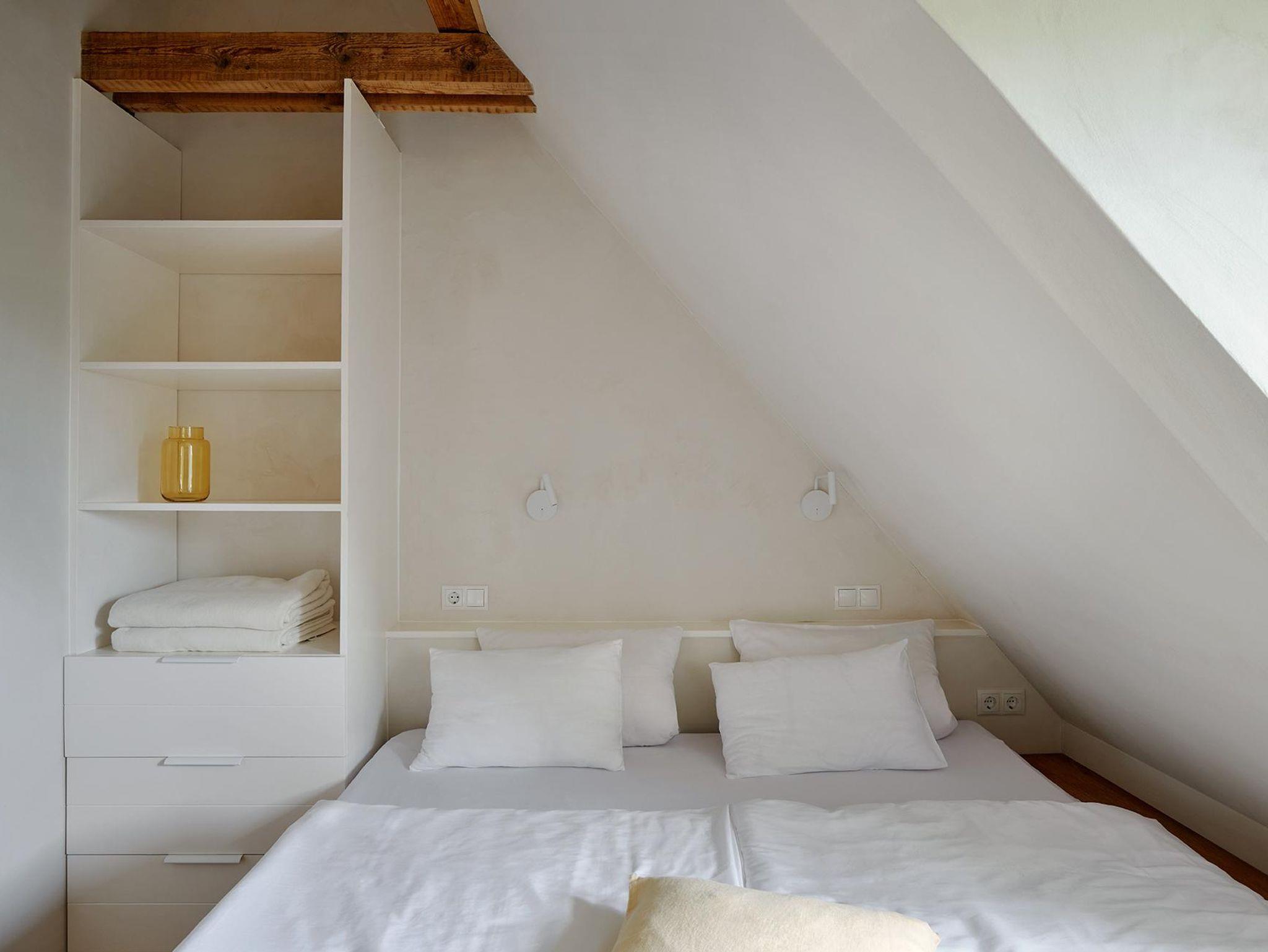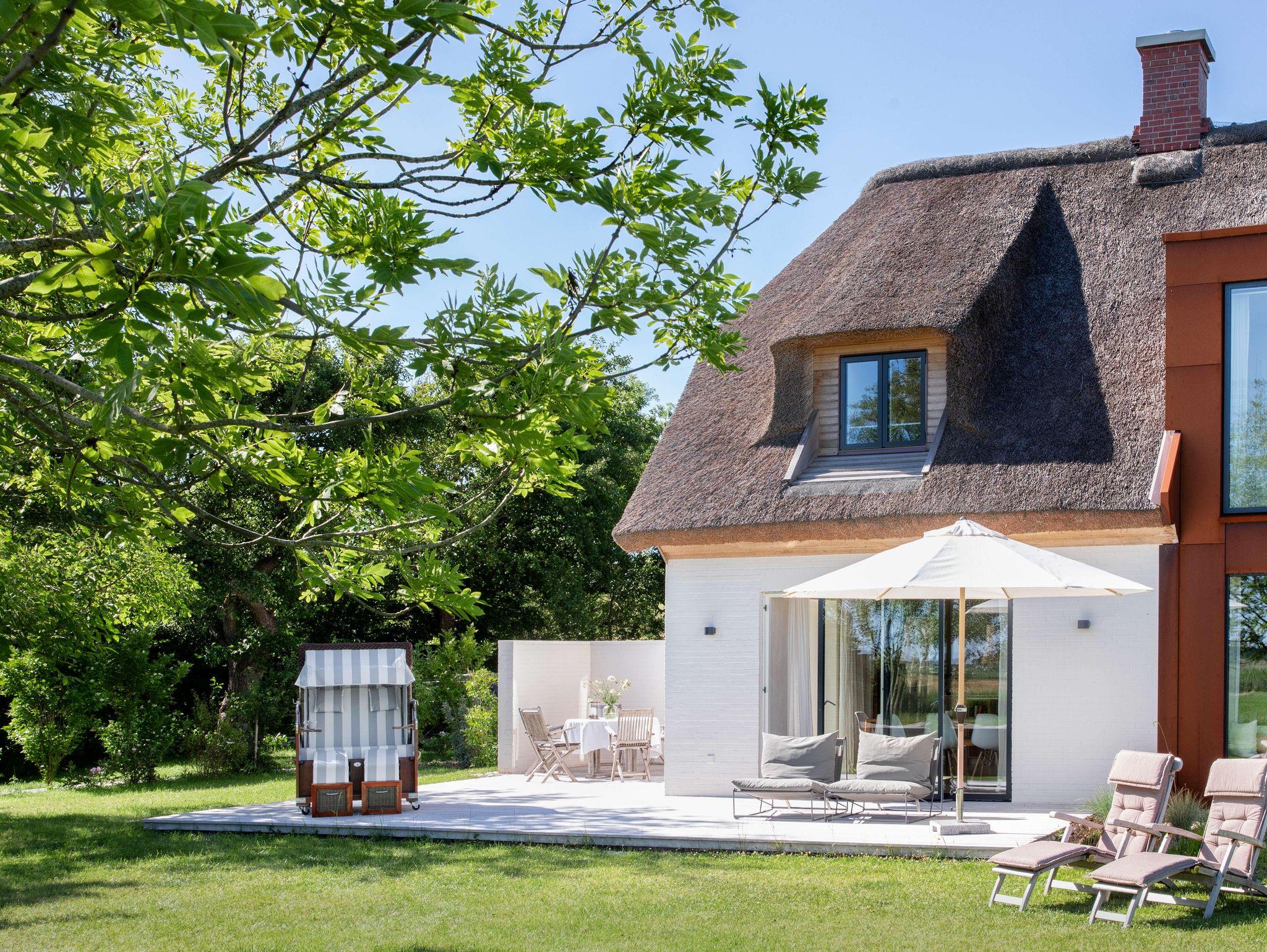 Der großzügige Wohnraum öffnet sich nach Süden und Osten mit bodentiefen Fenster- und Türelementen zu einer weiträumigen Holzterrasse und schafft so einen fließenden Übergang zwischen Innen und Außen, zur Weite der Wiesenlandschaft Eiderstedts. Das norderdiekhuus mit der großen, sehr gut ausgestattete Küche, mit dem breiten Sofa am Fenster mit Weitblick sowie den drei sehr gemütlichen Schlafzimmer im Obergeschoss, eins davon mit Bad en suite, bietet Platz für bis zu sechs Gäste. Die Ferienwohnung ist komplett mit Fussbodenheizung ausgestattet.