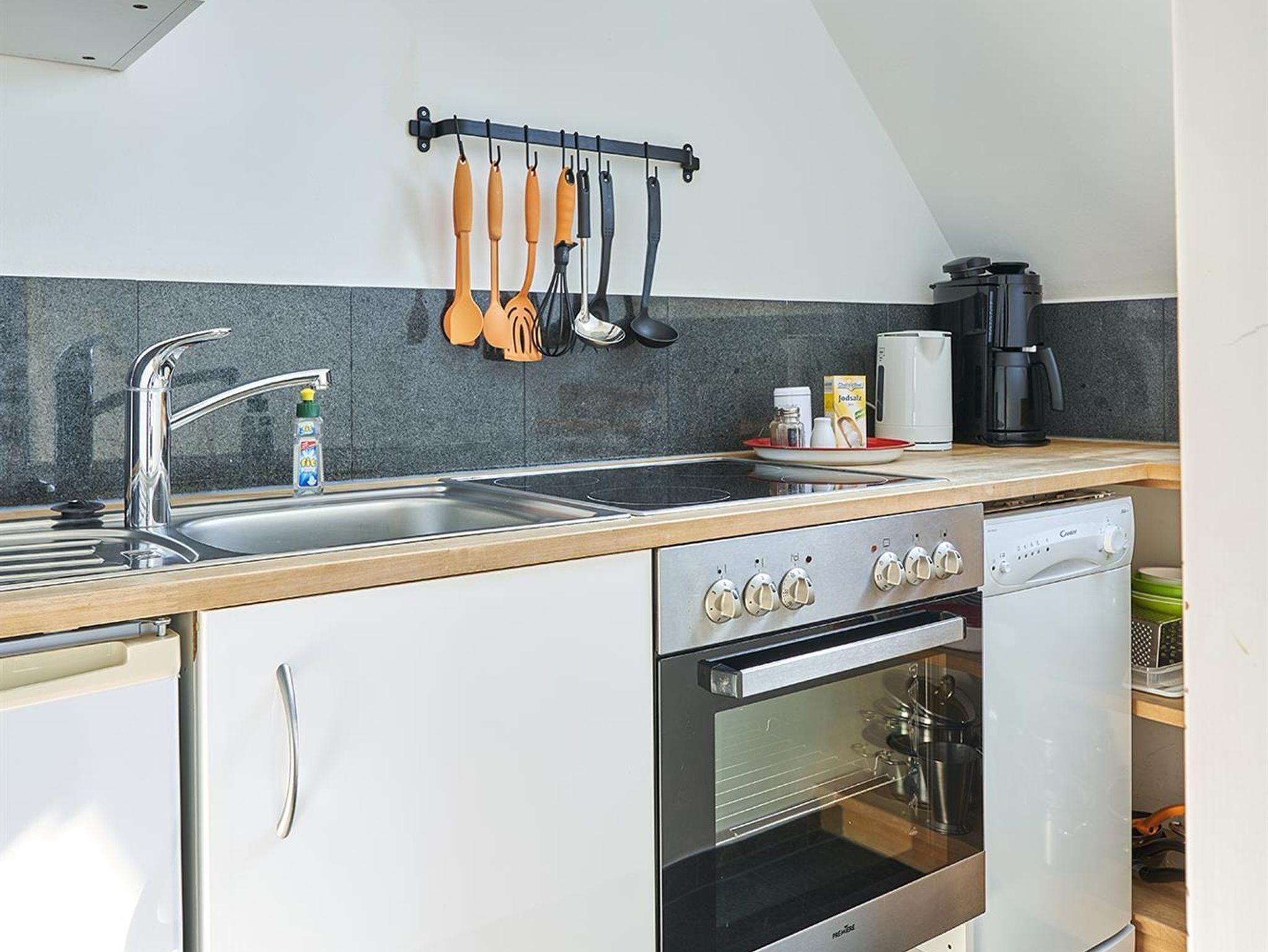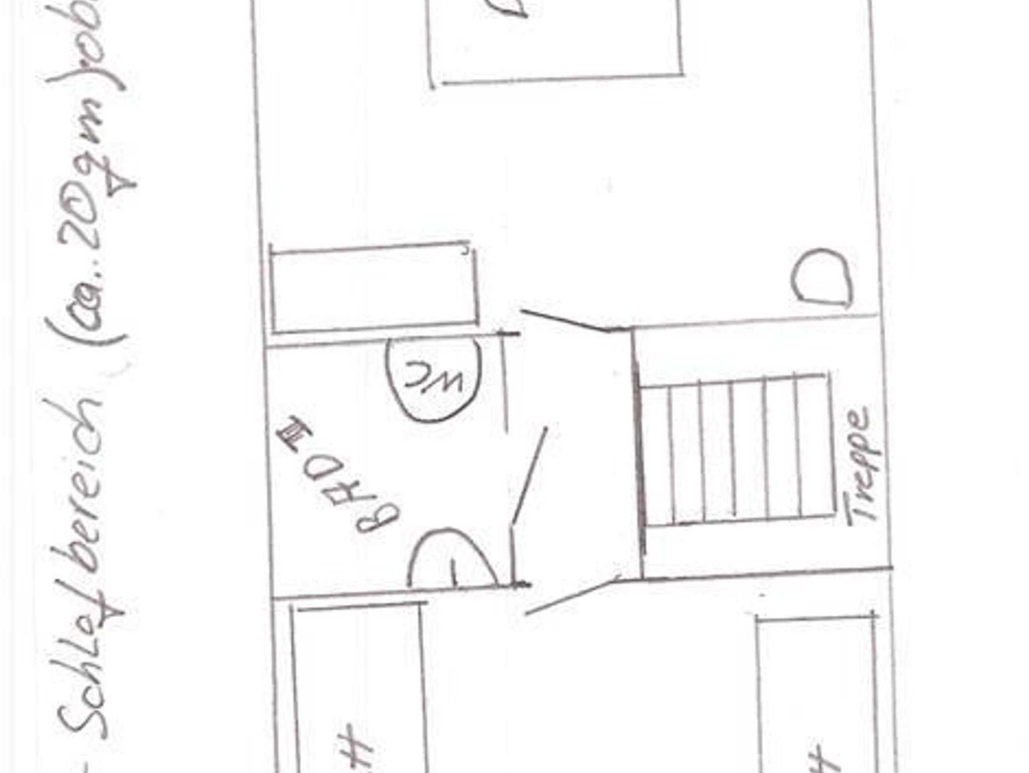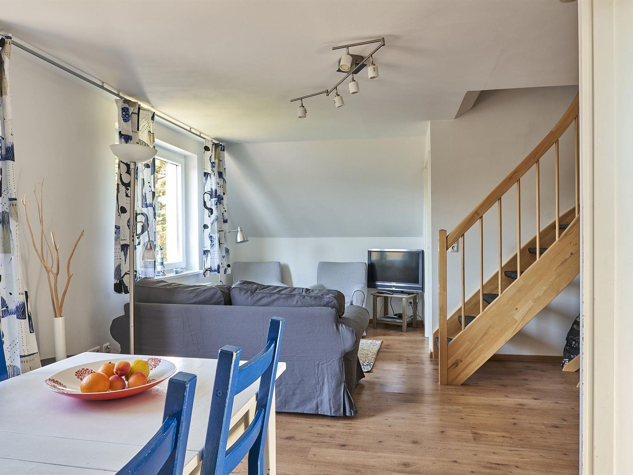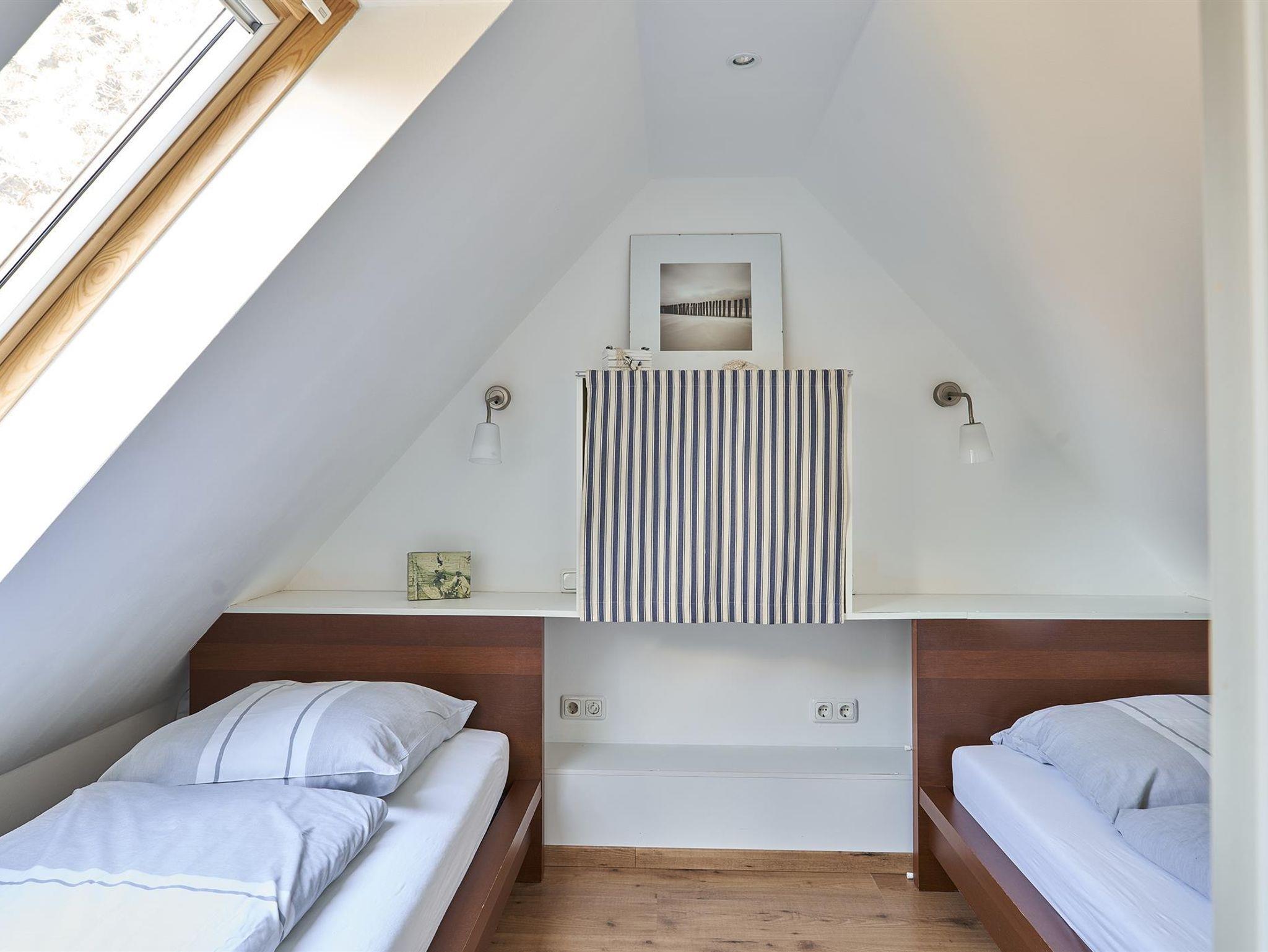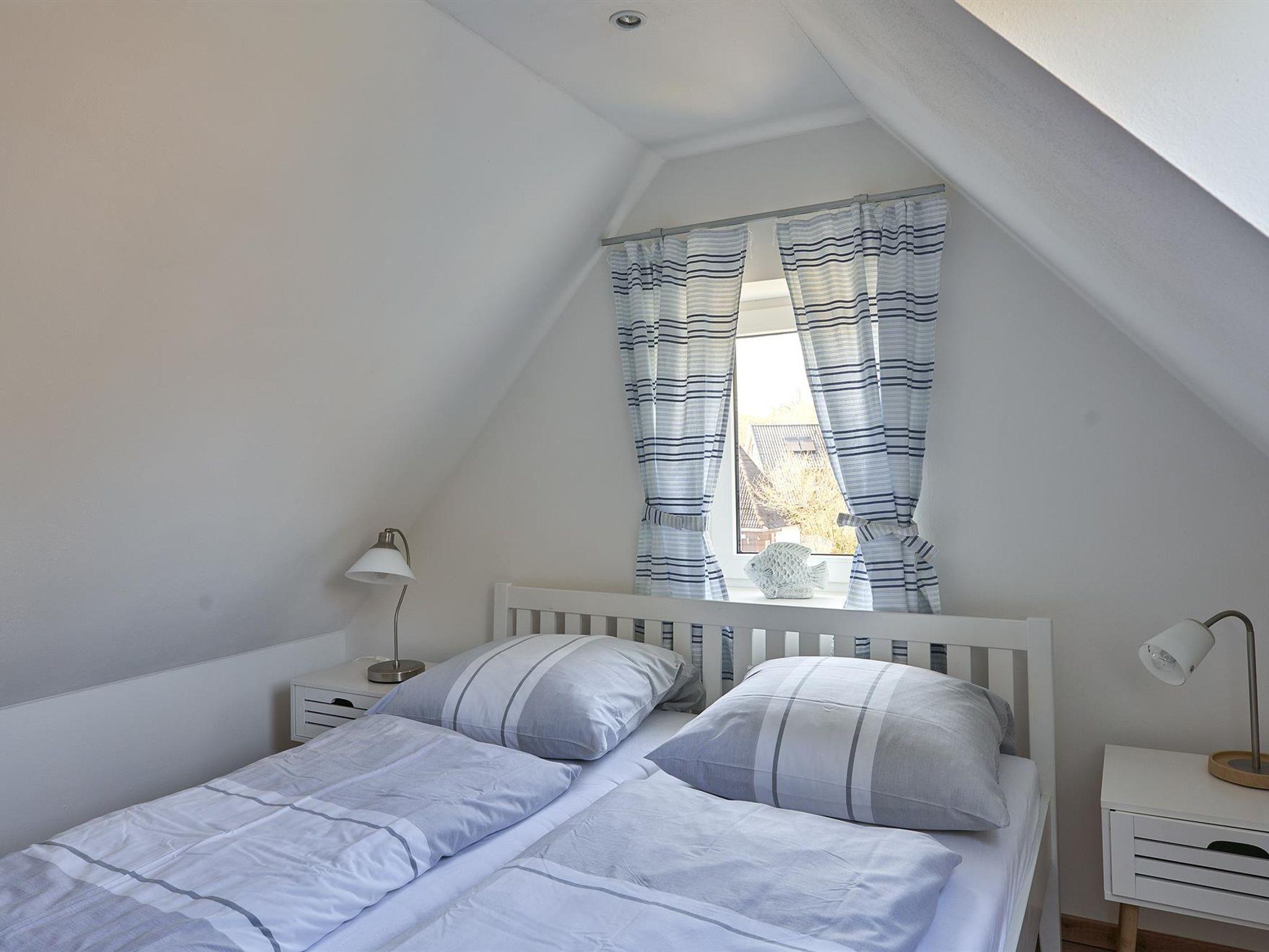 zwei gemütliche Schlafzimmer im Dachgeschoss (1 Doppelbett 1,60cm x 2,00 m, 2 Einzelbetten 0,90x2,00 m und 1,00 x 2,00m), dazwischen ein kleine Bad. Die kleine Küche ist mit Kühlschrank Herd,Backofen, Dunstabzugshaube, Mikrowelle und Geschirr, Besteck , Gläsern top- ausgestattet, Im offenen Wohn-Esszimmer haben Sie ein Smart-TV, Bücher und Spiele. Danebein liegt das moderne Badezimmer.