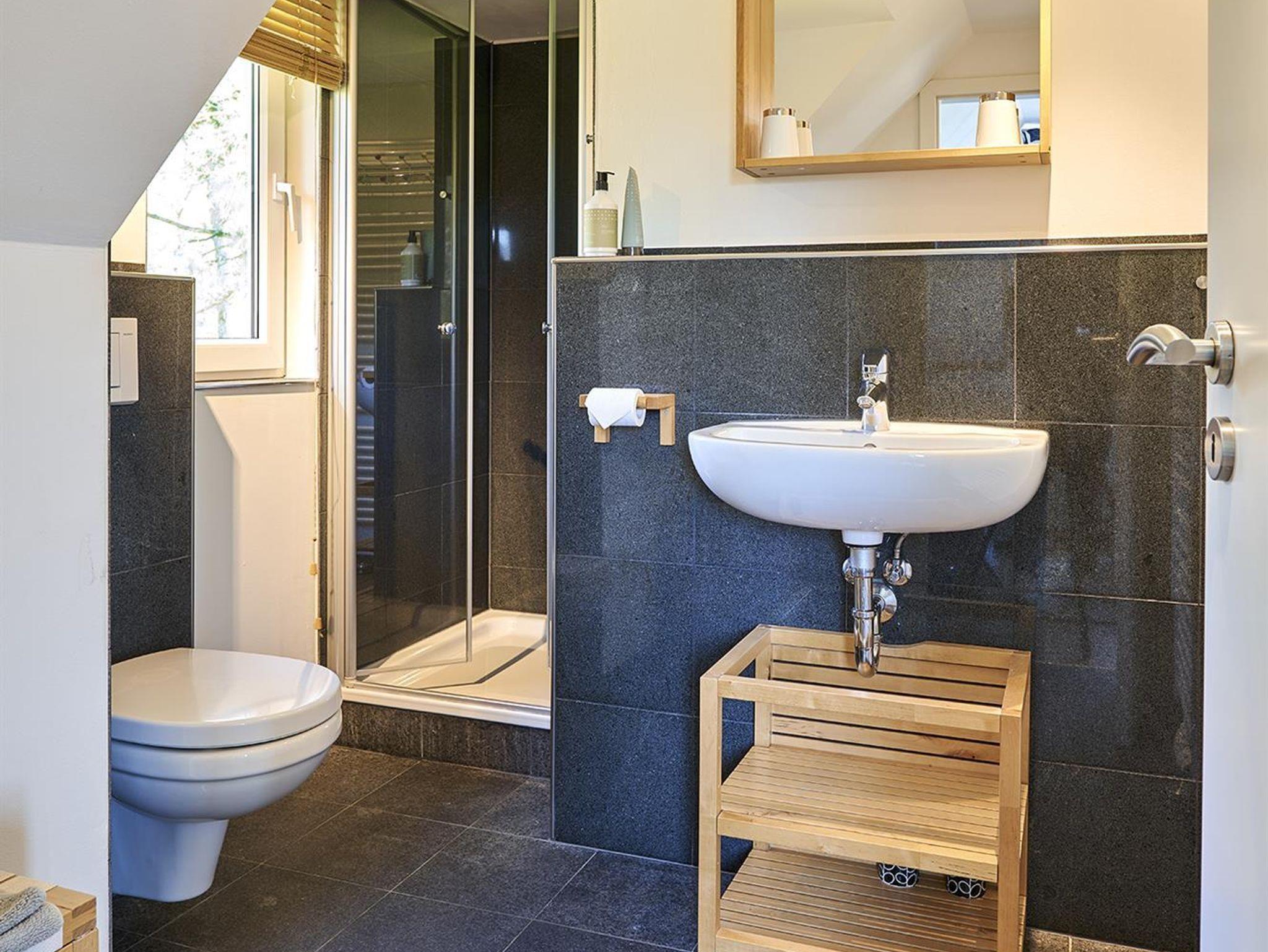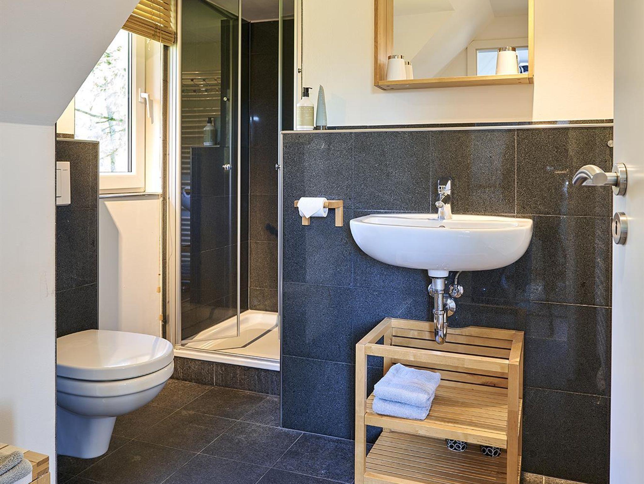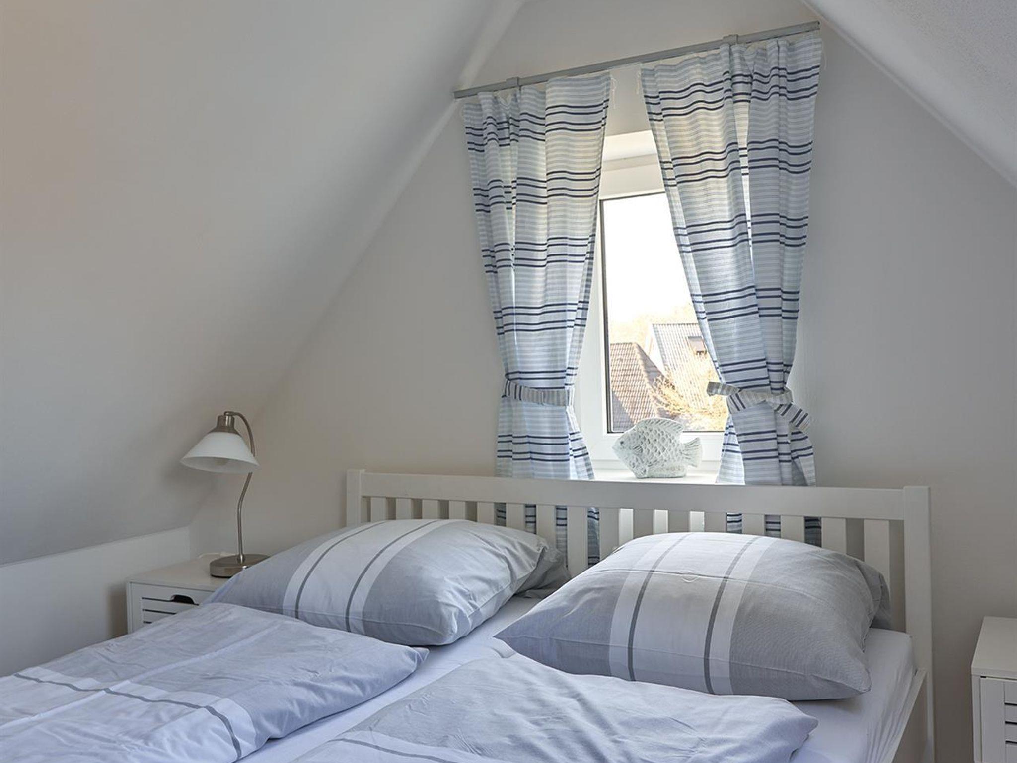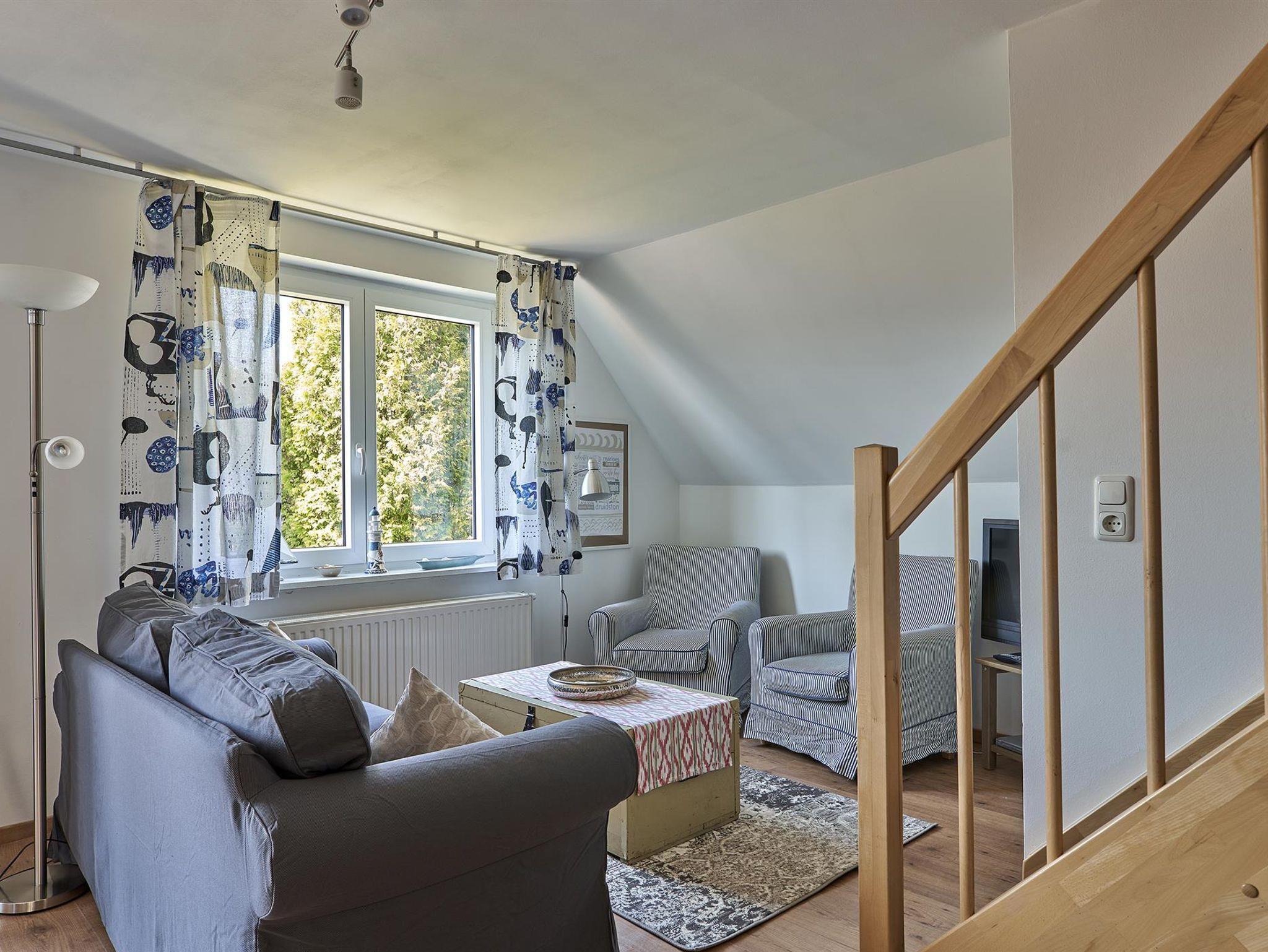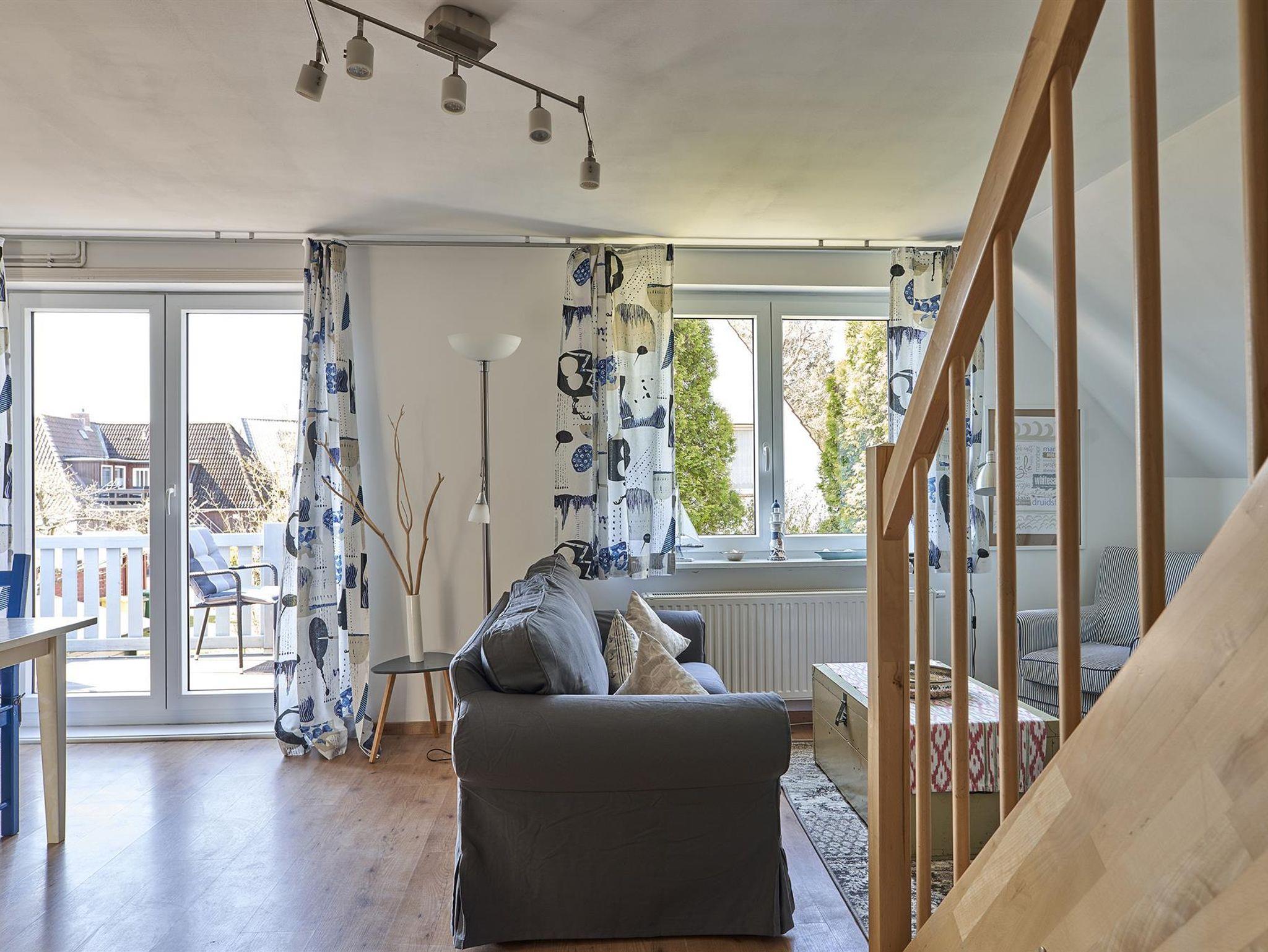 zwei gemütliche Schlafzimmer im Dachgeschoss (1 Doppelbett 1,60cm x 2,00 m, 2 Einzelbetten 0,90x2,00 m und 1,00 x 2,00m), dazwischen ein kleine Bad. Die kleine Küche ist mit Kühlschrank Herd,Backofen, Dunstabzugshaube, Mikrowelle und Geschirr, Besteck , Gläsern top- ausgestattet, Im offenen Wohn-Esszimmer haben Sie ein Smart-TV, Bücher und Spiele. Danebein liegt das moderne Badezimmer.