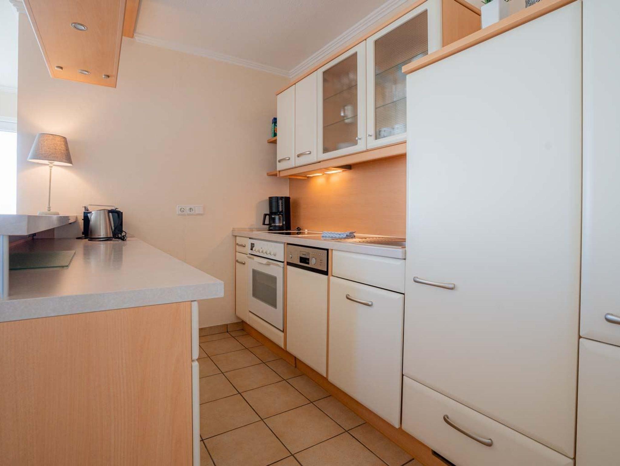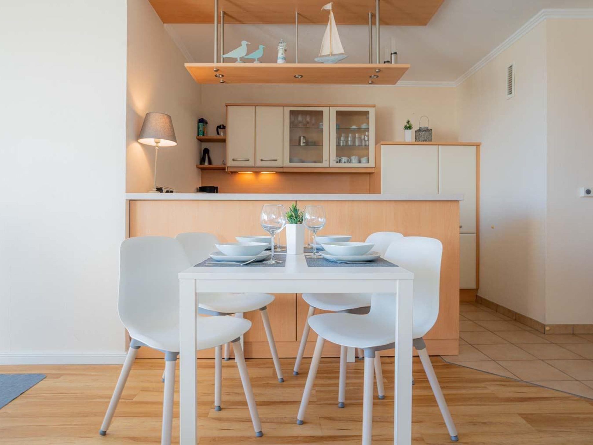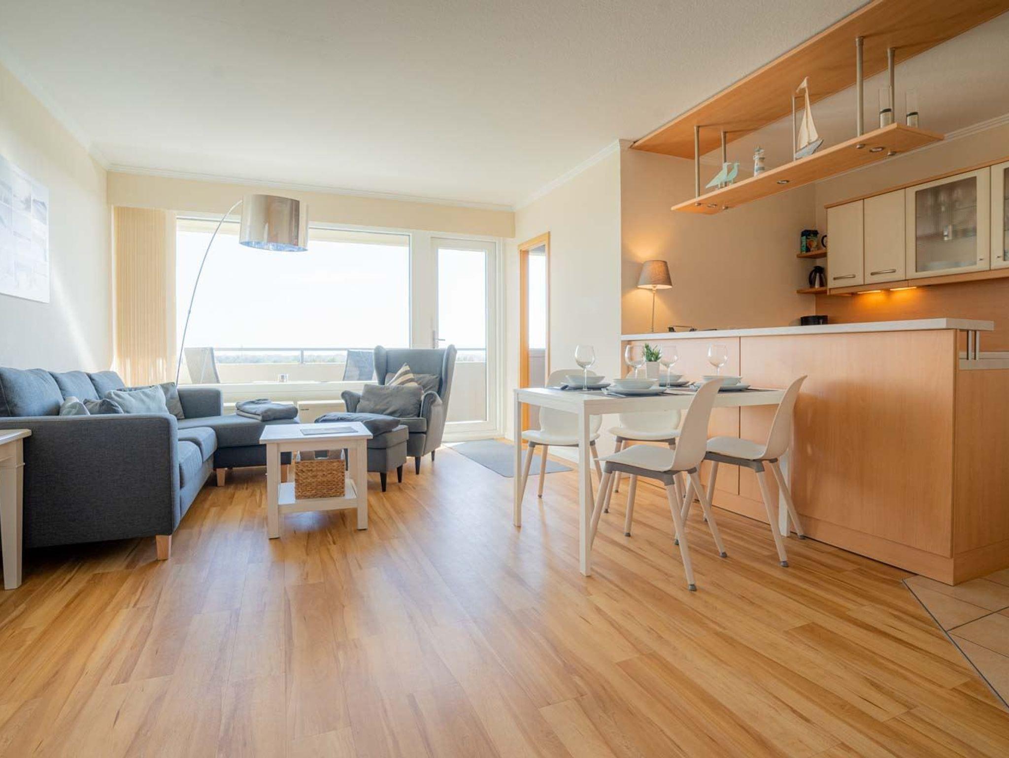 Wohnzimmer mit Sofa (2er), Entspannungssessel, TV (Sat), BluRay-Player mit Subwoofer und Esstisch mit 4 Stühlen. Direkter Zugang zum möblierten Balkon nach Südosten mit herrlichem Ausblick über die Dünen, den Deich bis zum Böhler Leuchtturm und über das Meer. Moderne offene Küche mit Backofen, Kühlschrank mit Gefrierfach, Geschirrspüler und viel Komfort.