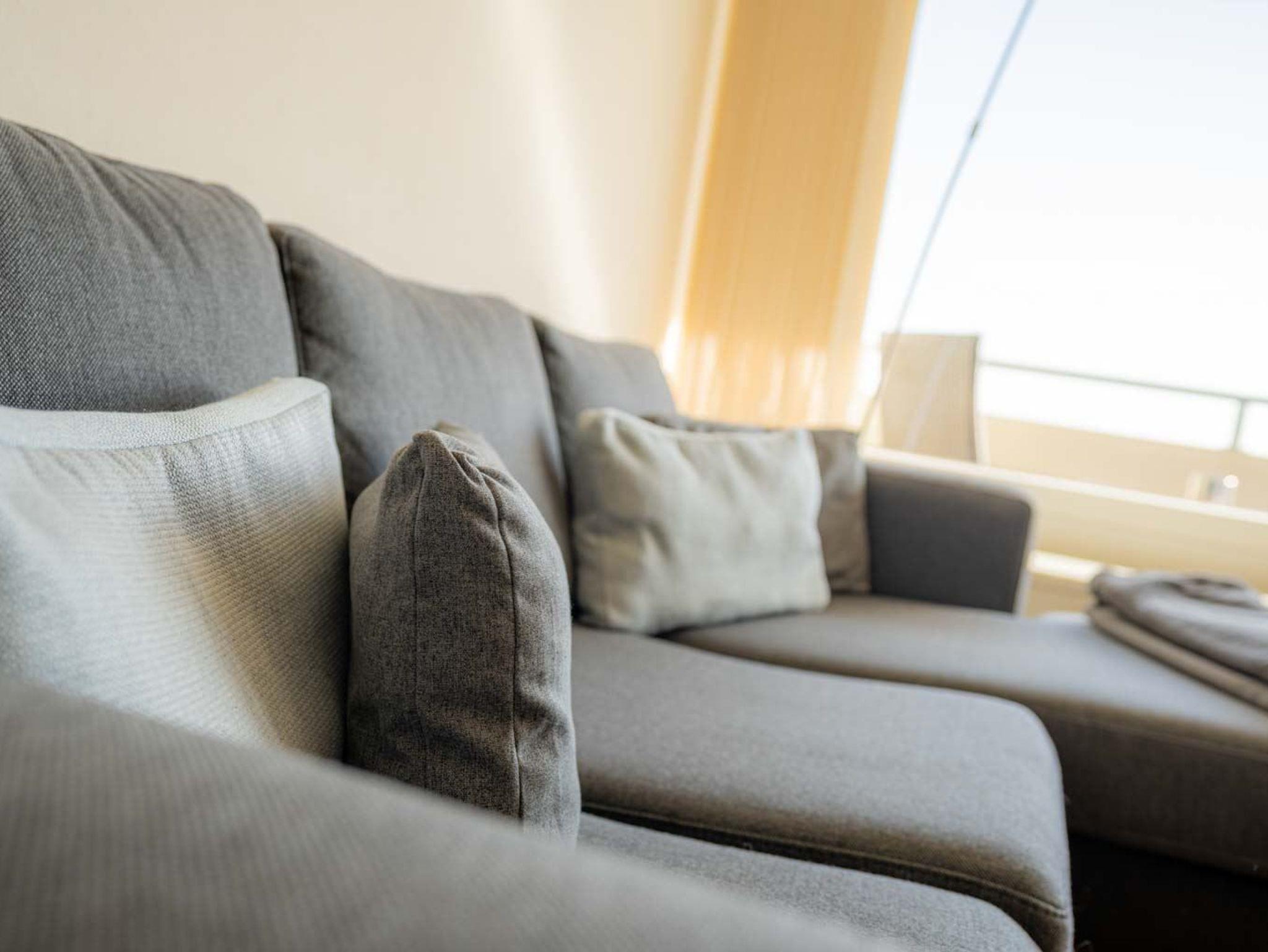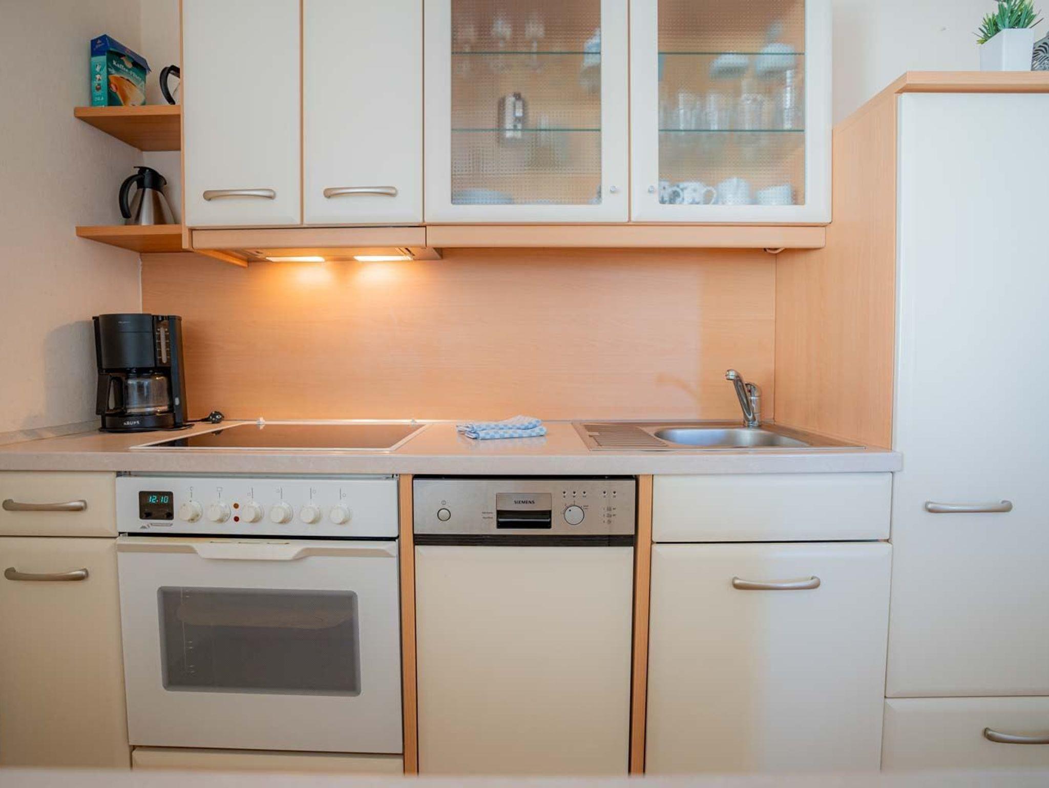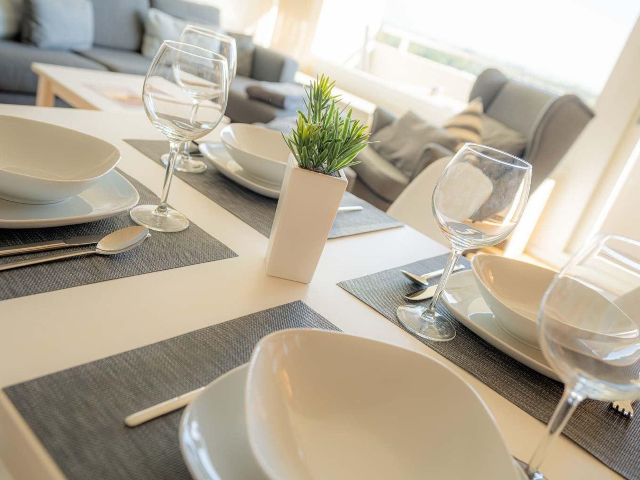 Wohnzimmer mit Sofa (2er), Entspannungssessel, TV (Sat), BluRay-Player mit Subwoofer und Esstisch mit 4 Stühlen. Direkter Zugang zum möblierten Balkon nach Südosten mit herrlichem Ausblick über die Dünen, den Deich bis zum Böhler Leuchtturm und über das Meer. Moderne offene Küche mit Backofen, Kühlschrank mit Gefrierfach, Geschirrspüler und viel Komfort.