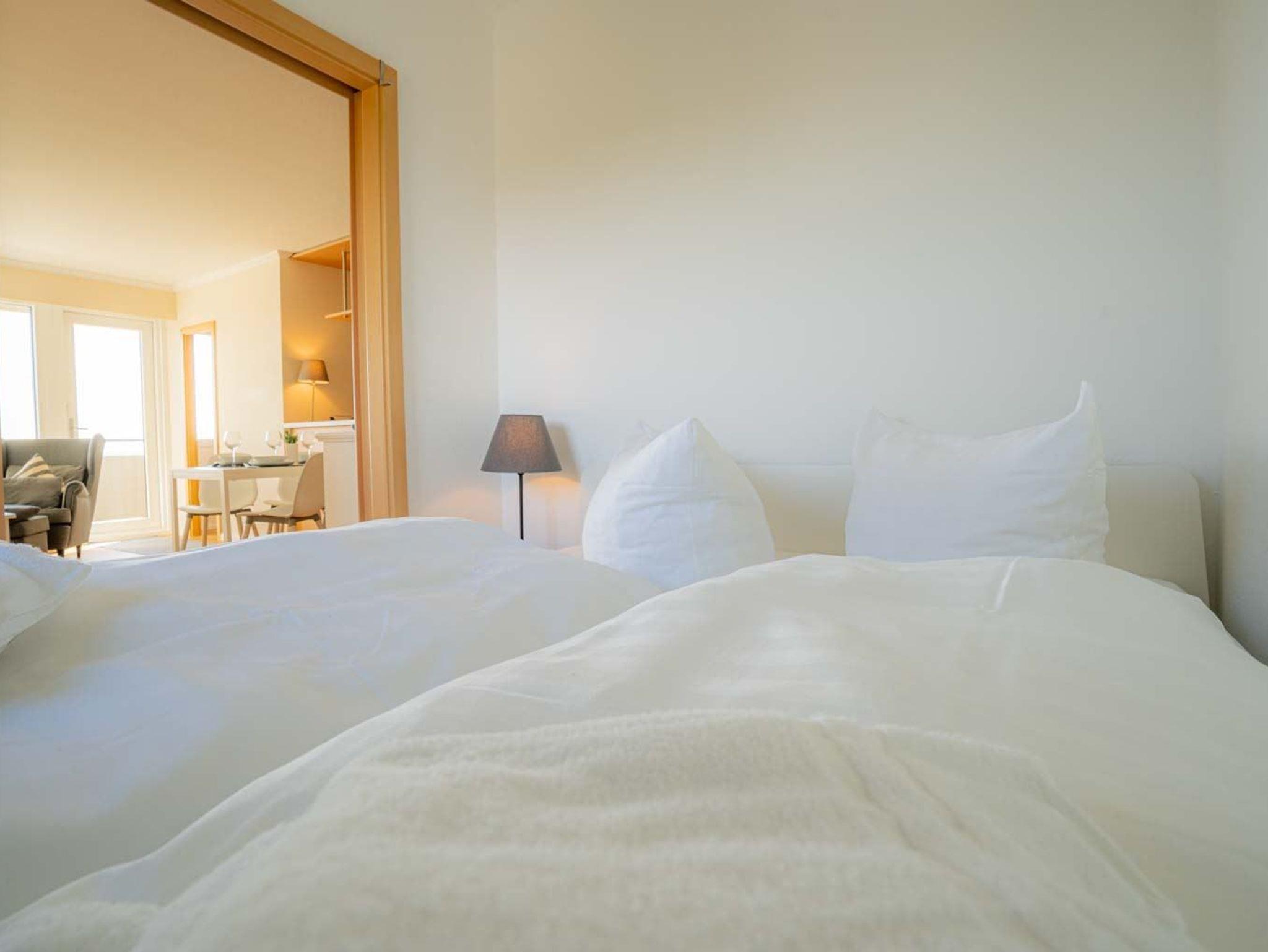 1. Schlafzimmer mit Doppelbett (160x200cm) und wunderschönem Ausblick über den Nordstrand bis zum Westerhever Leuchtturm.