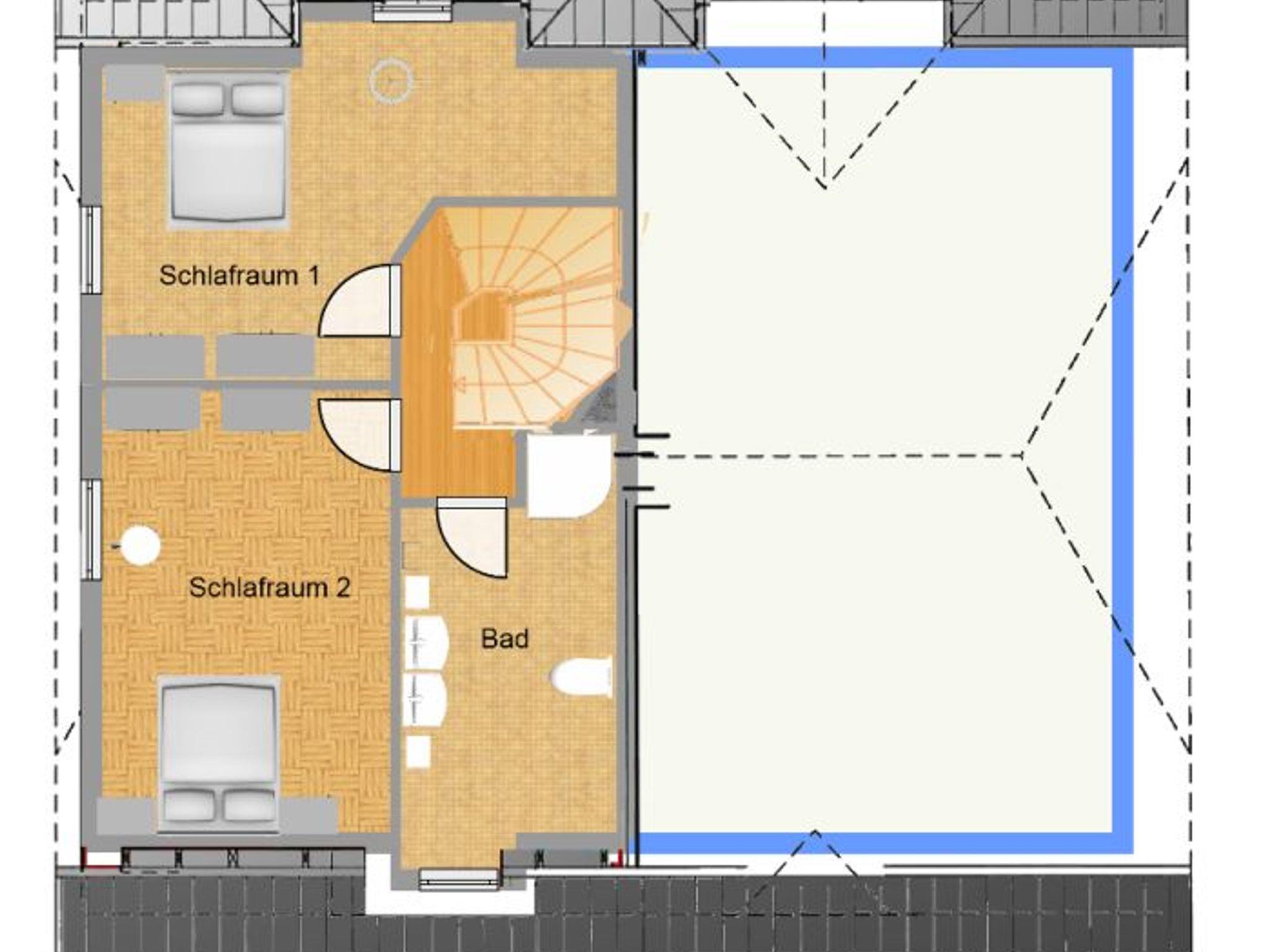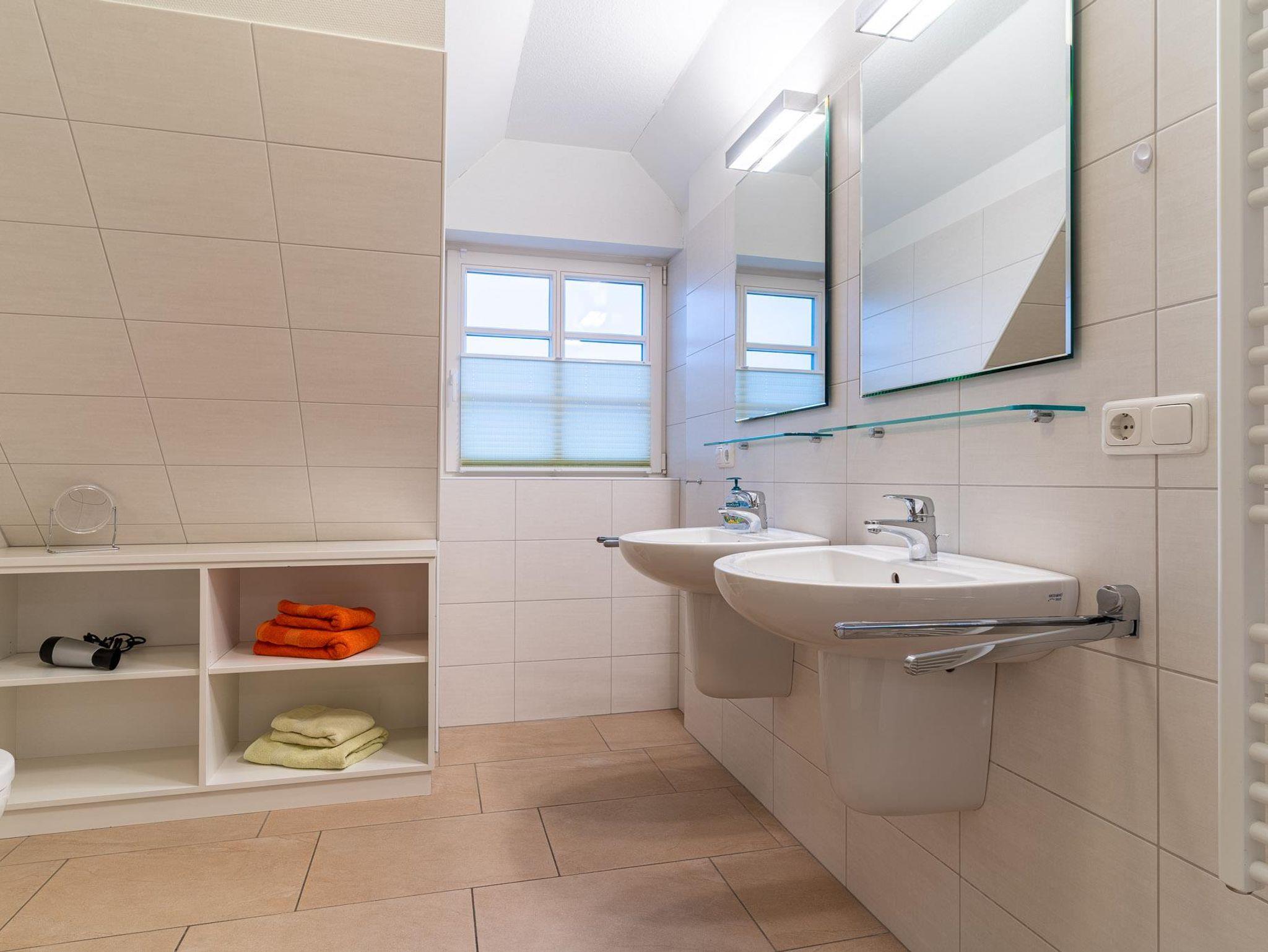 Im ersten Obergeschoß befinden sich die Räume für Träume. Das blaue Zimmer, das rote Zimmer mit zusätzlichem Flachbildschirm an der Wand und das große helle Bad mit Dusche, zwei Waschbecken und dem Handtuchtrockner.