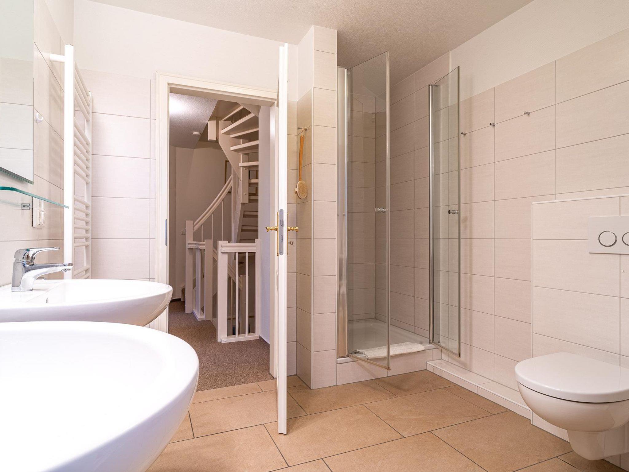Außerdem finden Sie im Erdgeschoss ein Bad mit ebenerdiger Dusche. Die Waschmaschine steht neben der Gastherme im Abstellraum.