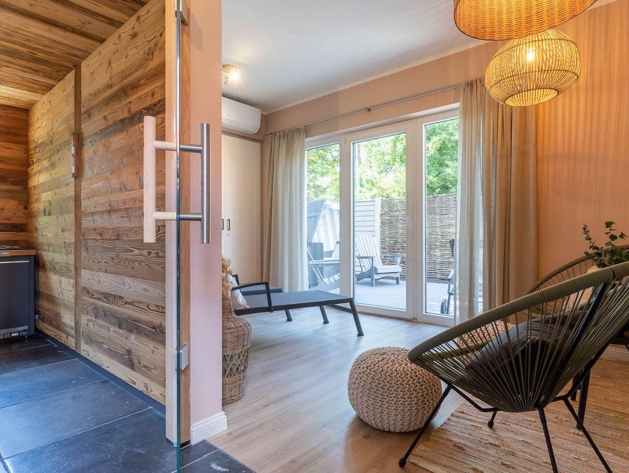 Auf dem Grundstück befindet sich eine hochwertige Außensauna mit Ruheraum für genügend Freiraum zur Erholung. Die Gemeinschaftssauna ist von allen 15 Appartements aus dem Haus nutzbar, sowie die Waschmaschinen und der Trockner im Waschraum.