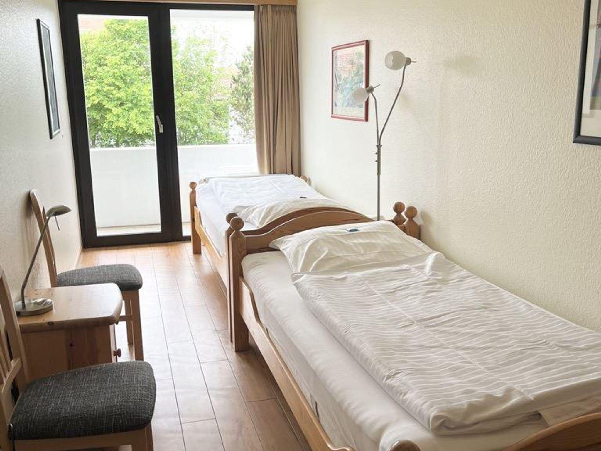 Schlafraum mit 2 Einzelbetten, Wohn-Schlafraum mit 2 Wandschrankbetten, Laminatfußboden, Sitzecke, Essecke, Küchenzeile mit Geschirrspüler und Backofen, Dusche/WC, Durchwahltelefon, Kabel-TV, Balkon, PKW-Platz-Nr.41, Aufzug, Fahrradkeller.