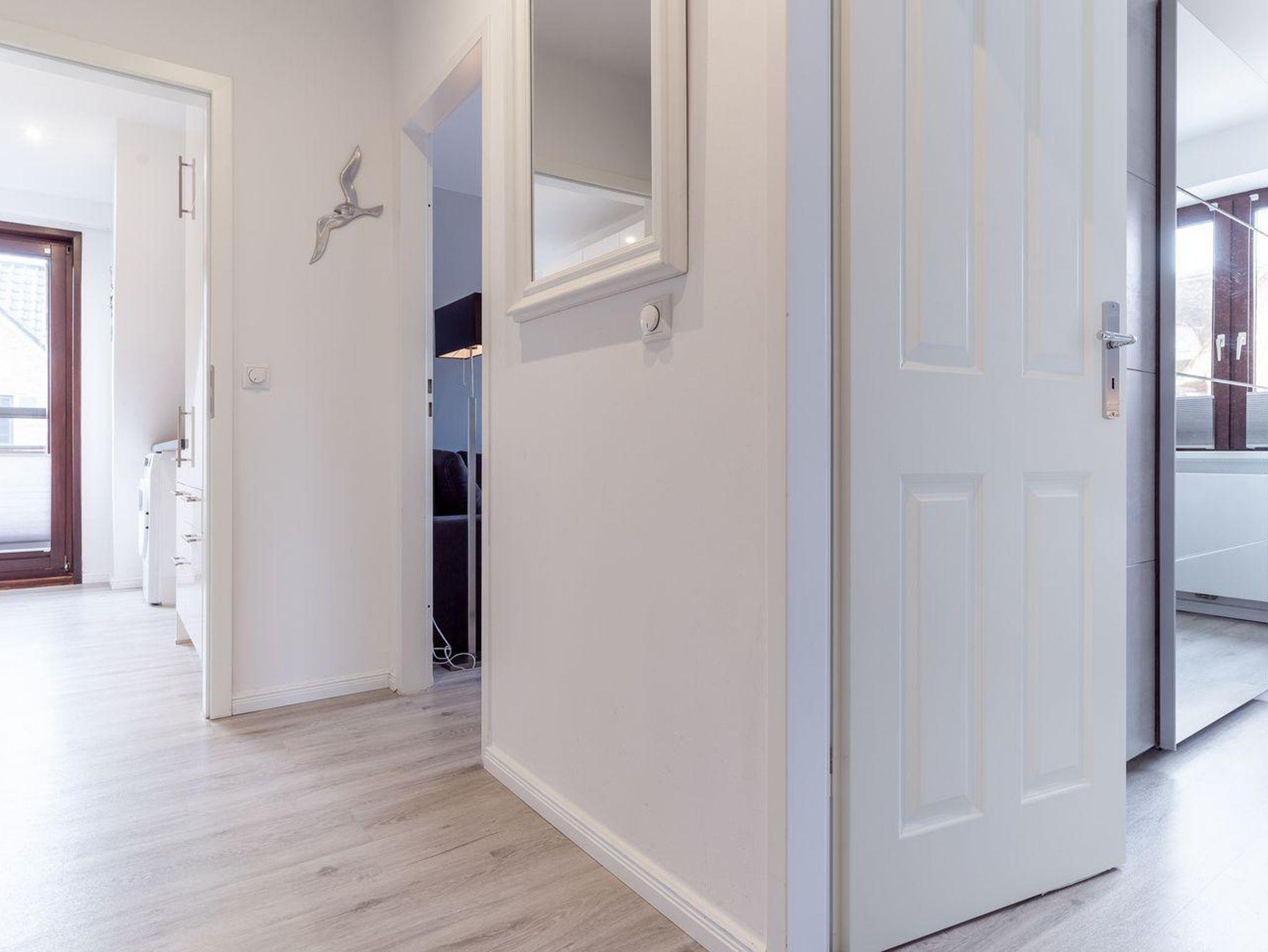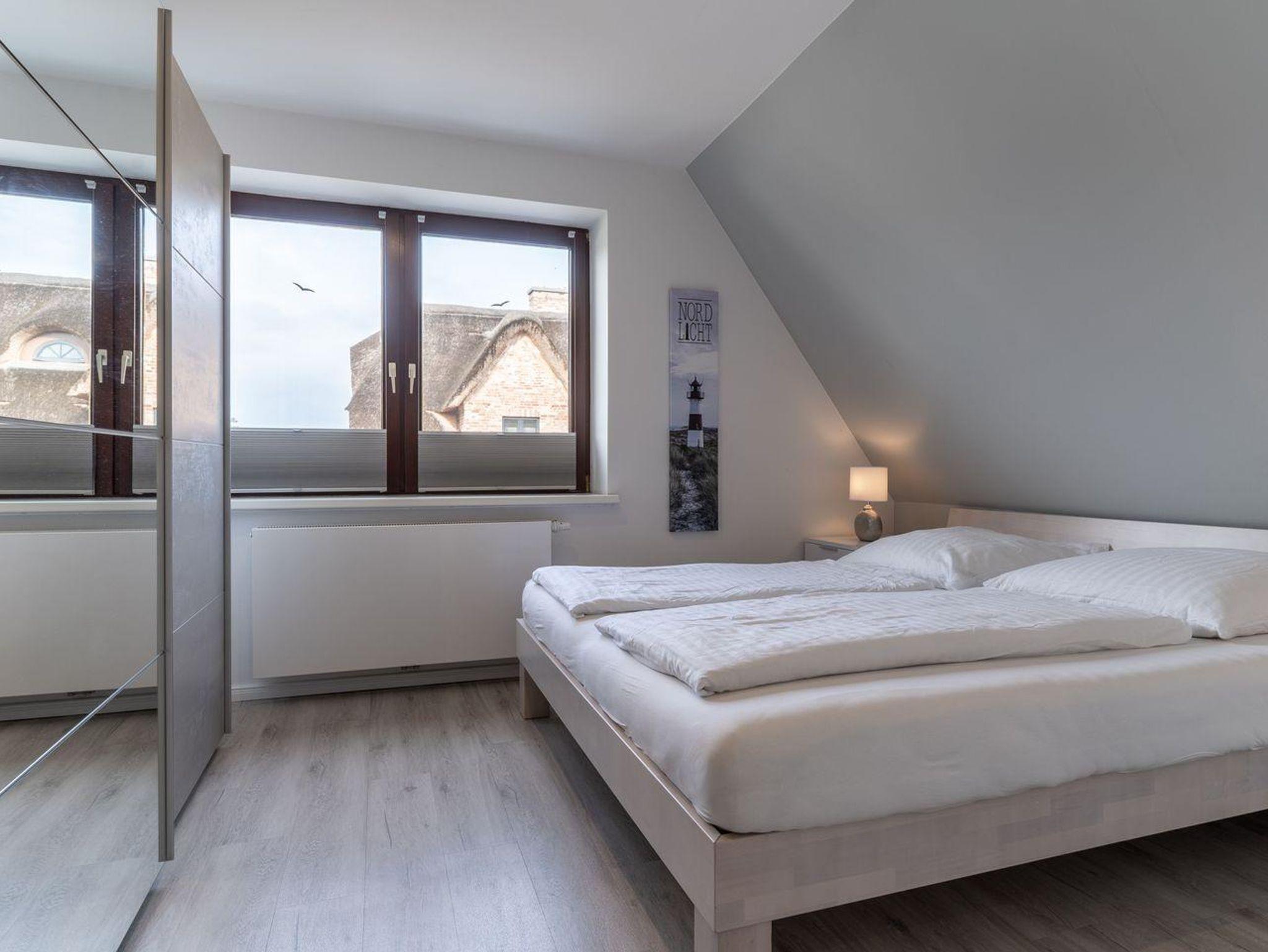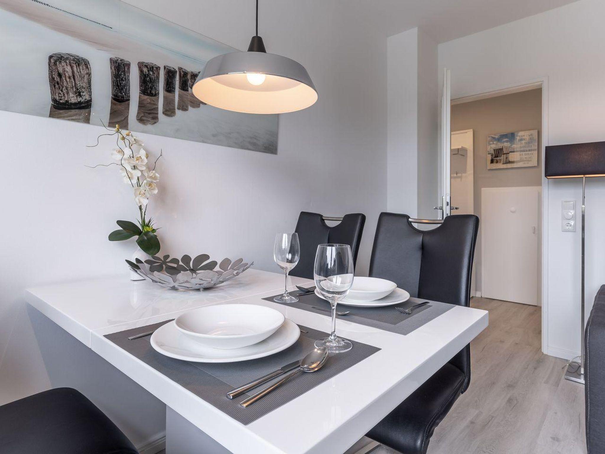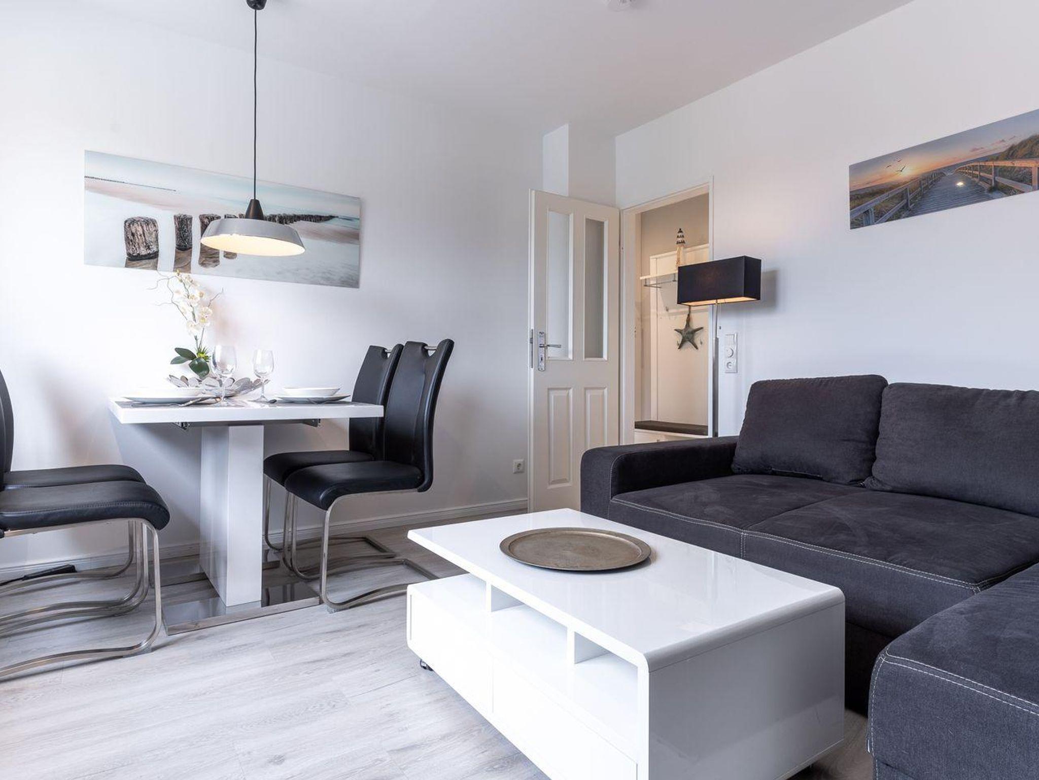 Die 45m² große Ferienwohnung welche im Jahr 2020 vollständig saniert wurde, liegt im Obergeschoss und bietet bis zu 4 Personen Platz für einen unvergesslichen Urlaub in St. Peter-Ording. Durch die Lage und Ausstattung ist die Ferienwohnung besonders familienfreundlich, Kinder sind hier herzlich willkommen. Die Ferienwohnung verfügt über einen nach Südwesten hin ausgerichteten, vollständig möblierten Balkon, der Abendsonne für ein herrliches Beisammensein bietet. Auch Urlaub mit Hund in St. Peter-Ording ist hier möglich. Das moderne Wohnzimmer ist hell und freundlich gestaltet. Zur Ausstattung gehören eine komfortable Couch und der große Esstisch, an dem die ganze Familie Platz findet. Die Couch lässt sich zum komfortablen Schlafplatz für 2 Personen umfunktionieren. Für die multimediale Unterhaltung sorgen ein großer Flachbild-TV, Radio mit Bluetooth und kostenfreies W-LAN. Für die Versorgung im Urlaub sorgt die vollumfassend ausgestattete, angrenzende Küche der Ferienwohnung. Hier stehen neben Cerankochfeld und Backofen noch Kühlschrank, Mikrowelle und Nespresso-Maschine bereit. Ein Waschtrockner steht für Gäste kostenfrei zur Verfügung. Orangenpresse und Milchaufschäumer gehören ebenfalls zum Inventar. Im hellen, einladenden Schlafzimmer steht ein komfortables 170x200cm Doppelbett zur Verfügung. Zur edlen Ferienwohnung gehören weiterhin Duschbad mit WC und Haartrockner. Die meisten Fenster der Ferienwohnung sind mit Fliegenschutzgitter und Verdunklungsplissees ausgestattet. Die große Fensterfront ist mit elektrischem Außenrollo ausgestattet, um Licht und Sichtschutz nach Belieben regulieren zu können.