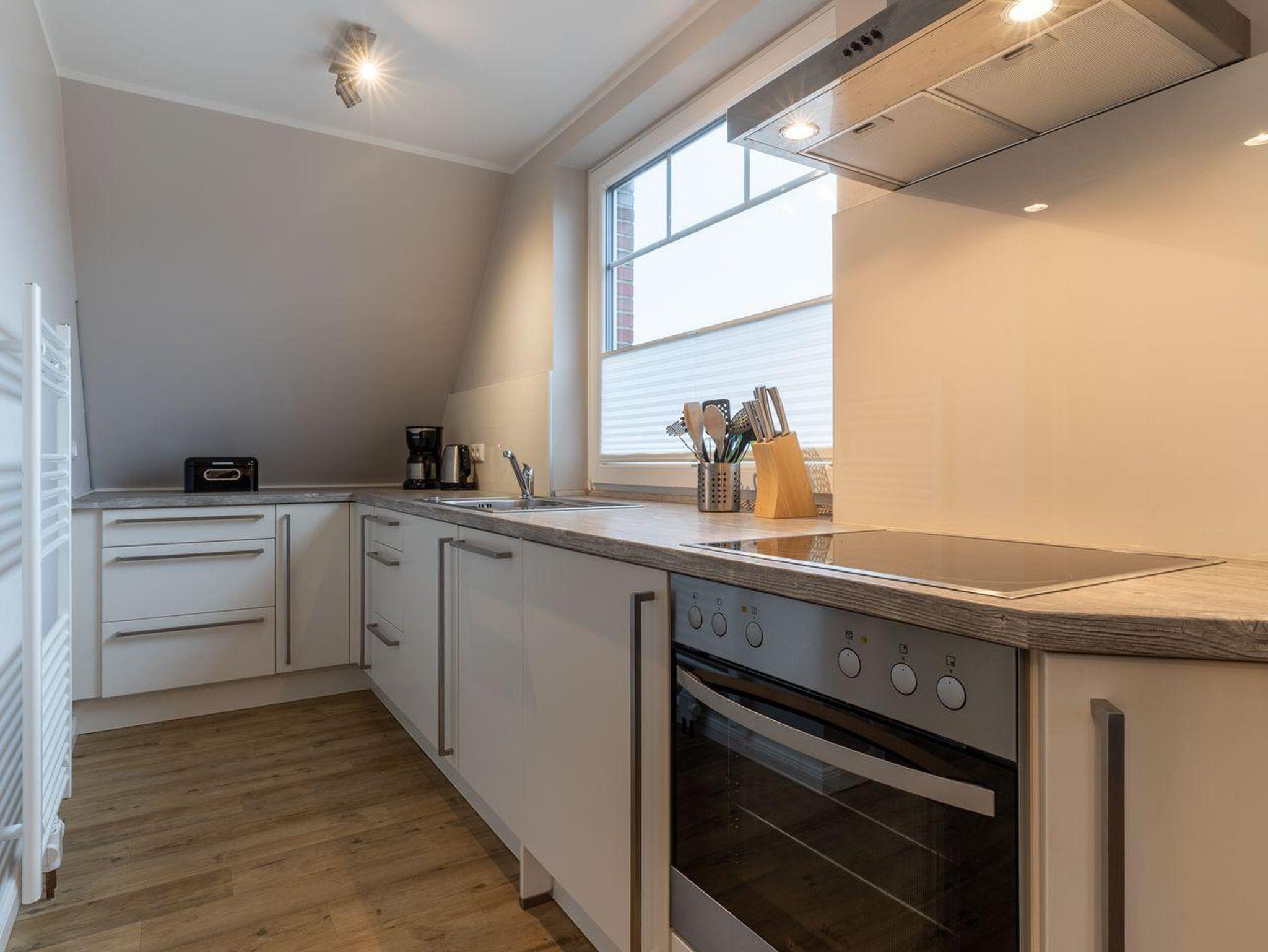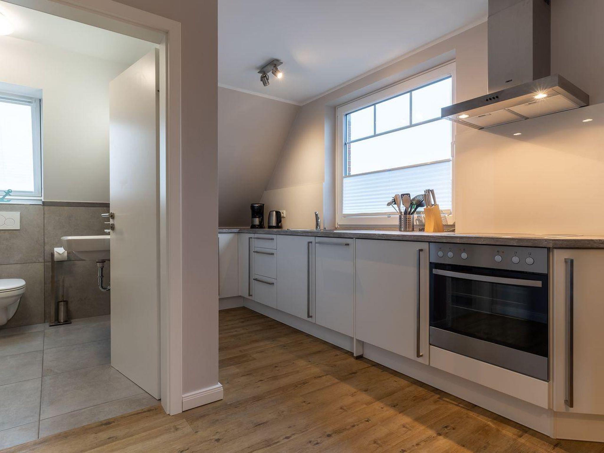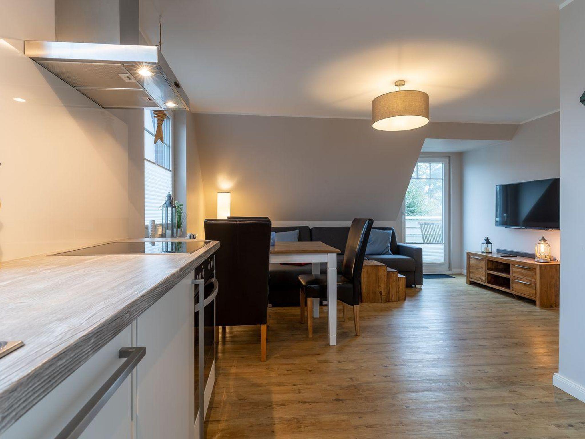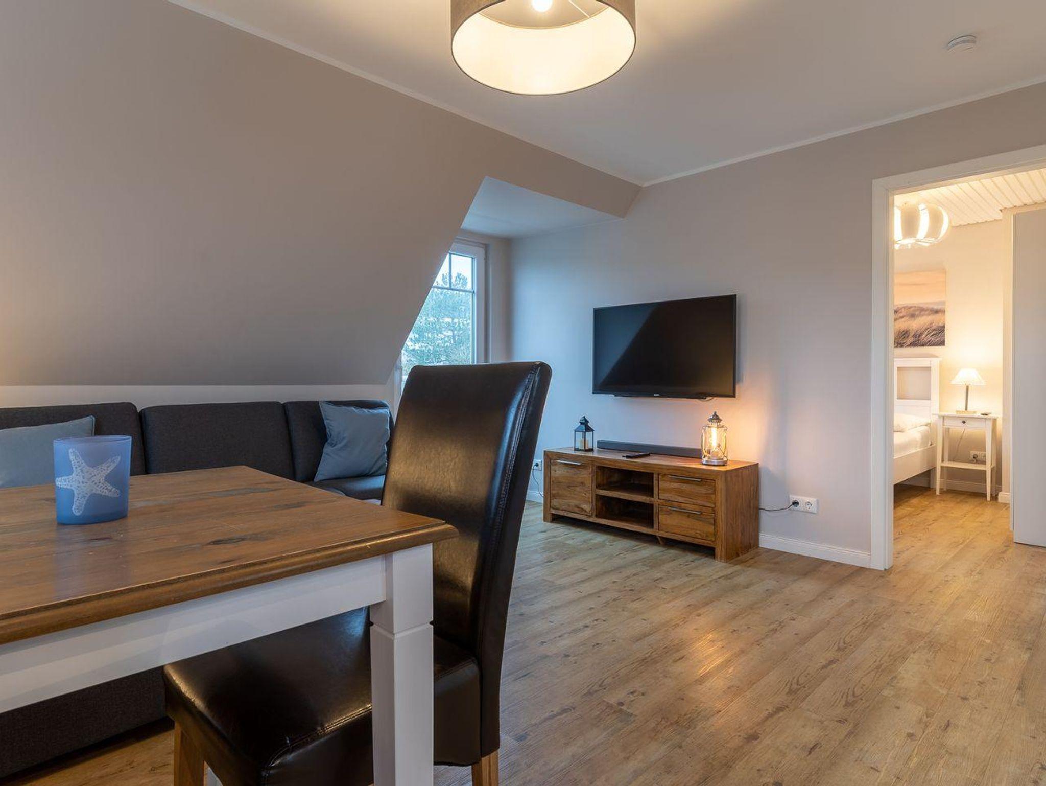 Das App. Dorf im Ferienhaus Rückenwind verfügt über ca. 45 m² Wohnfläche und bietet Platz für 1-3 Personen. Die Wohnung befindet sich im Obergeschoss mit einem großzügige Wohnraum mit TV und einer modernen Wohnküche. Die Wohnräume sind mit neuen und modernen Möbeln ausgestattet. An den Wohnbereich schließen sich ein Duschbad, sowie ein Schlafzimmer mit einem Doppelbett (1,80 x 2,00 m) an. Zusätzlich gibt es im Wohnzimmer ein gemütliches Schlafsofa (1,40 x 2,00 m) für eine Personen. Vom Wohnzimmer gelangen Sie auf einen gemütlichen Balkon (Richtung Nord-West).