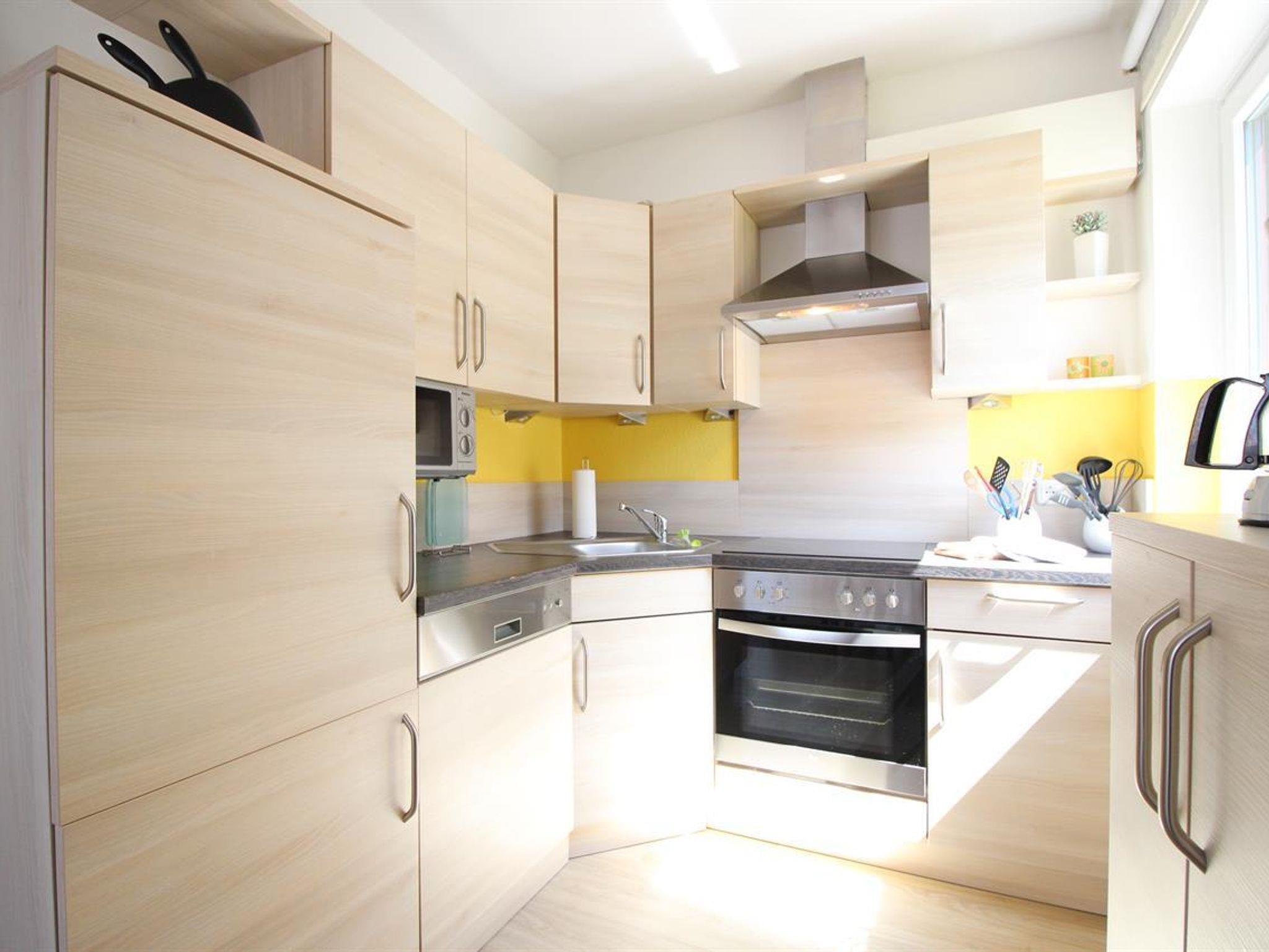 Die Einbauküche ist komplett mit 4 Plattenherd, Backofen, Geschirrspülmaschine, Mikrowelle und vielem mehr ausgestattet.
