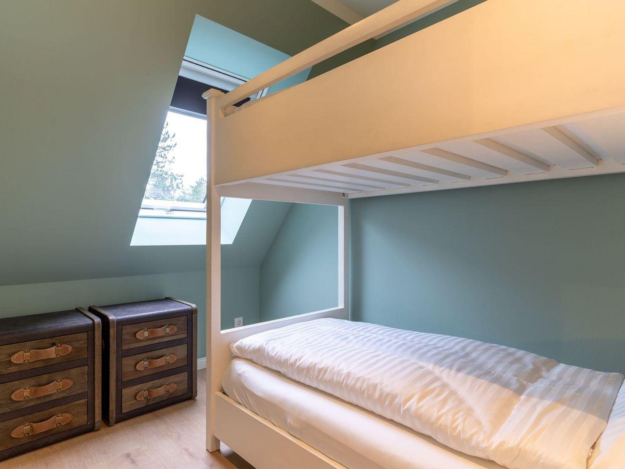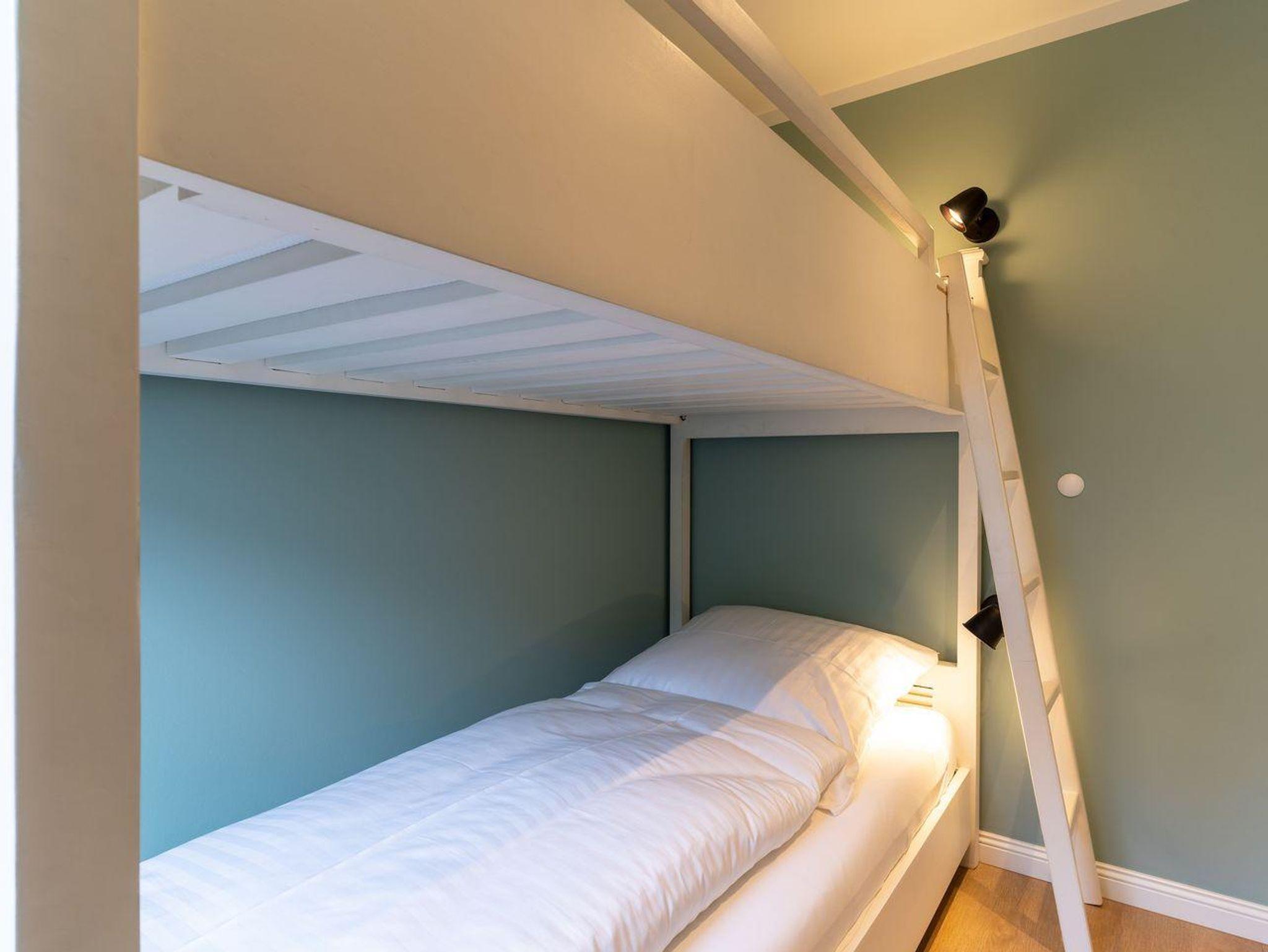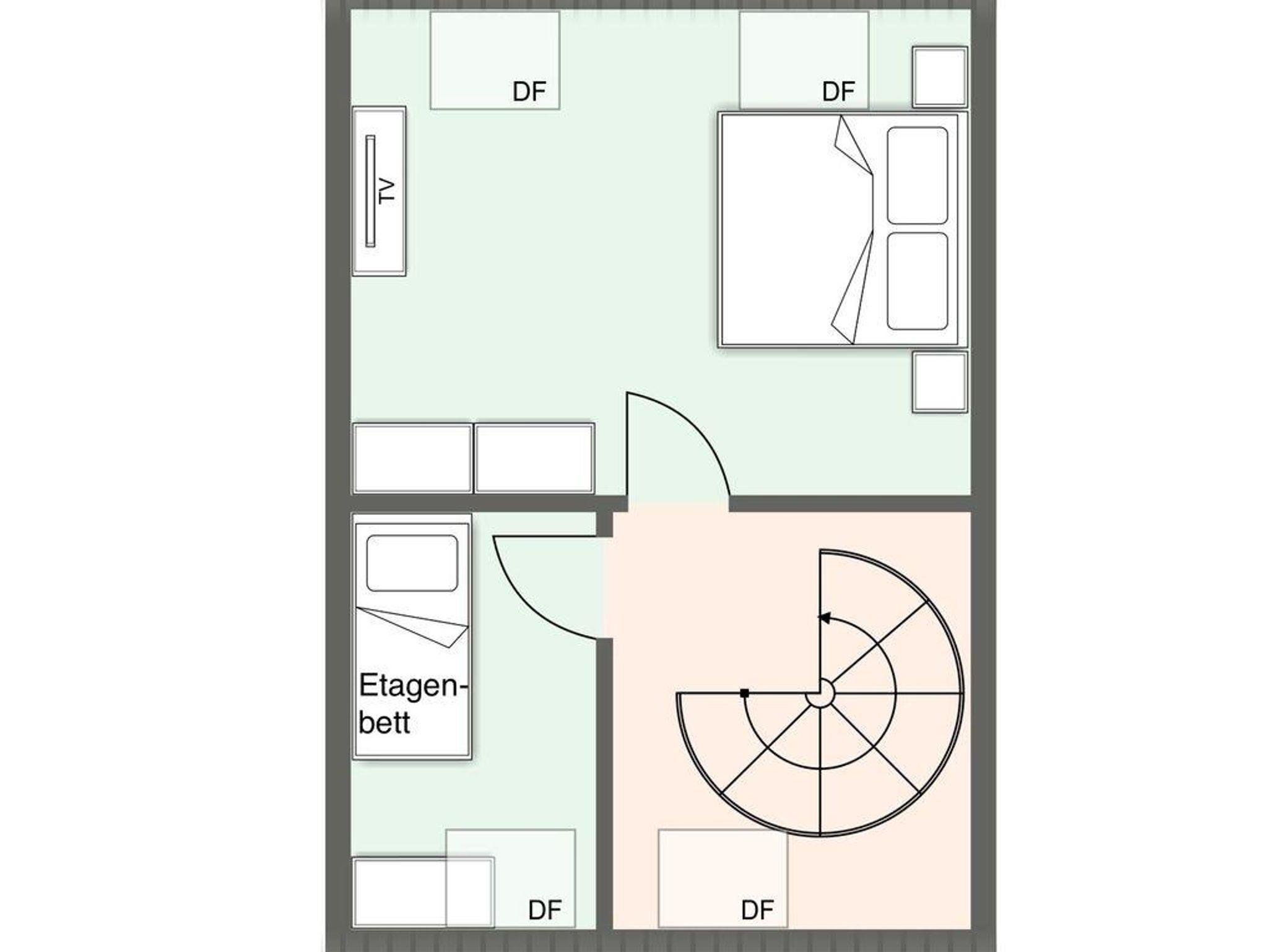 Über eine Wendeltreppe aus dem Wohnraum gelangt man in das Obergeschoss. Hier befinden sich zwei gemütliche Schlafzimmer, eines mit einem Doppelbett und eines mit einem Etagenbett.