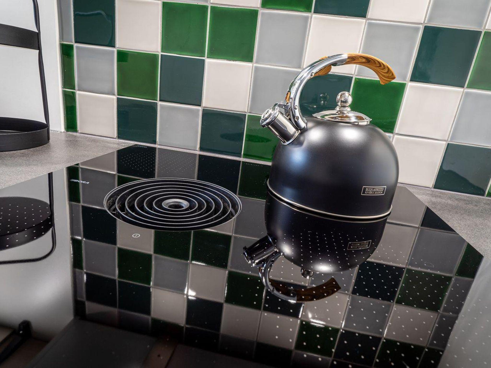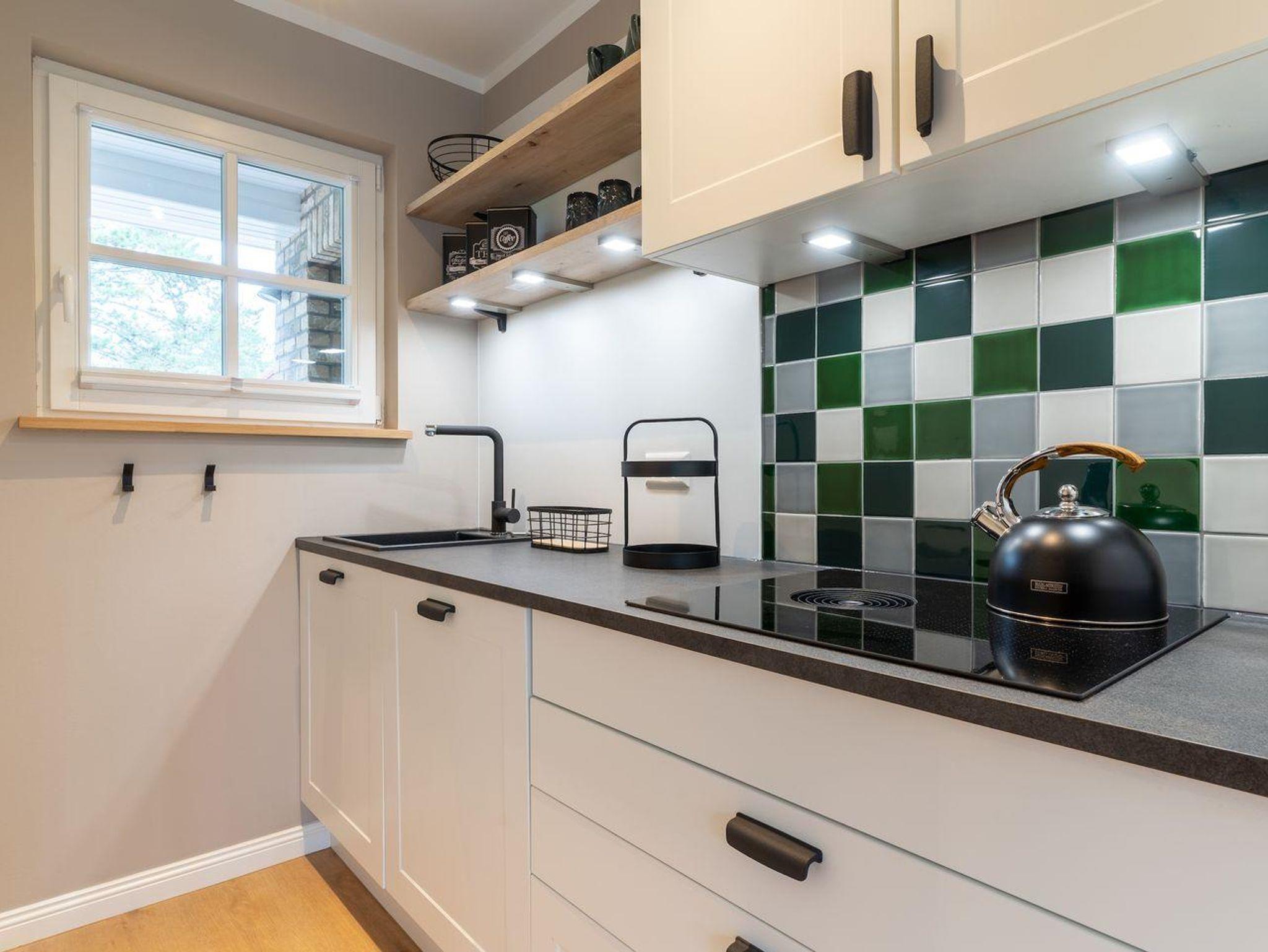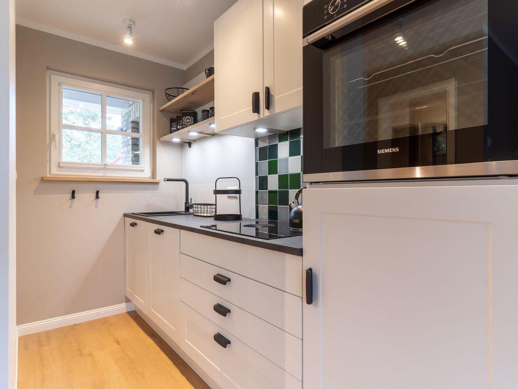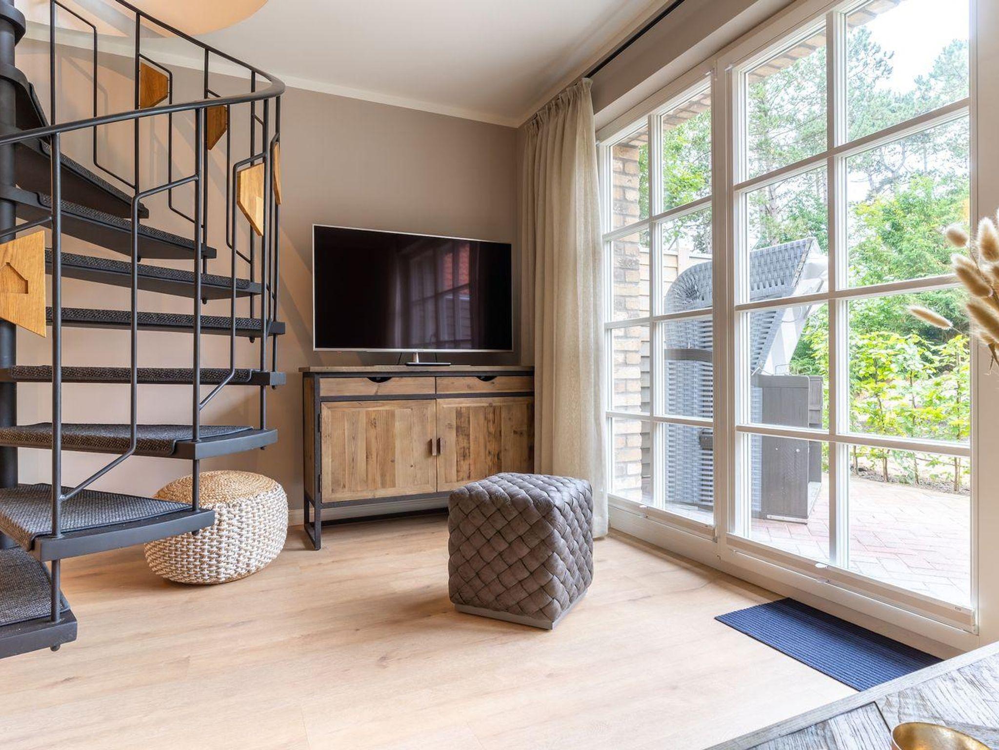 Im Erdgeschoss befindet sich ein großzügiger Wohnraum mit TV und einer modernen Wohnküche. Die Küche ist voll ausgestattet und verfügt über hochwertige Elektrogeräte.